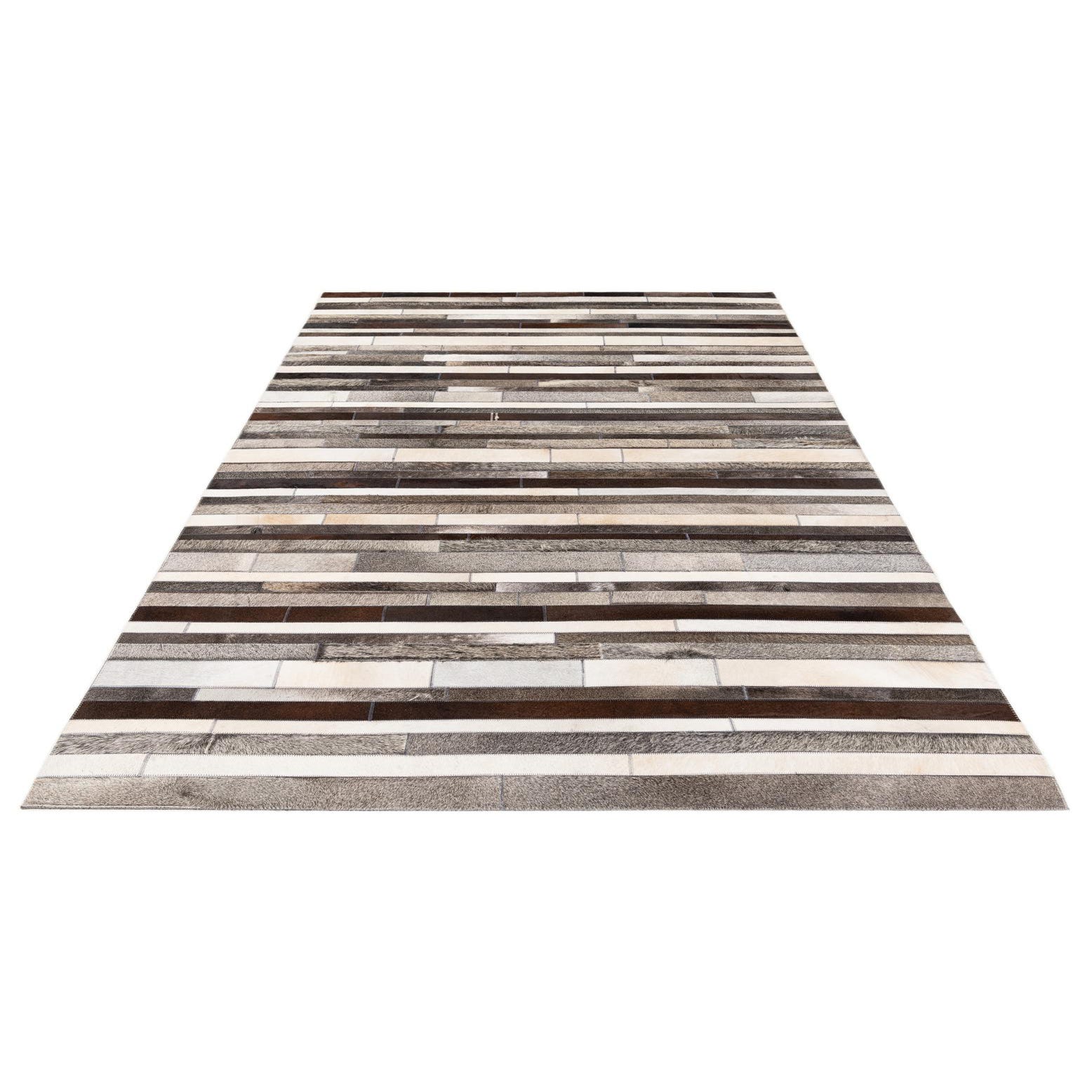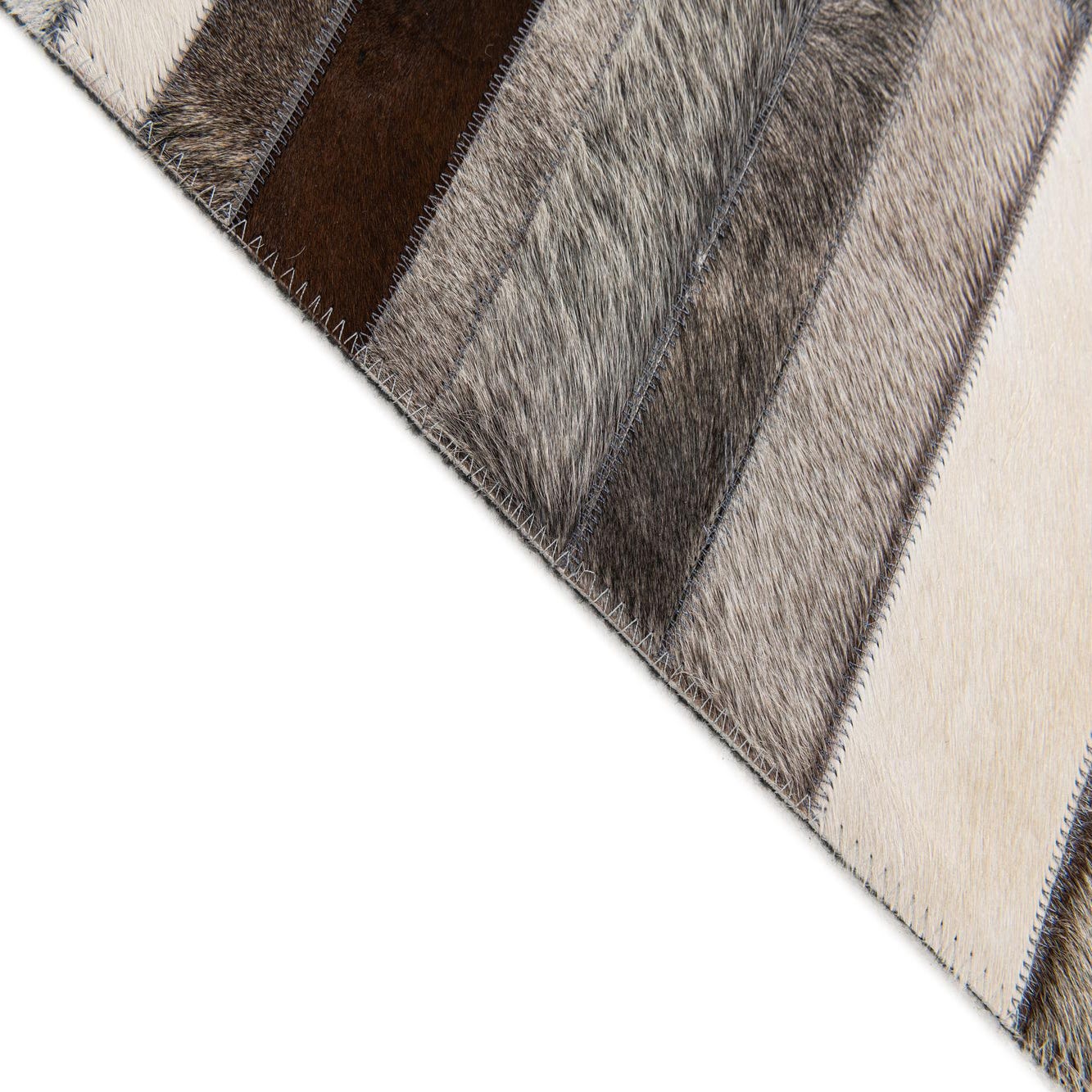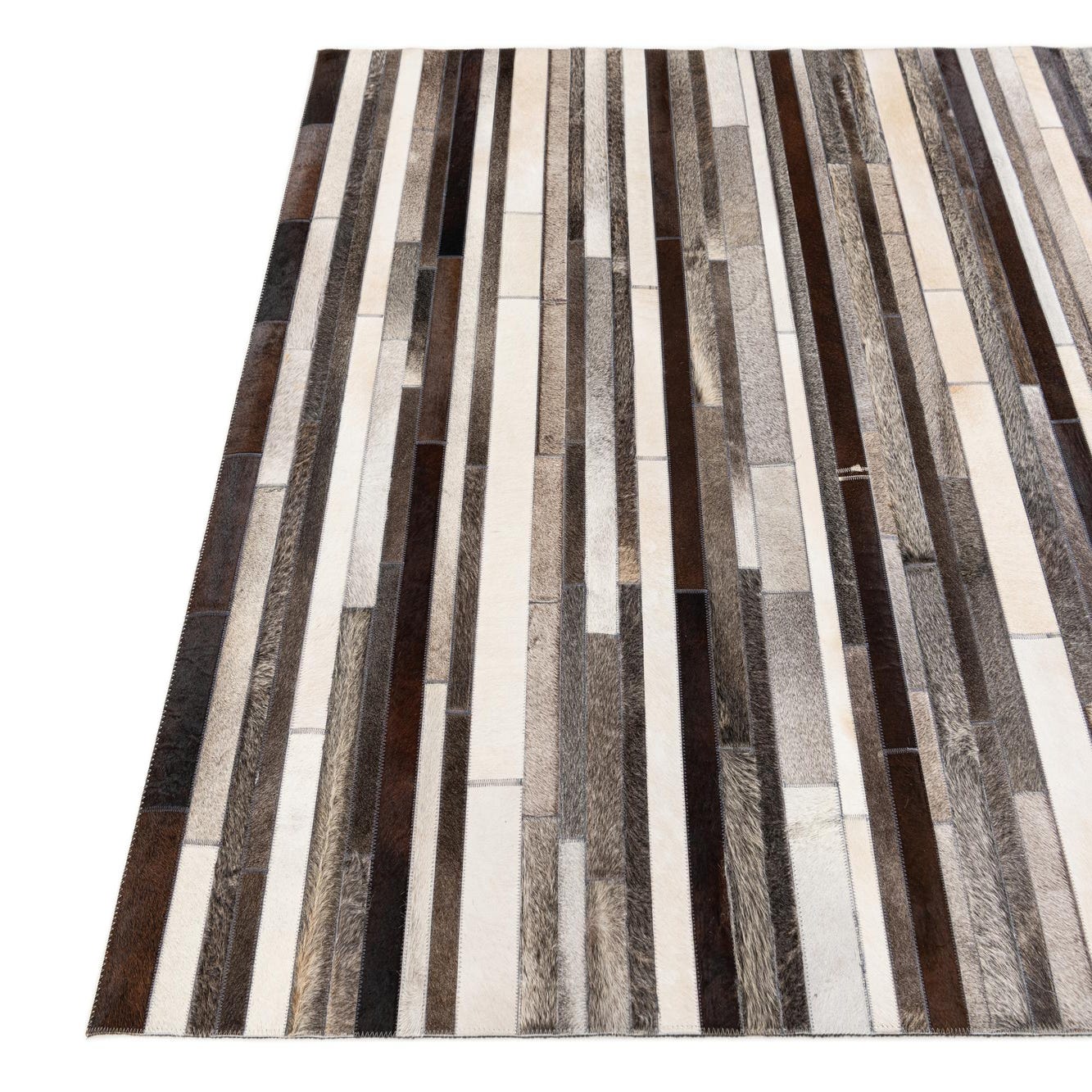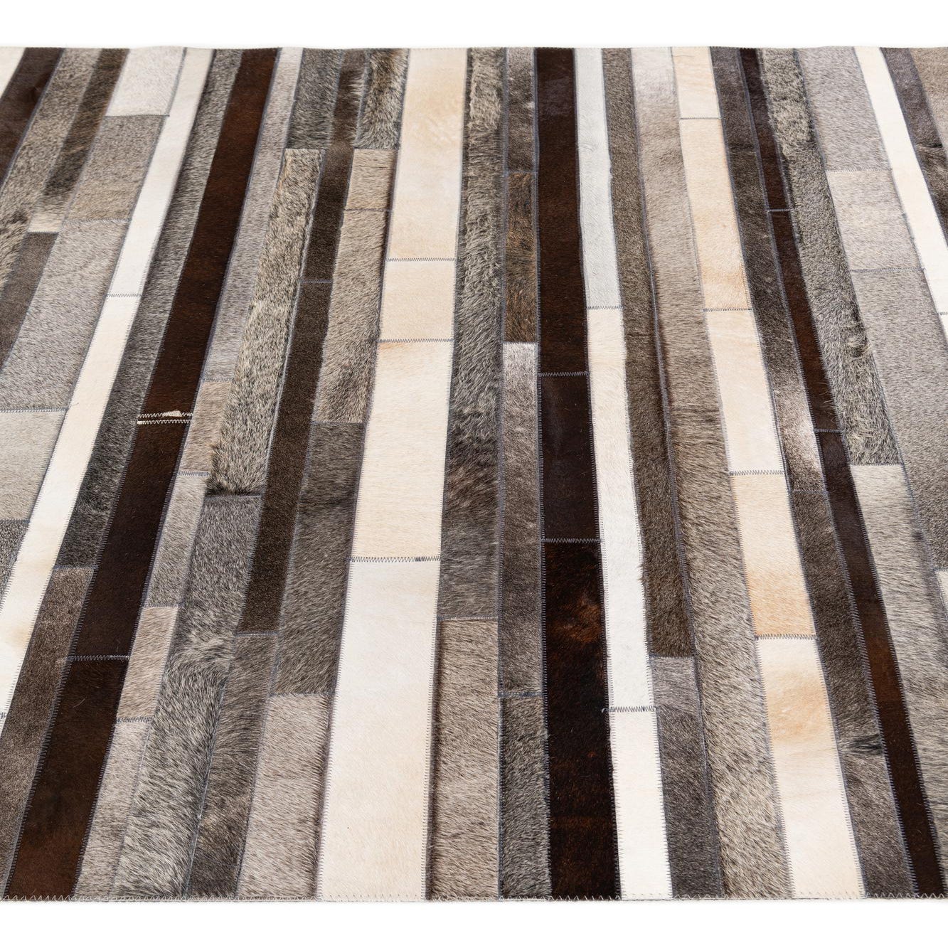 Long, narrow strips of cowhide are stitched together to form a linear patchwork that reads modern and organic at once. The background is multi and the palette moves through beige, black, brown, gray and ivory in varied widths and finishes, creating subtle contrast and visual rhythm. Hand Made of Cowhide & Leather, the surface offers the soft, tactile feel of hair-on-hide with a low profile and visible seam lines that add structure and texture when you run your hand across it.