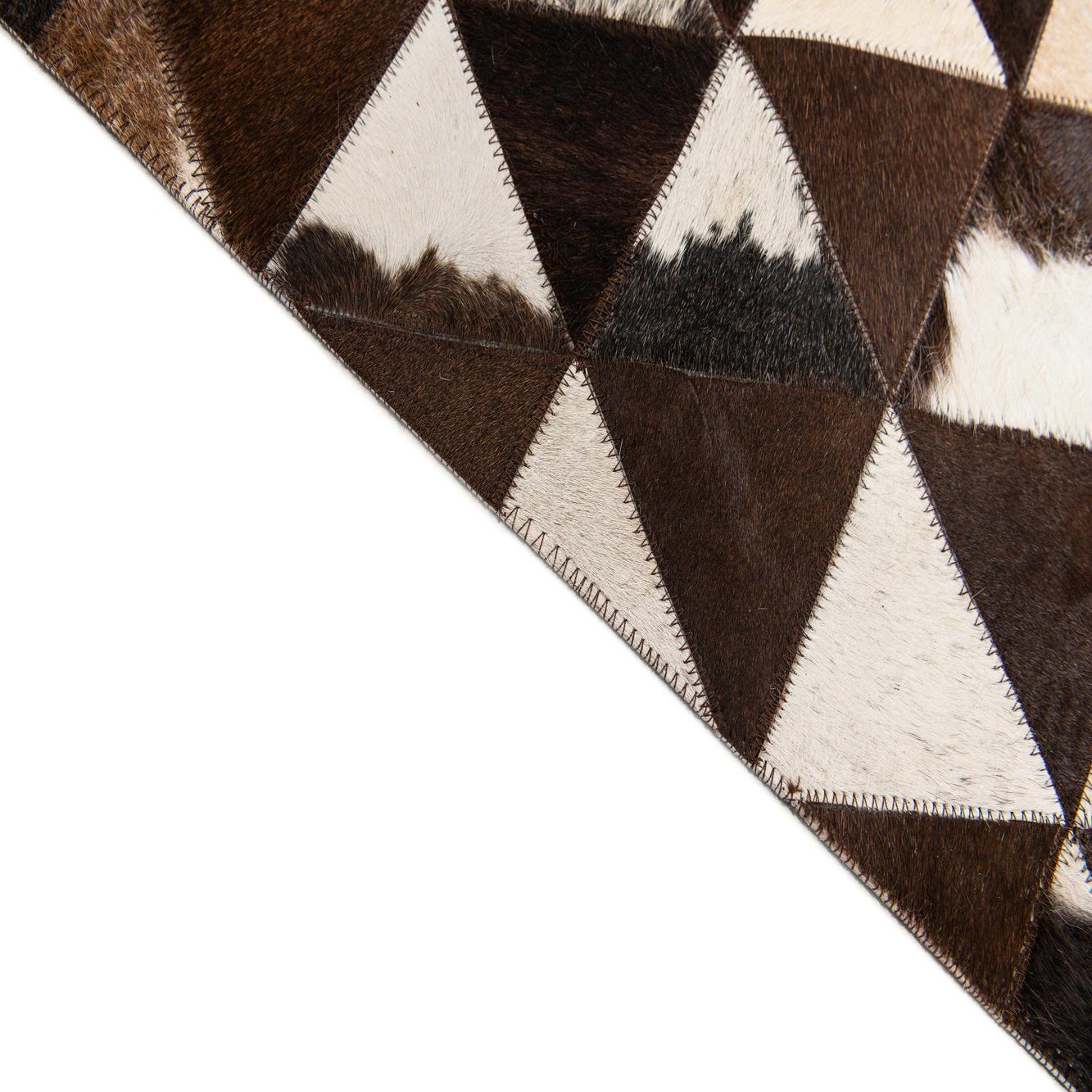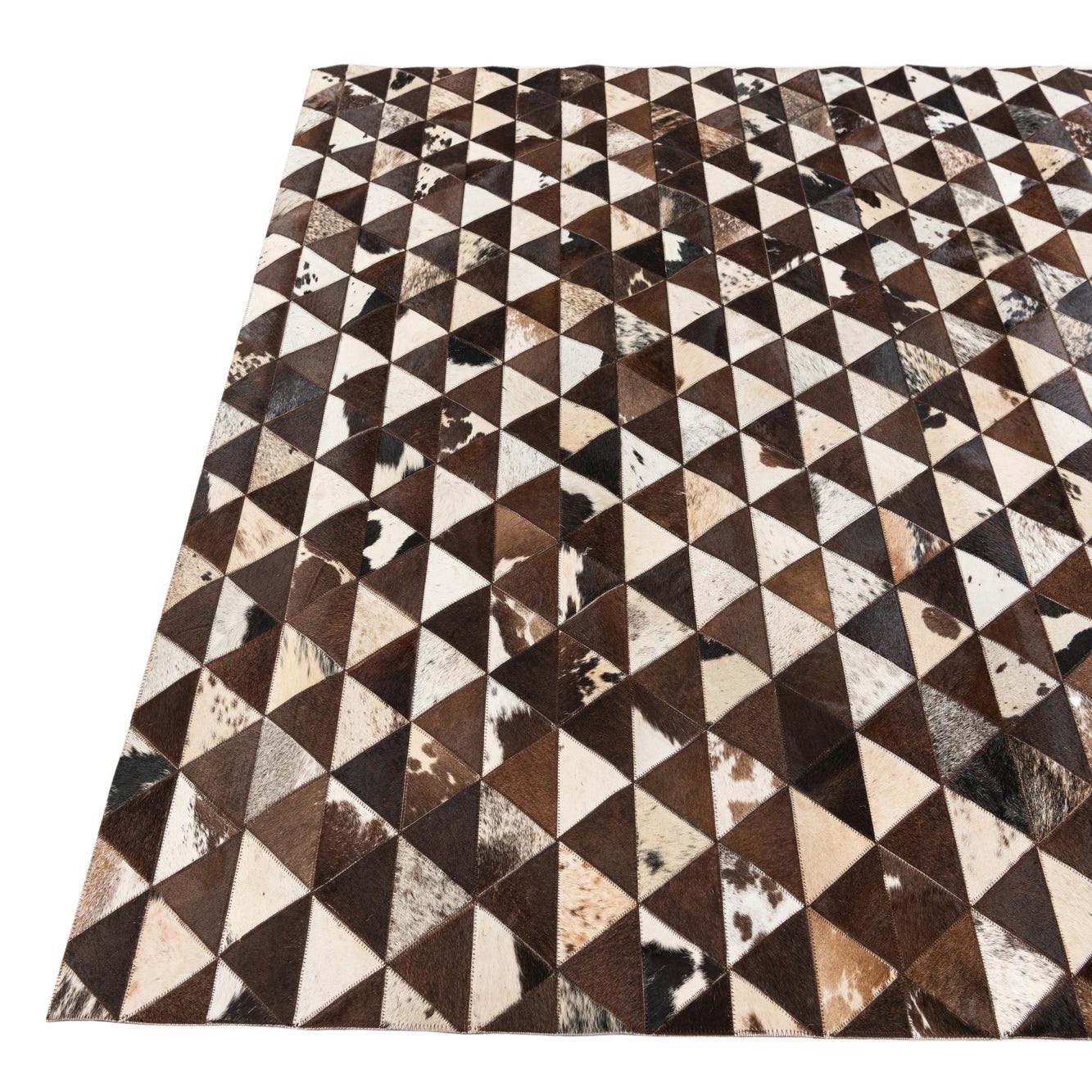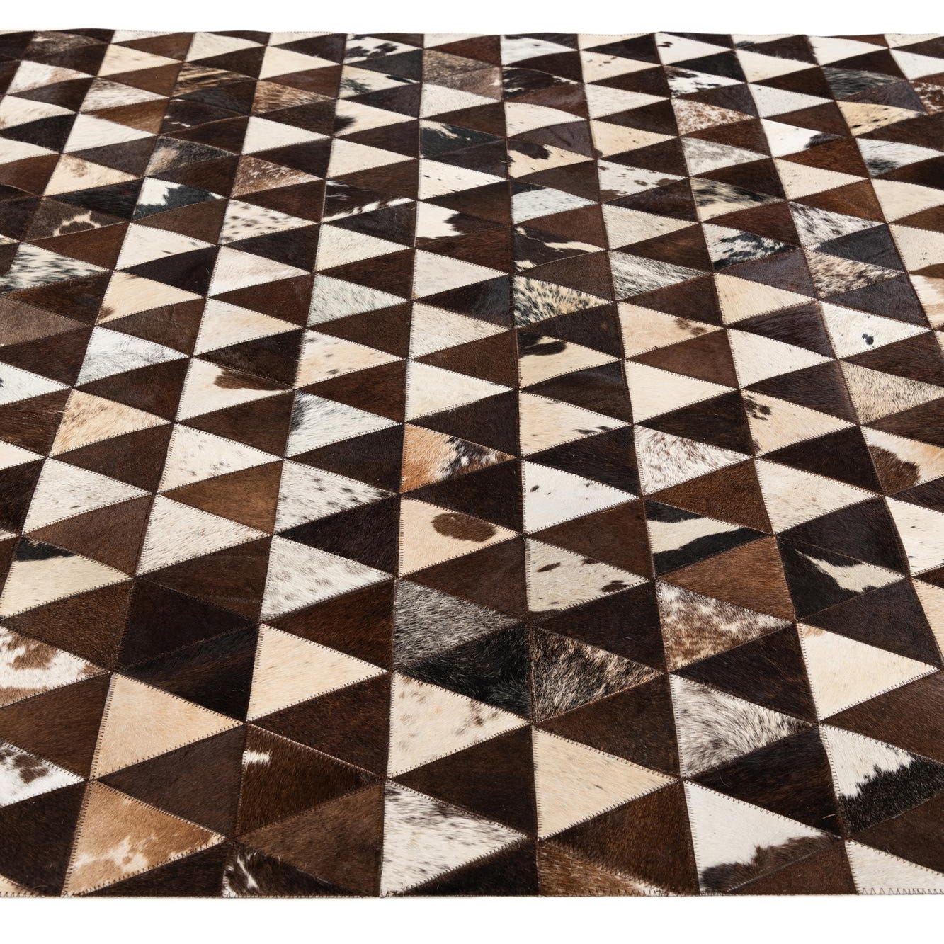A 5x8 rectangular Cowhide Stocks rug featuring a modern geometric pattern of multi-colored cowhide and leather triangles in various shades of brown, black, and white.