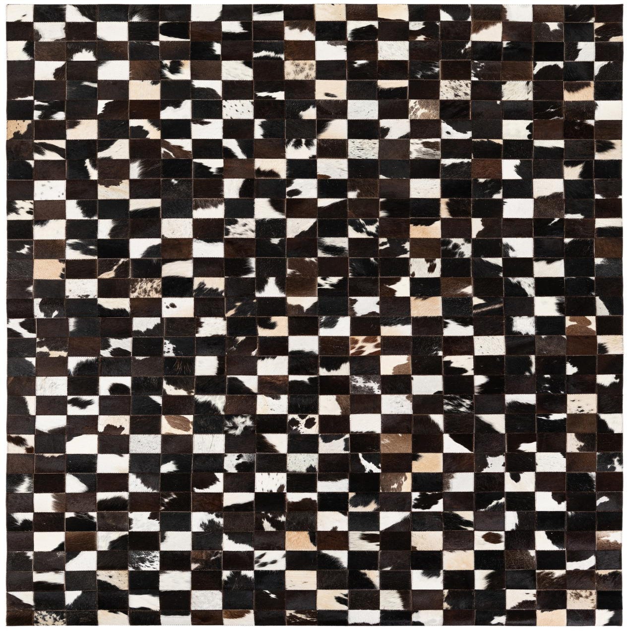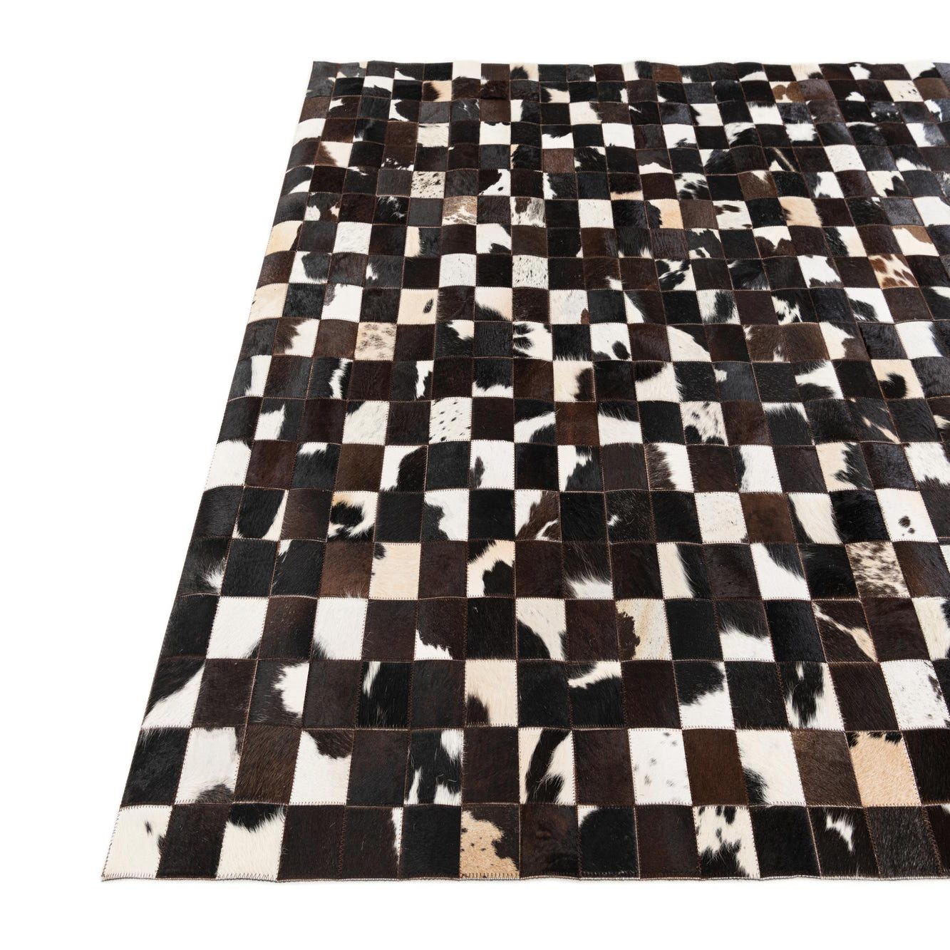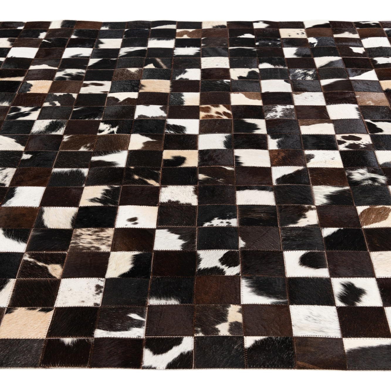 A 5x8 rectangular Cowhide Stocks rug from Rugs.com, featuring a modern checkerboard pattern of multi-colored cowhide patches in black, brown, and white tones.