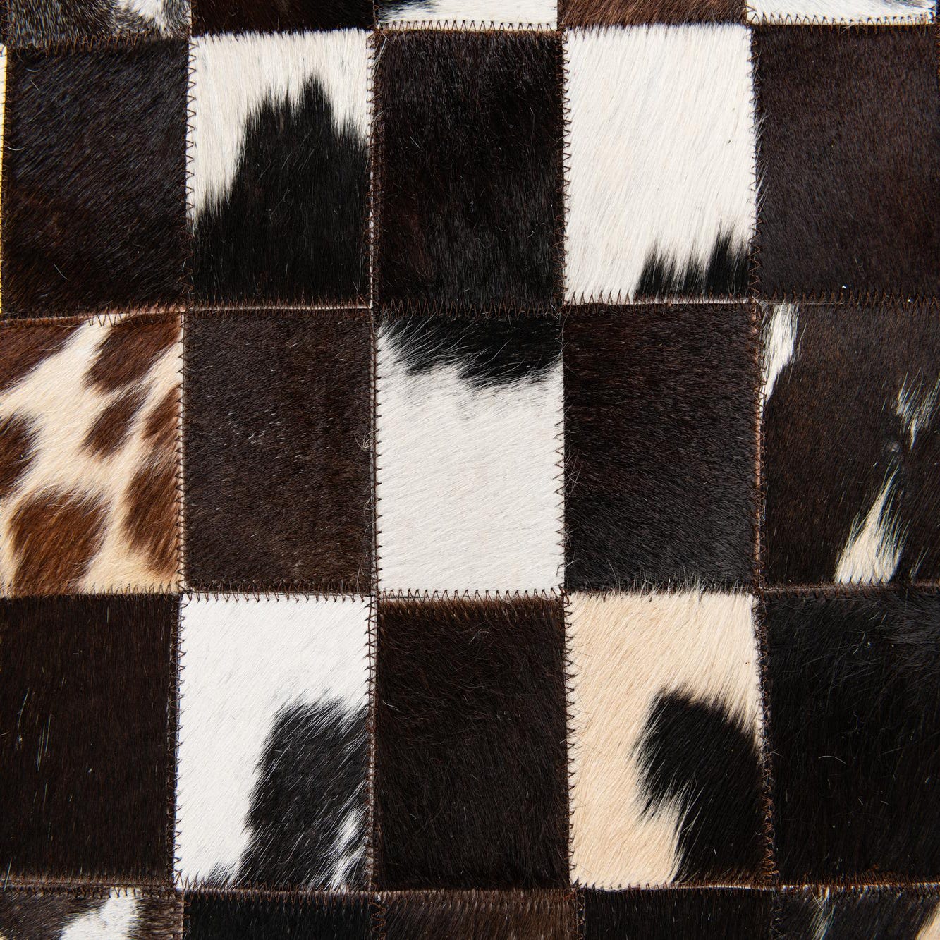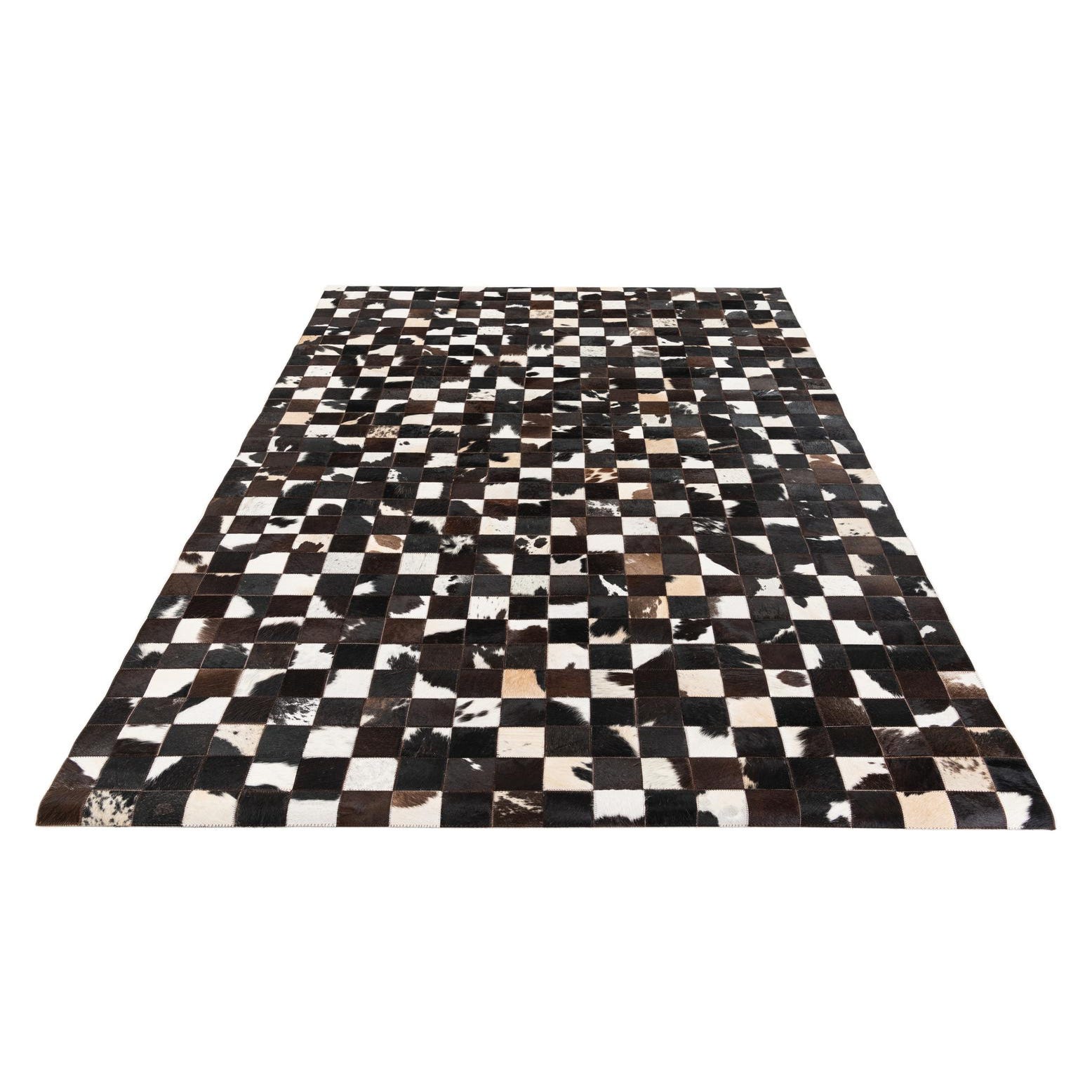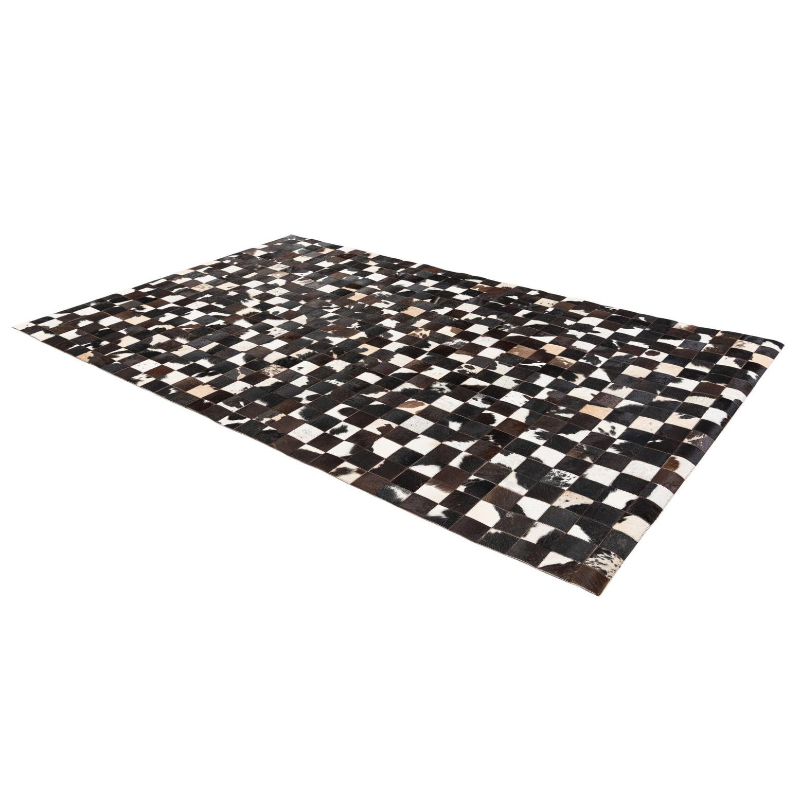 A 5x8 rectangular Cowhide Stocks rug from Rugs.com, featuring a modern checkerboard pattern of multi-colored cowhide patches in black, brown, and white tones.