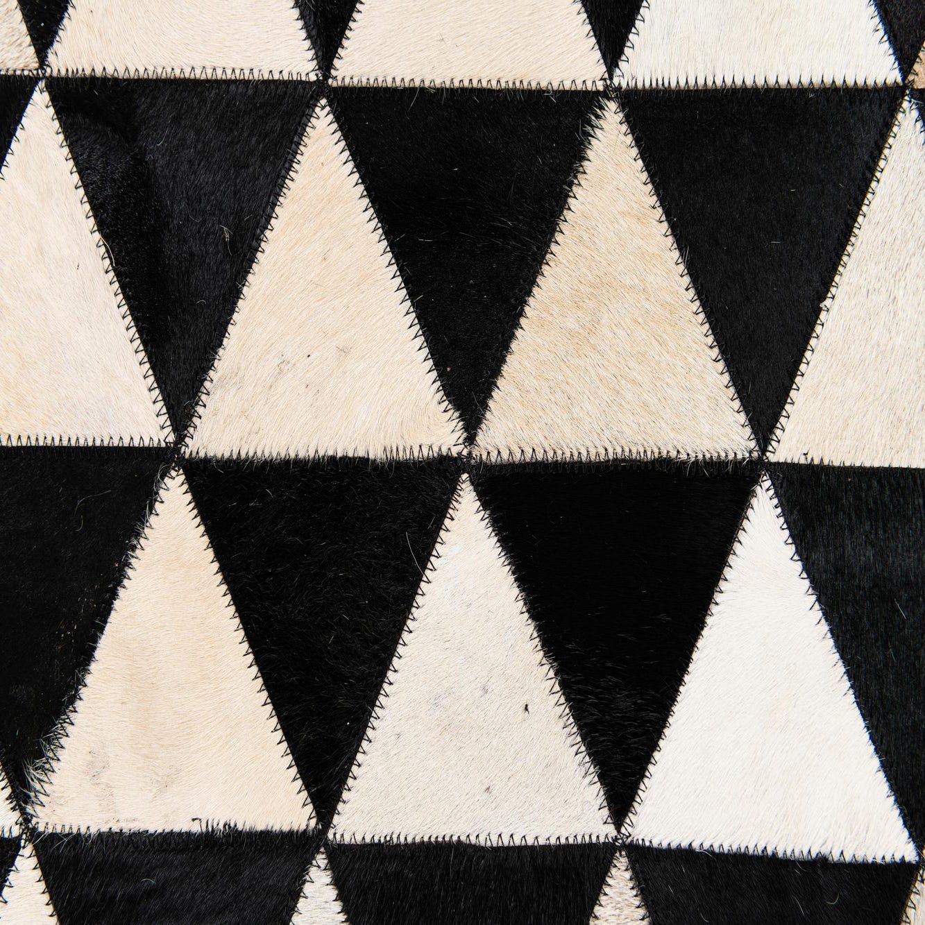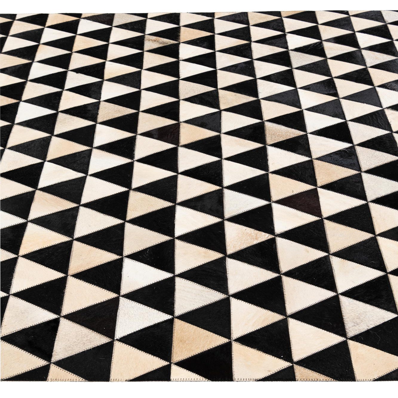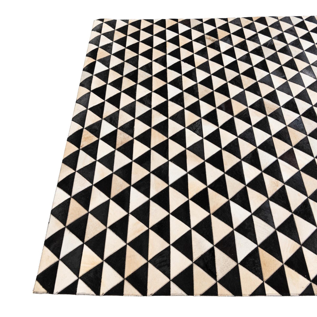 A 5x8 rectangular Cowhide Stocks rug featuring a modern geometric pattern of alternating black and cream triangular patches.