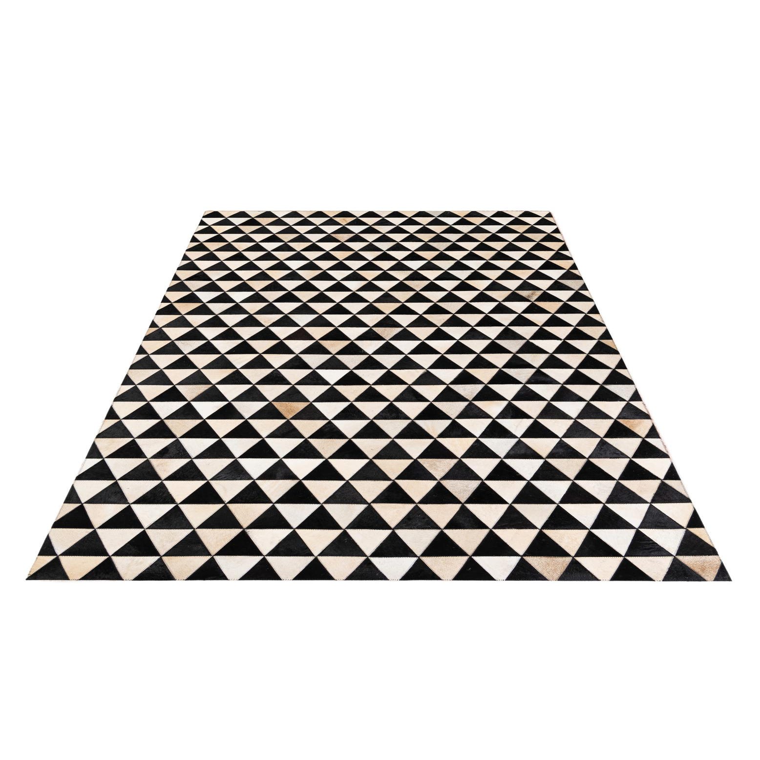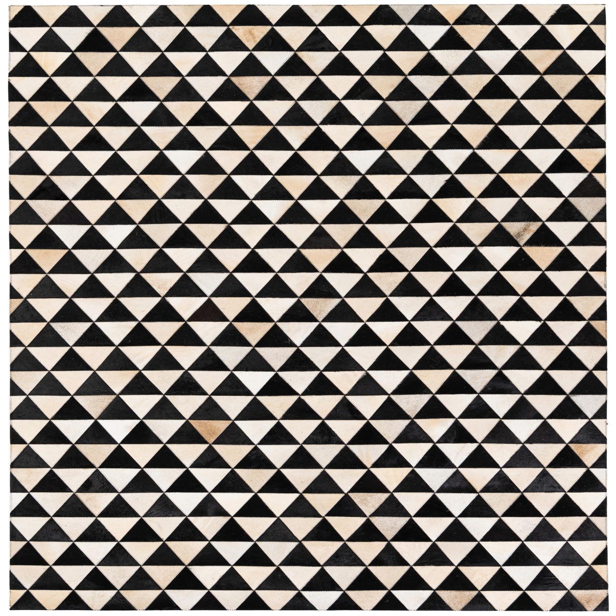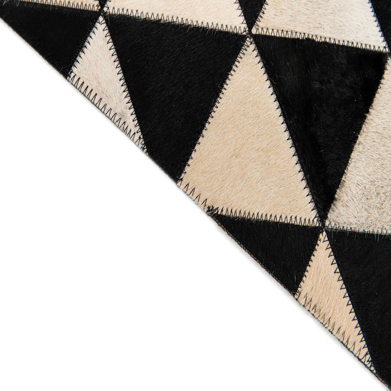 A 5x8 rectangular Cowhide Stocks rug featuring a modern geometric pattern of alternating black and cream triangular patches.