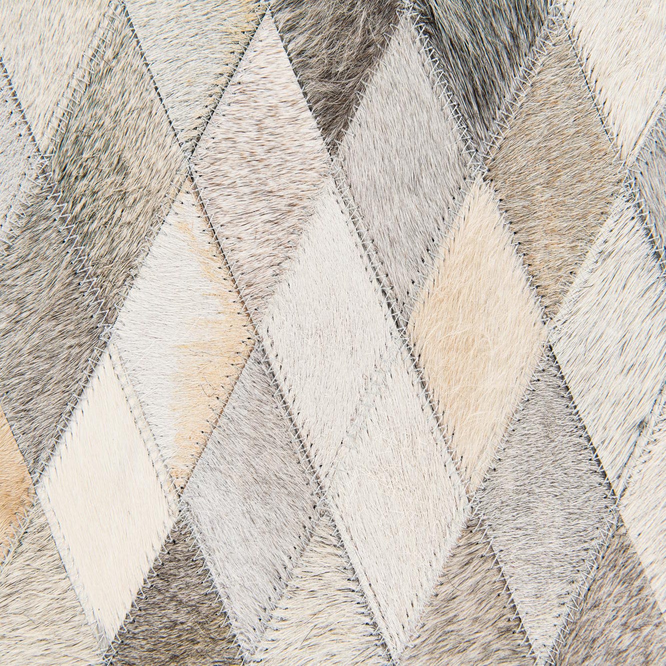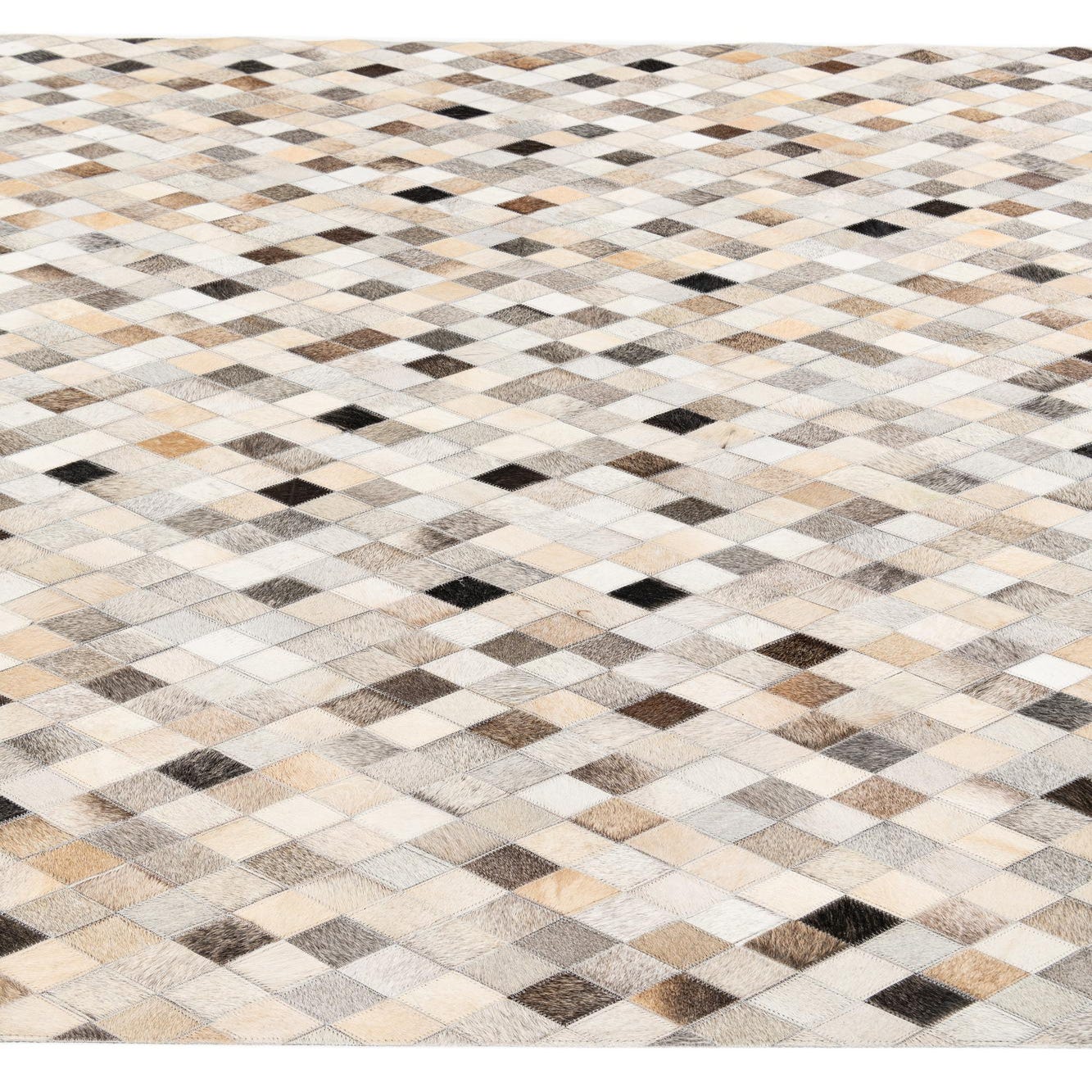 A 5x8 rectangular Cowhide Stocks rug featuring a modern multi-colored diamond pattern in various natural cowhide tones.