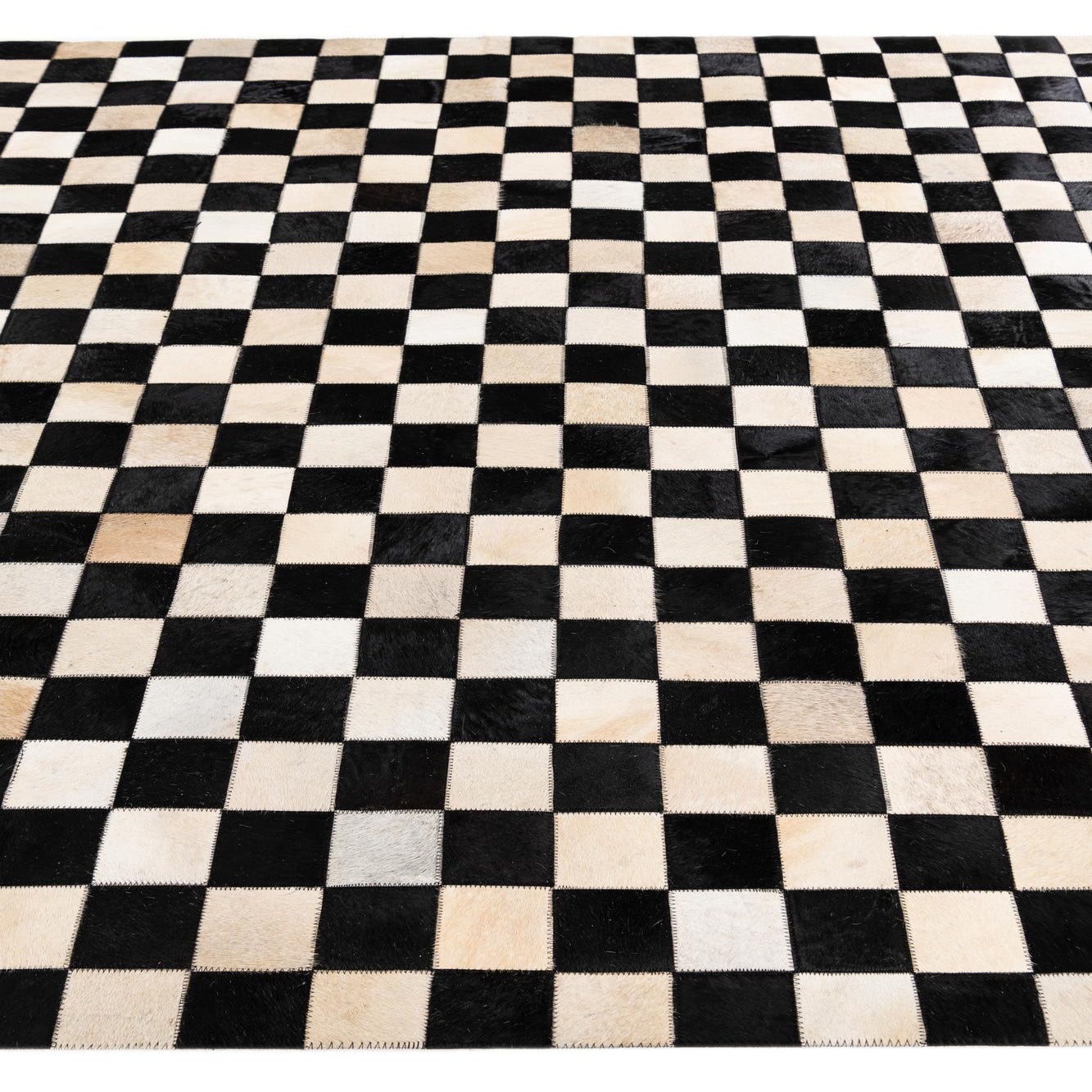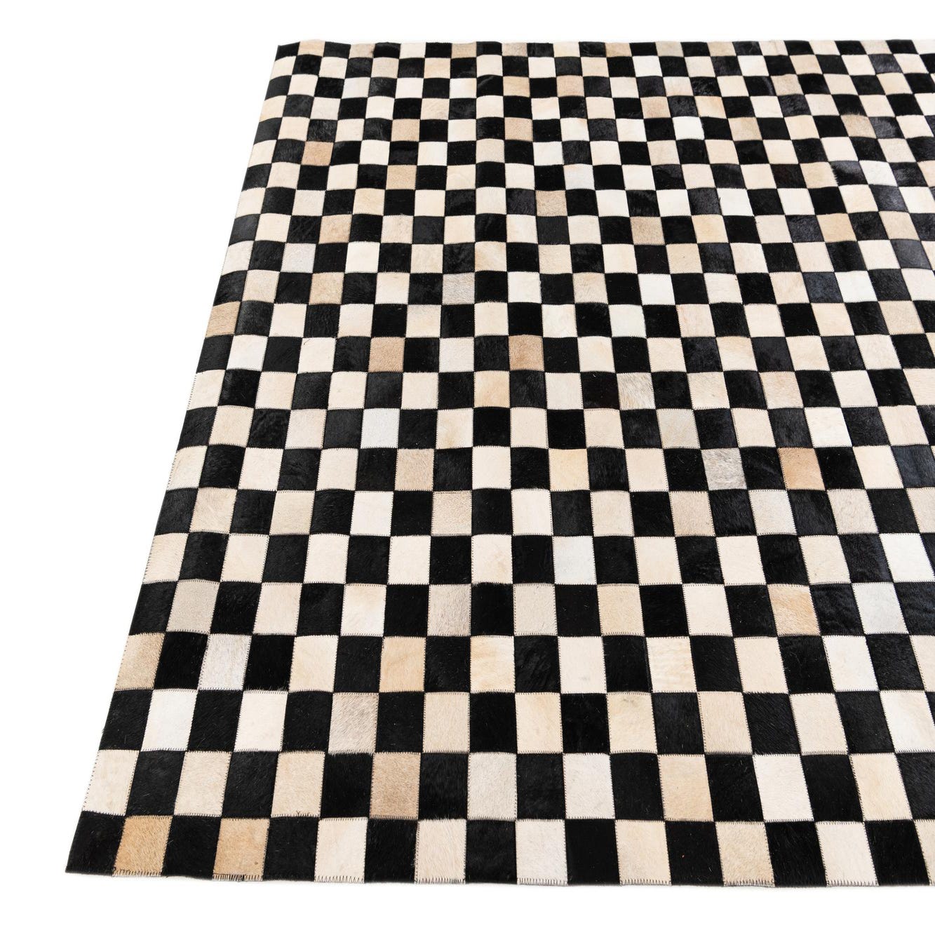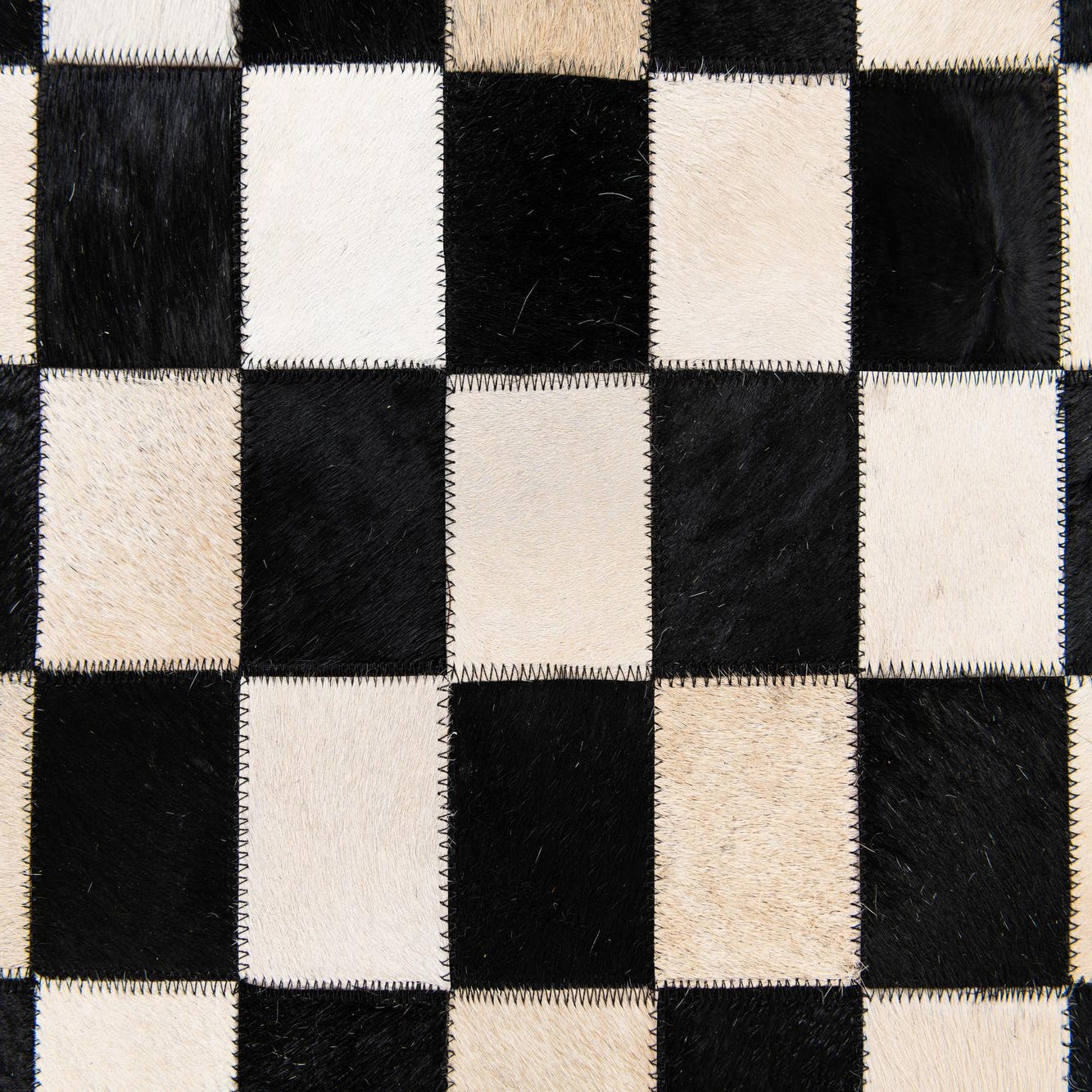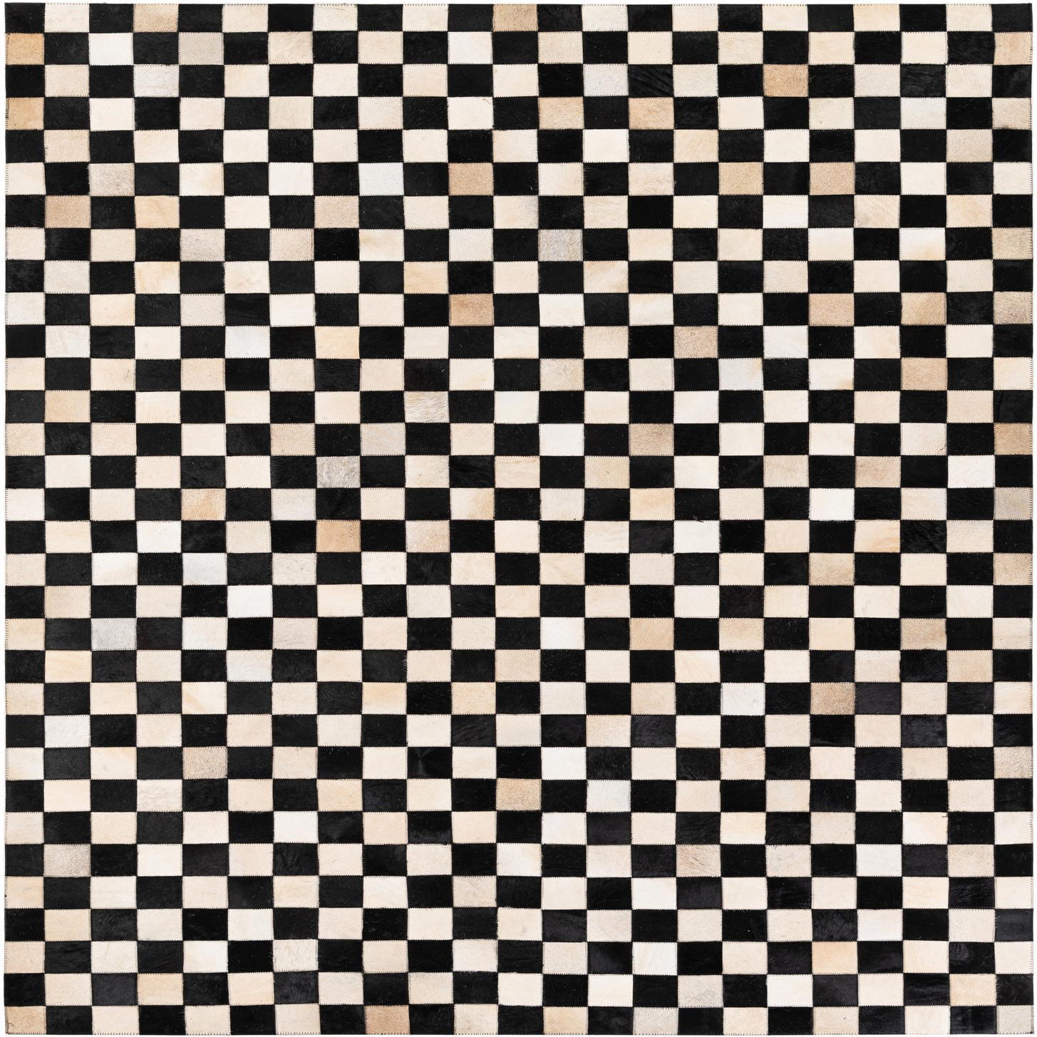 A 5x8 rectangular Cowhide Stocks rug from Rugs.com featuring a modern checkerboard pattern in black and natural multi-colored cowhide squares.