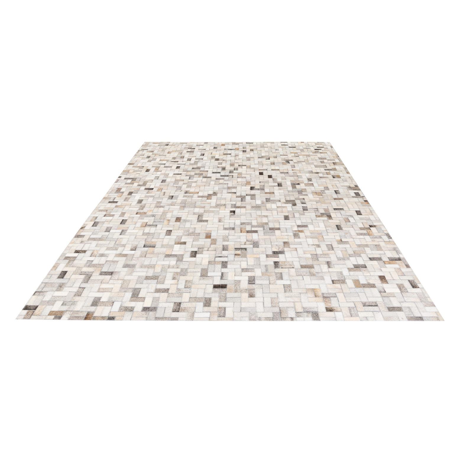 A 5x8 rectangular Cowhide Stocks rug from Rugs.com, featuring a modern patchwork of multi-colored cowhide and leather rectangles in various shades of white, beige, brown, and gray.
