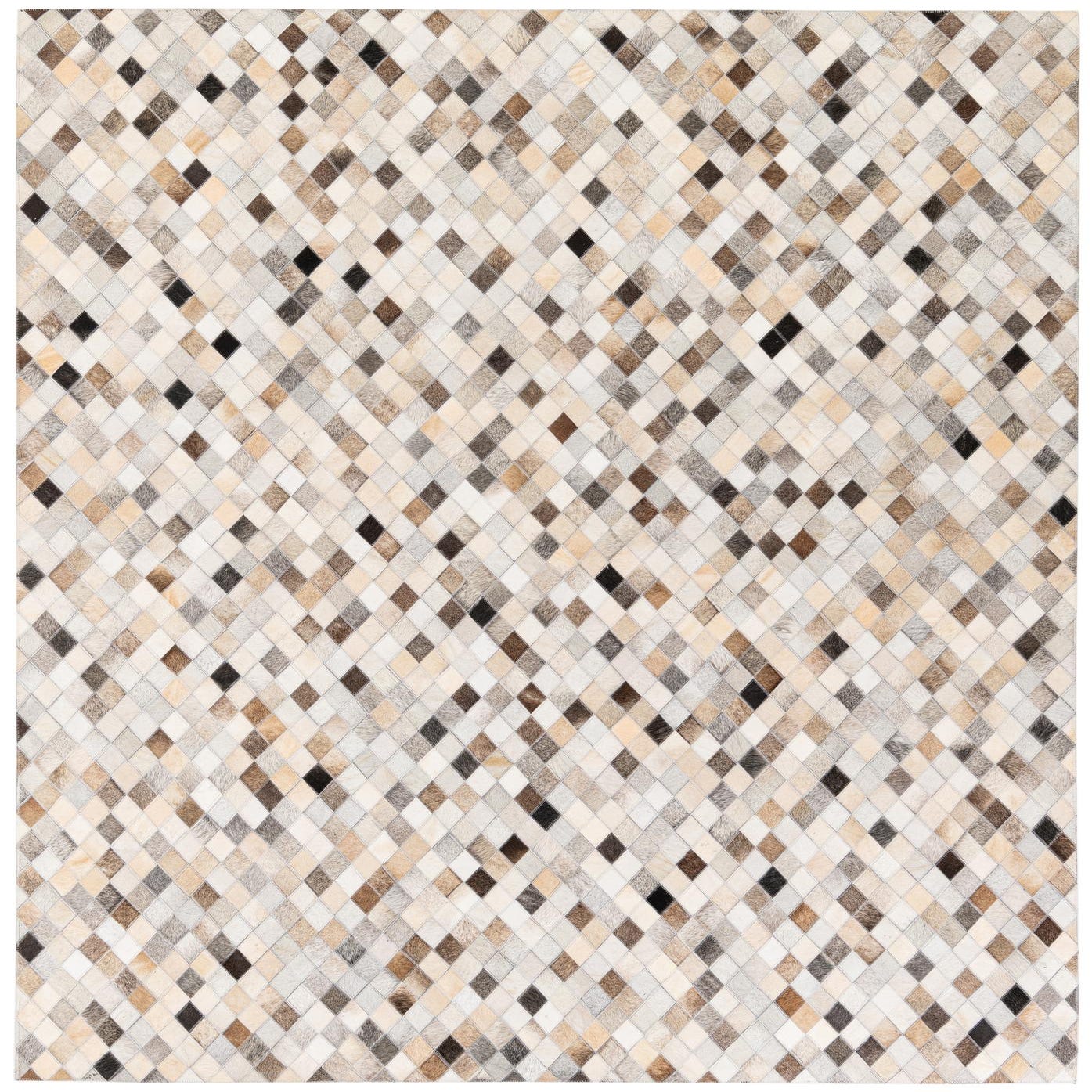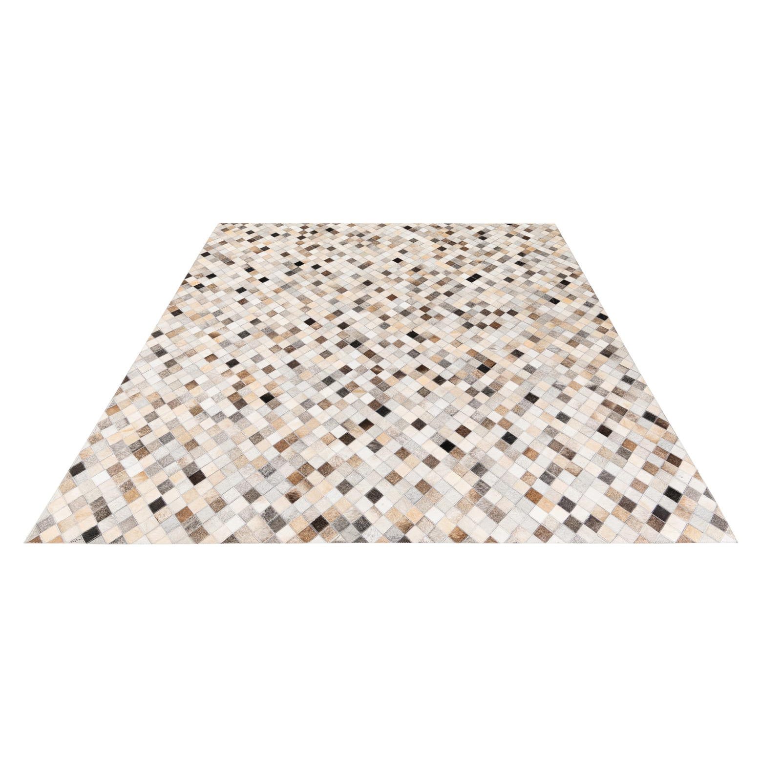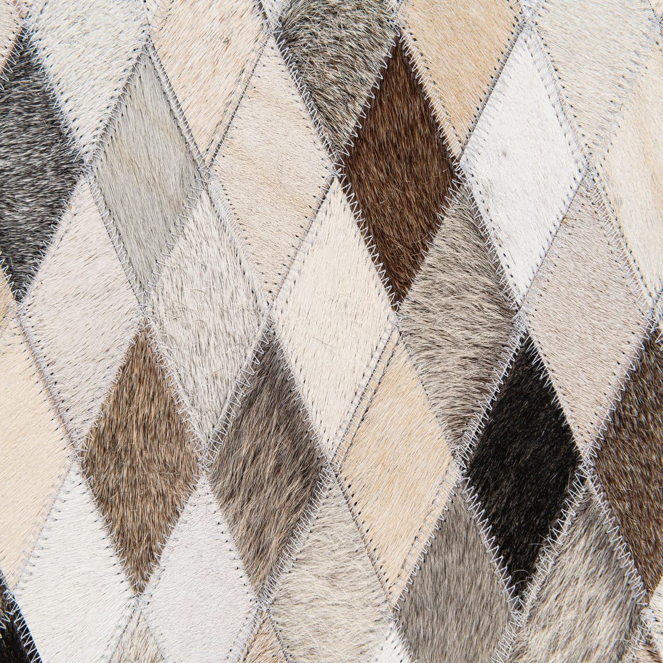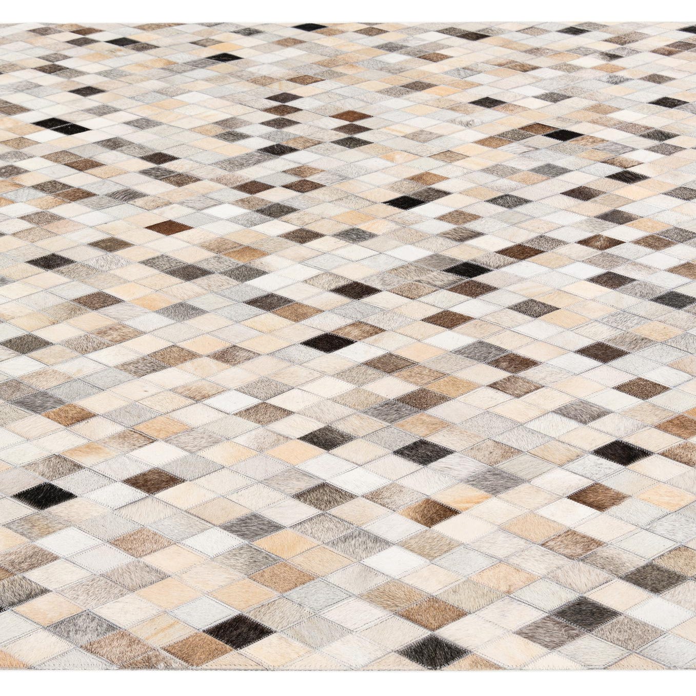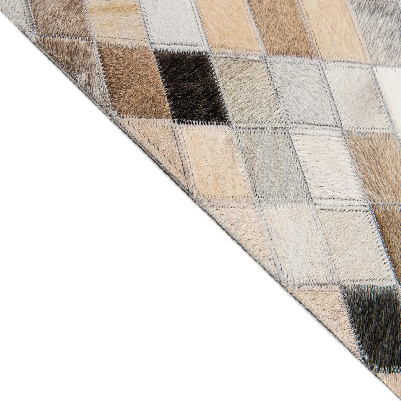 A 5x8 rectangular Cowhide Stocks rug from Rugs.com, featuring a modern multi-colored diamond pattern in various shades of brown, beige, and black.