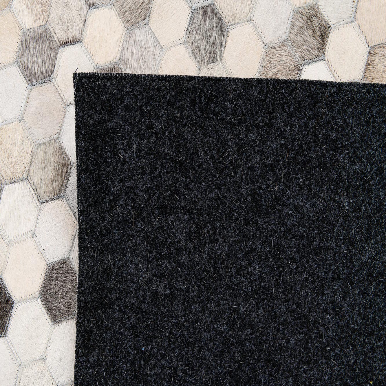 Handmade of cowhide and leather, this rug arranges hundreds of small hexagonal patches into a tight honeycomb mosaic. The multi-tonal background blends ivory, beige, tan and gray in a subtle, natural pattern that reads like stone or tile. Running your hand across the surface you feel the soft hair-on-hide texture with slight variation in nap and a muted, natural sheen where the hide catches the light. Visible stitching between each hexagon gives the piece structure and a crafted, tactile quality.