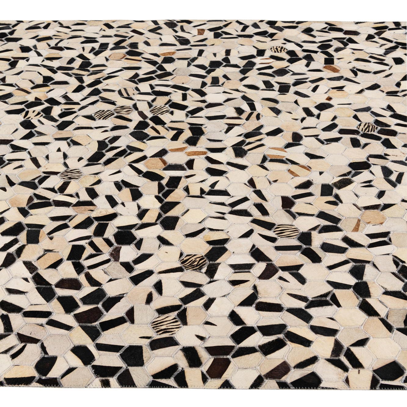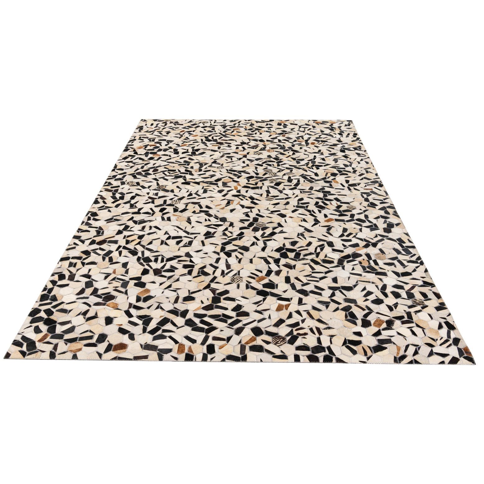 A 5x8 rectangular Cowhide Stocks rug featuring a modern multi-colored mosaic pattern with black, white, and brown leather pieces.