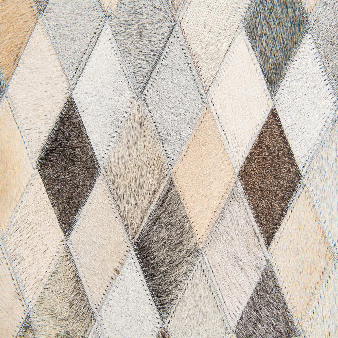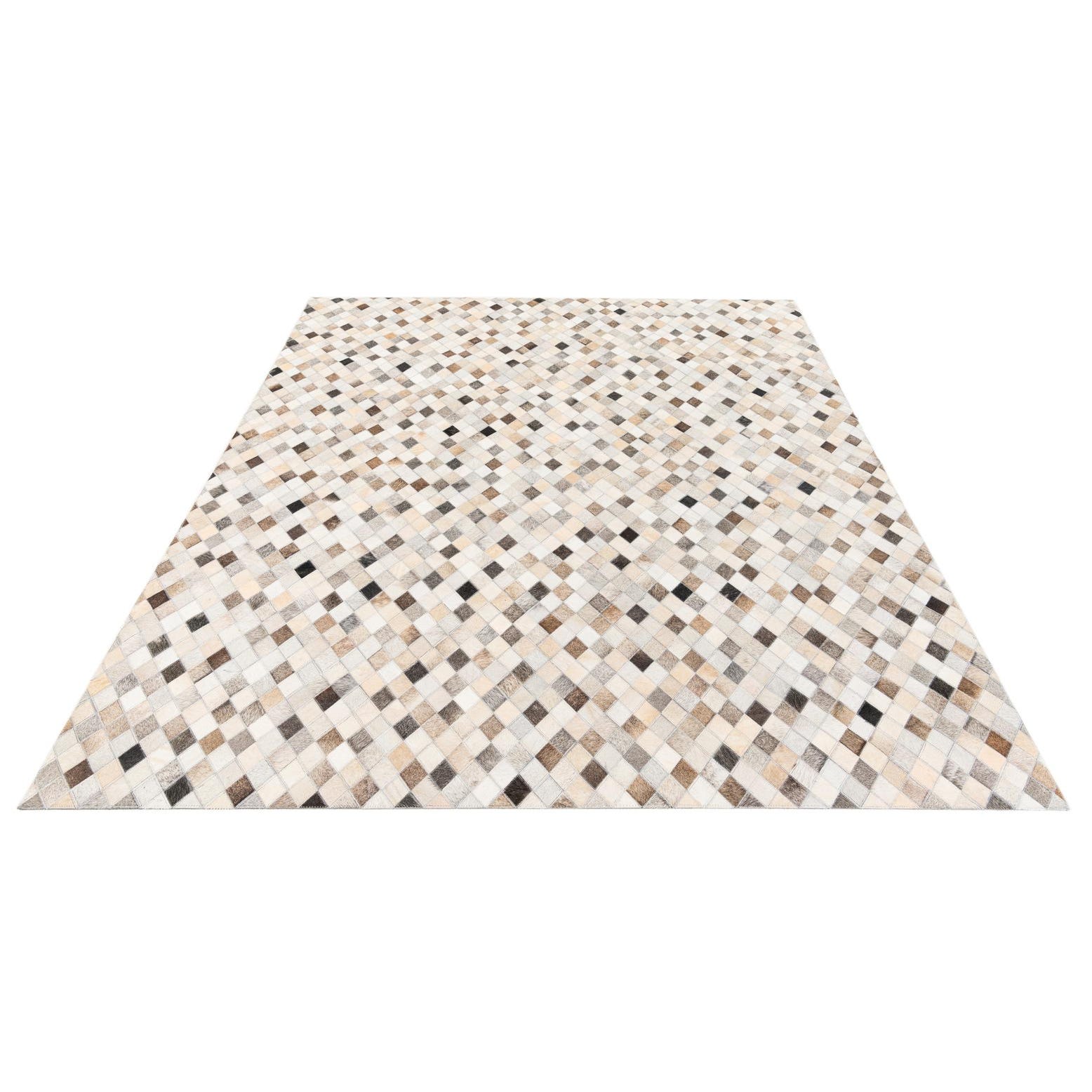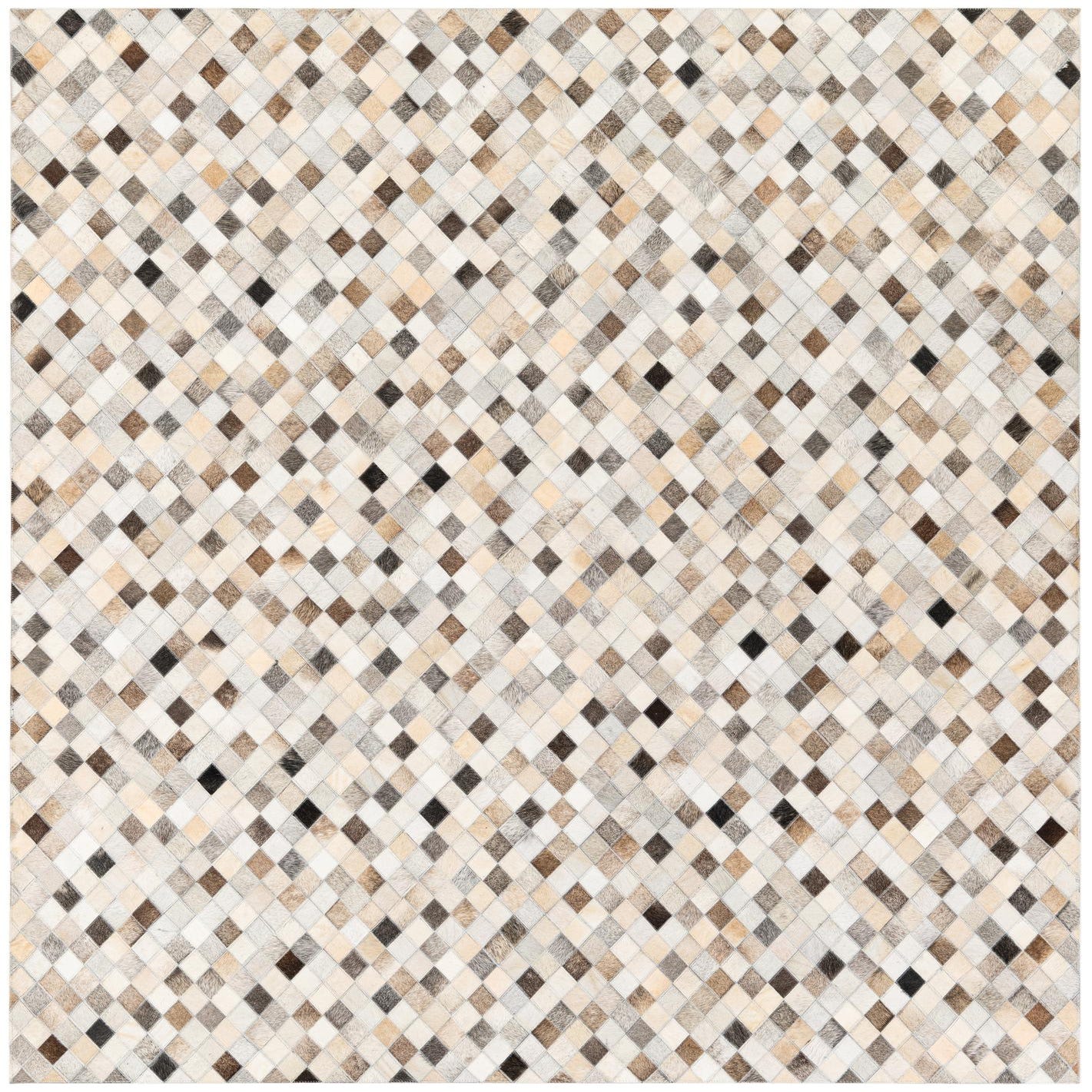 A 5x8 rectangular Cowhide Stocks rug from Rugs.com, featuring a modern multi-colored diamond pattern in various shades of brown, beige, and black.