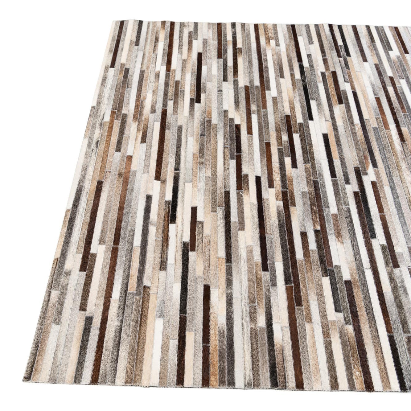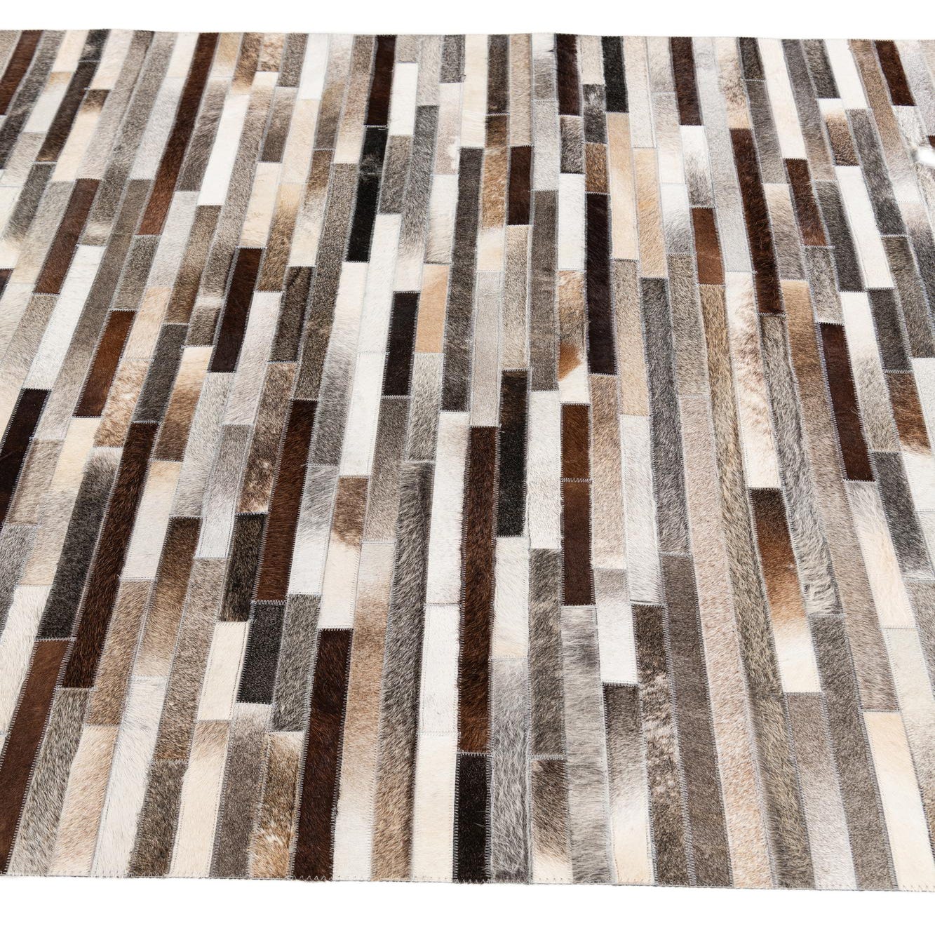 A rectangular 5x8 modern cowhide rug featuring a multi-colored stripe pattern in various shades of brown, beige, white, and gray.