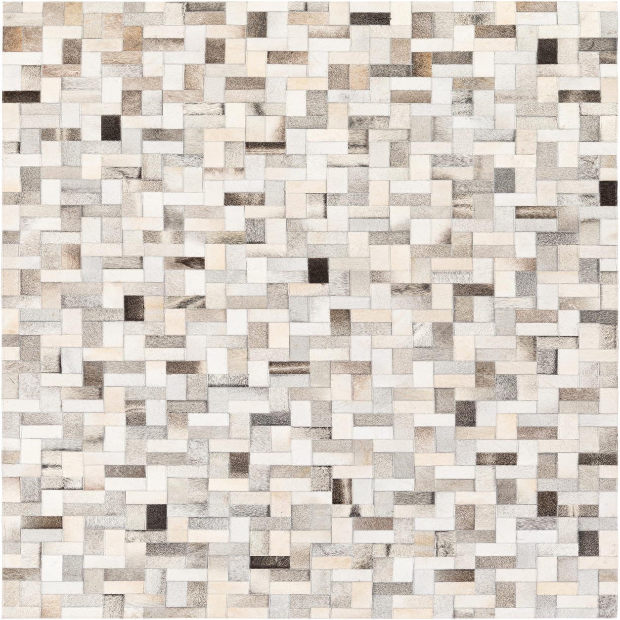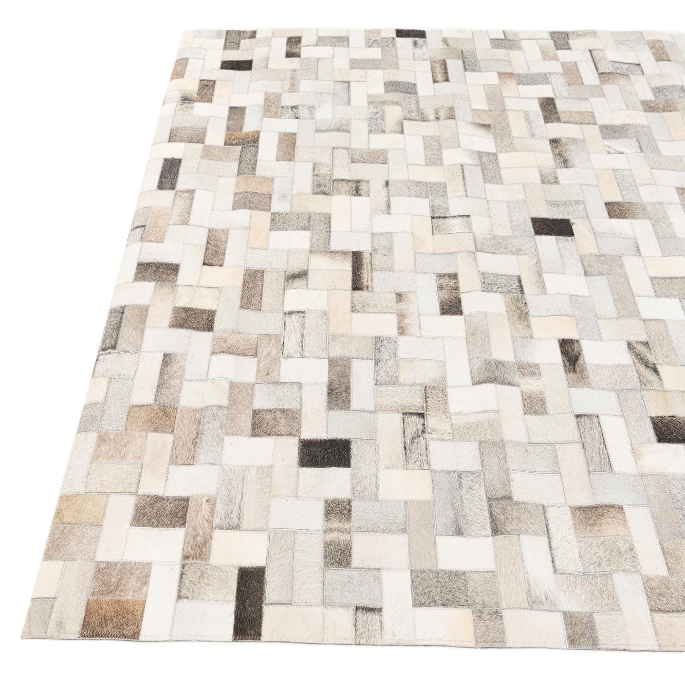 A rectangular 5x8 Cowhide Stocks rug featuring a modern patchwork of multi-colored cowhide and leather squares.
