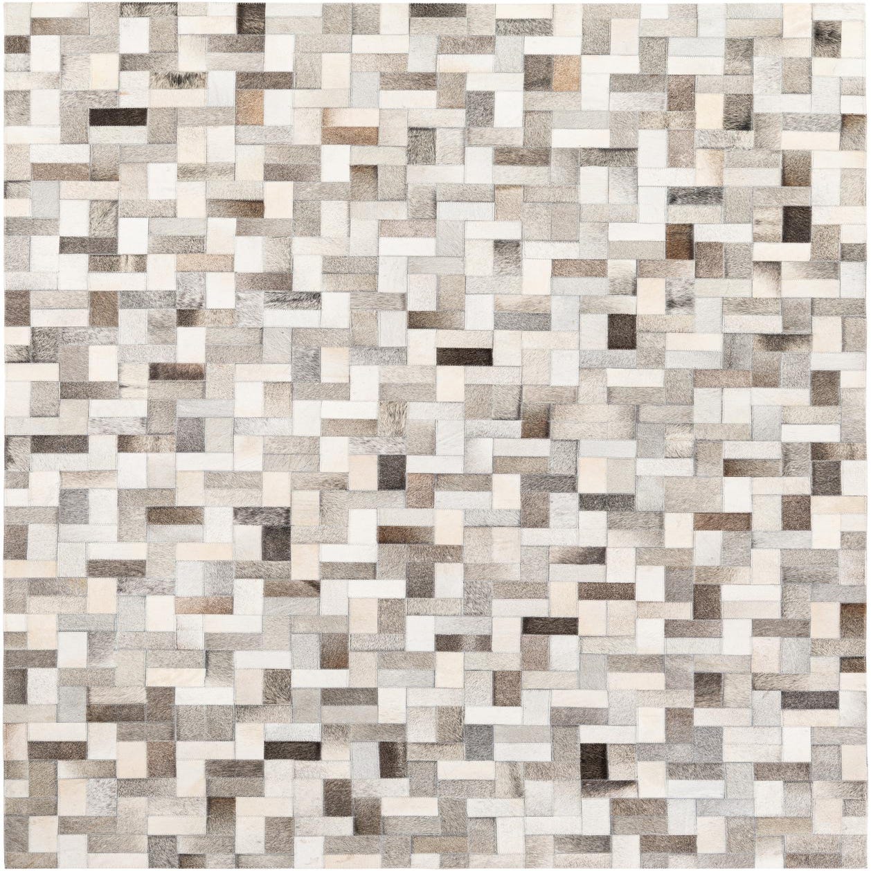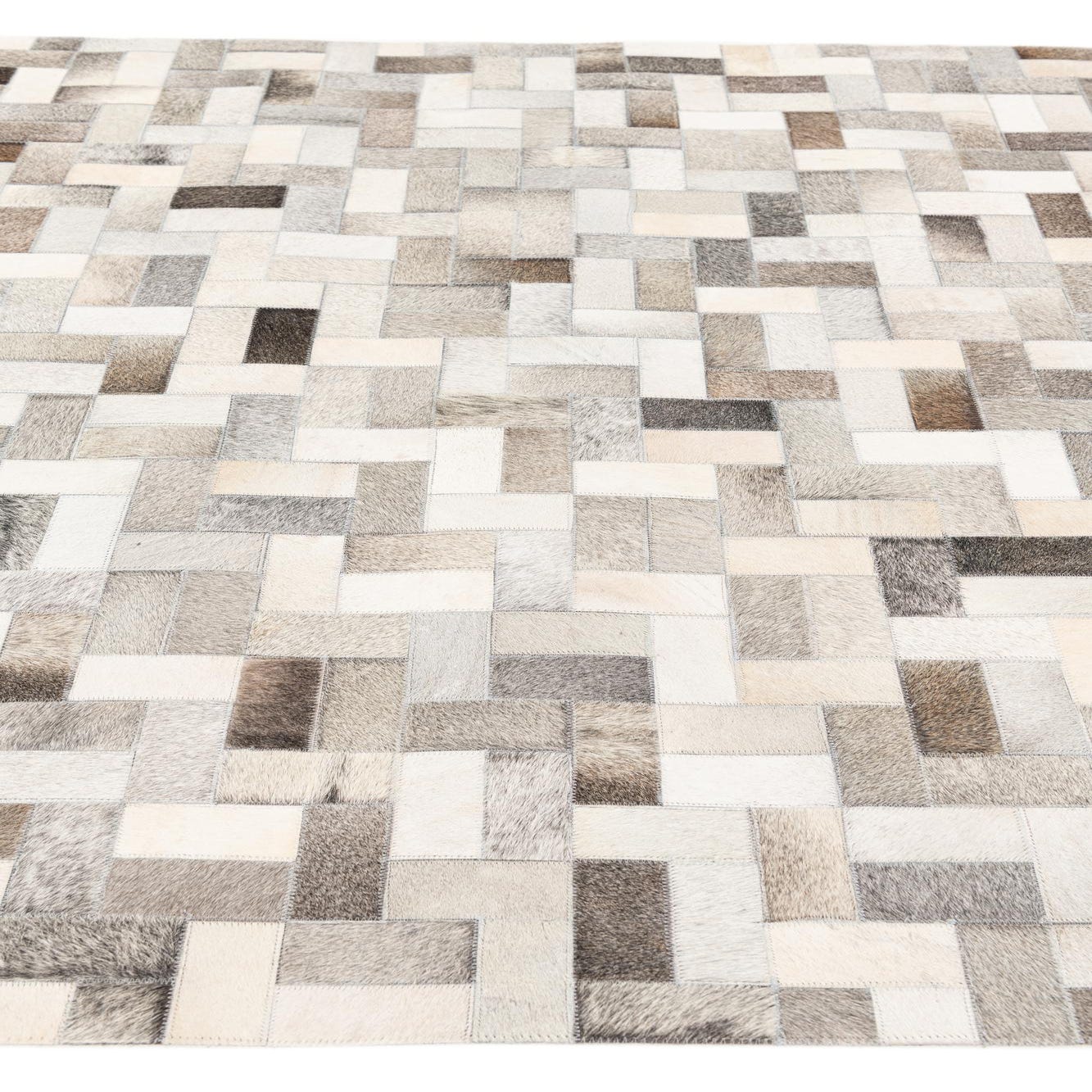 A 5x8 rectangular Cowhide Stocks rug featuring a modern striped pattern in multi-colored patches of natural cowhide and leather.