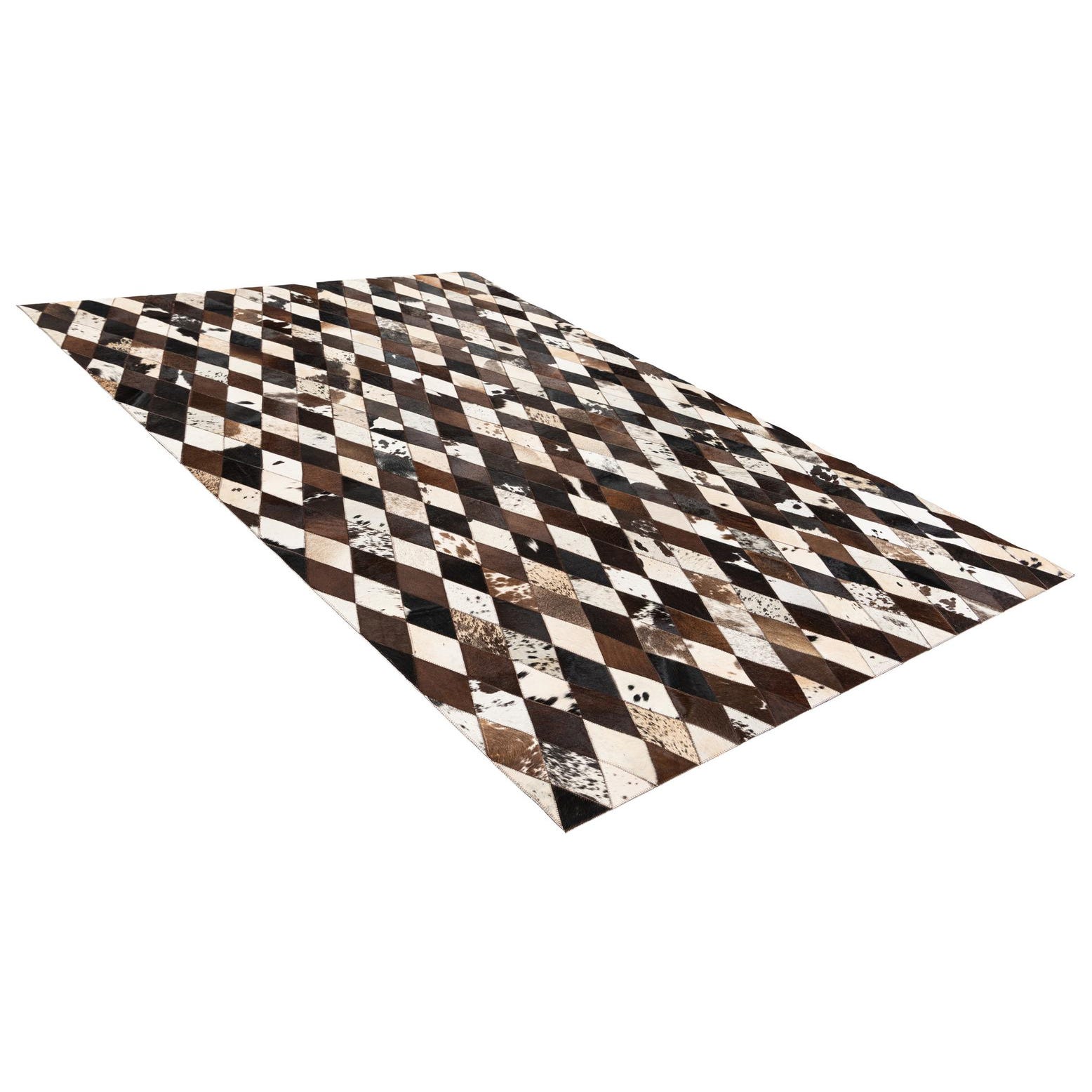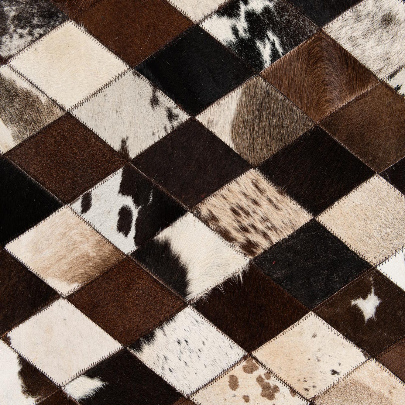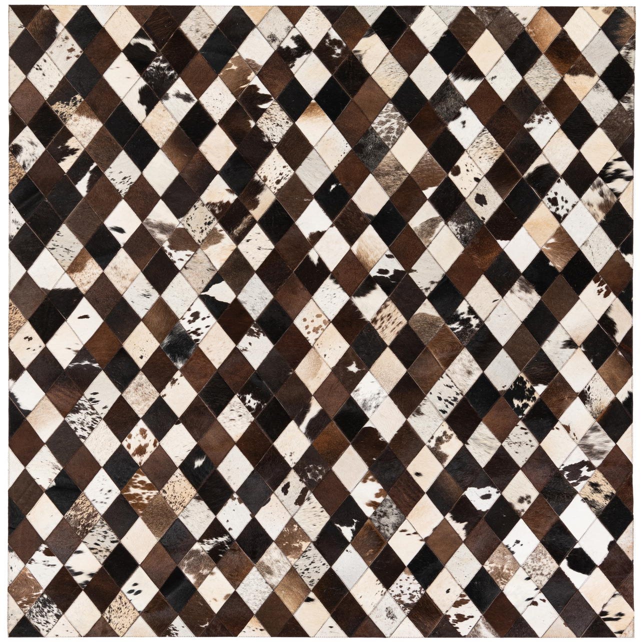 A 5x8 rectangular Cowhide Stocks rug featuring a modern diamond patchwork pattern in multi-colored natural cowhide and leather.