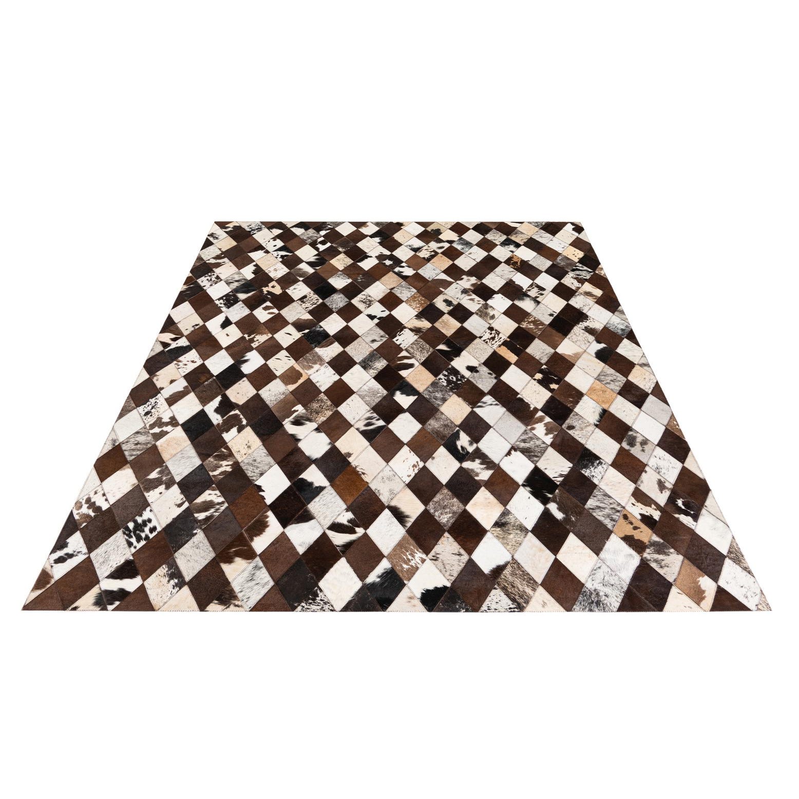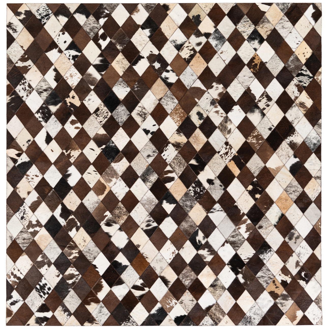 A rectangular 5x8 modern cowhide rug featuring a multi-colored diamond pattern with various shades of brown, white, and black patches.