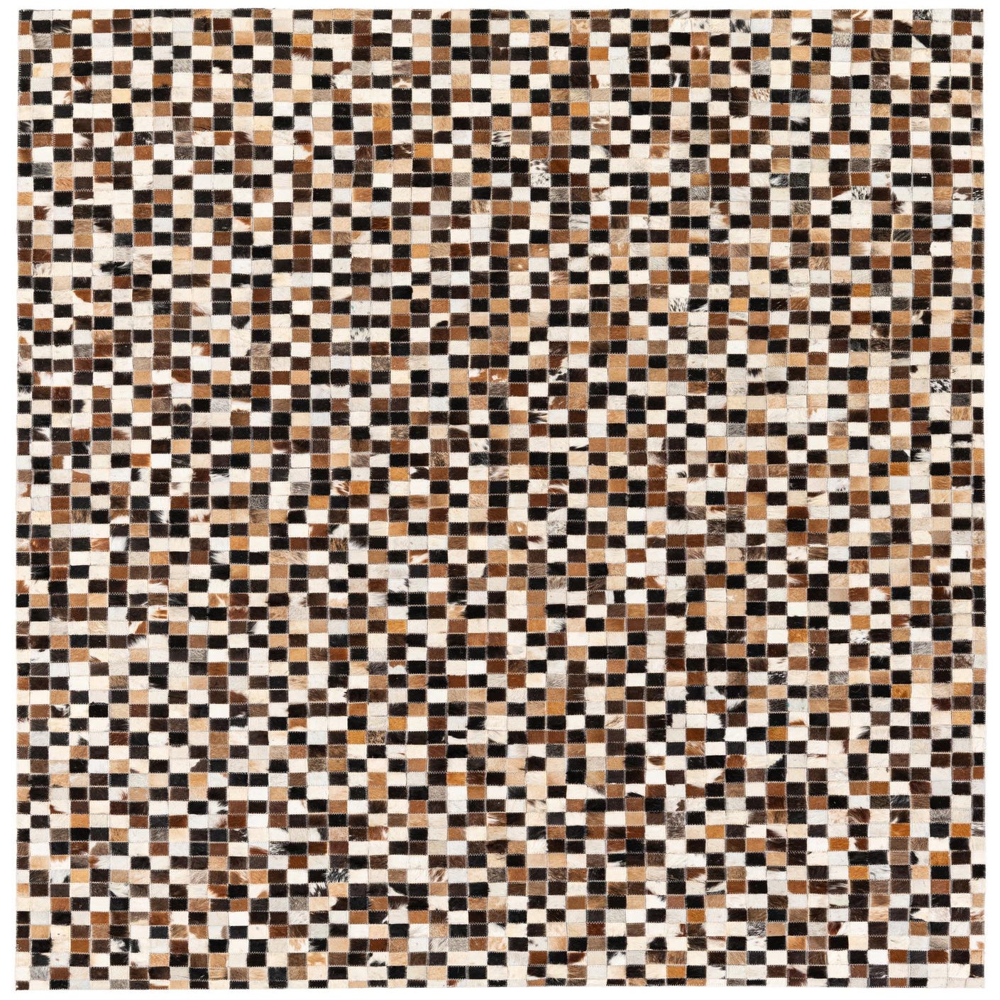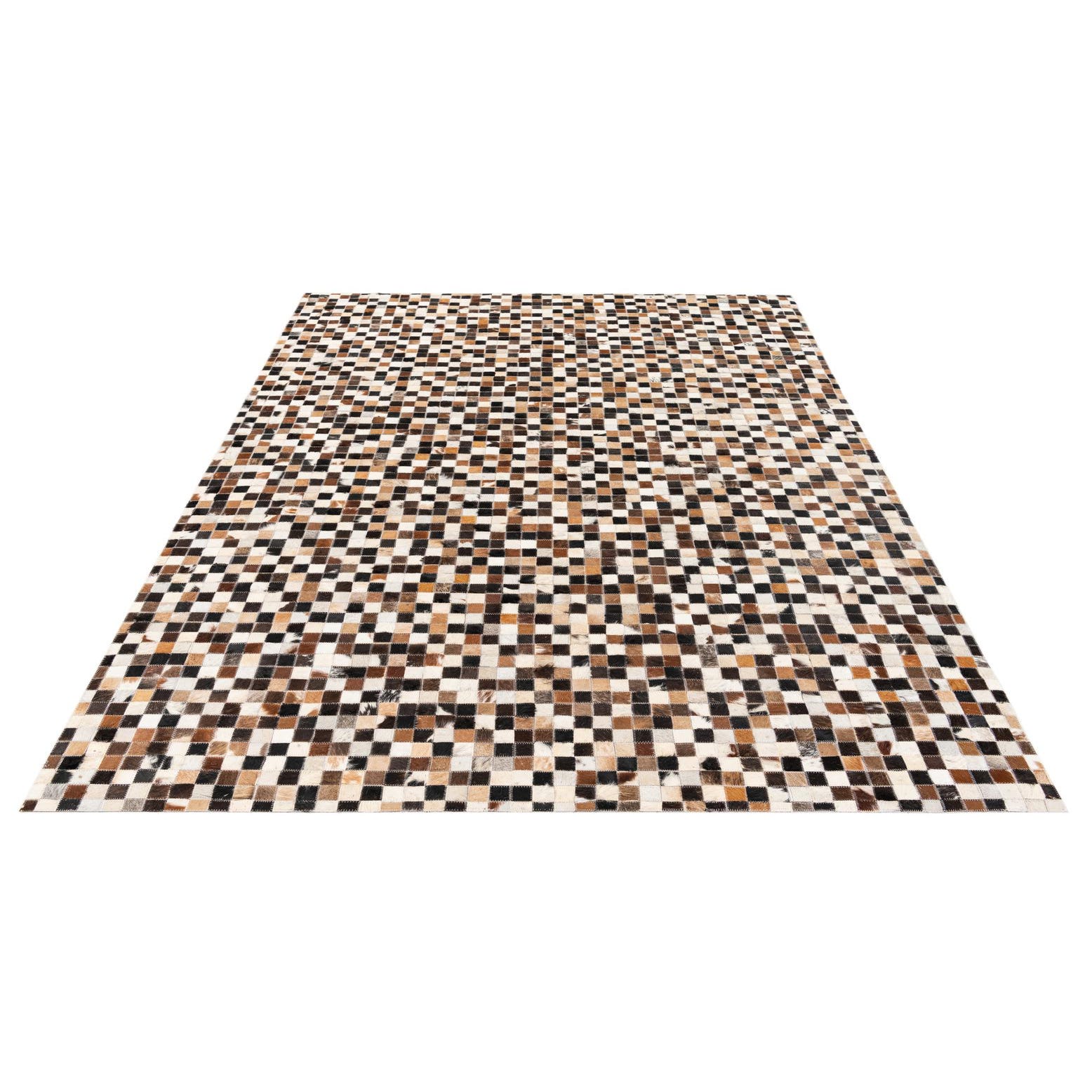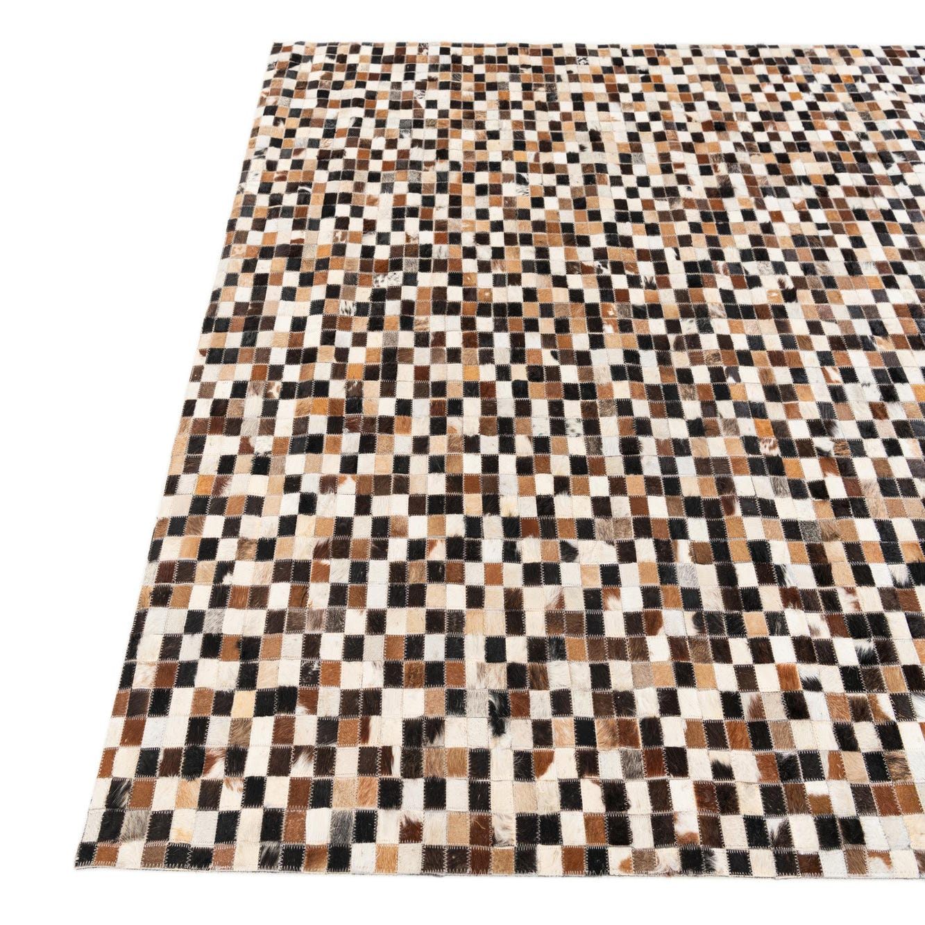 A rectangular 5x8 modern area rug made from multi-colored cowhide and leather patches, forming a checkerboard pattern.