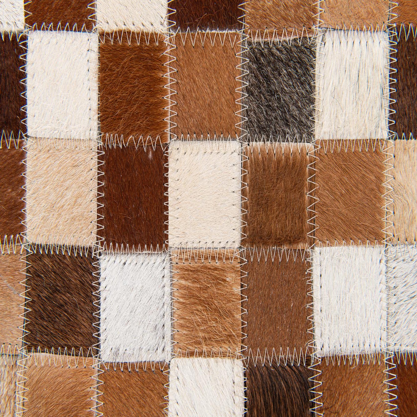 A 5x8 rectangular Cowhide Stocks rug by Rugs.com, featuring a modern patchwork of multi-colored cowhide squares in various shades of brown, white, and black.