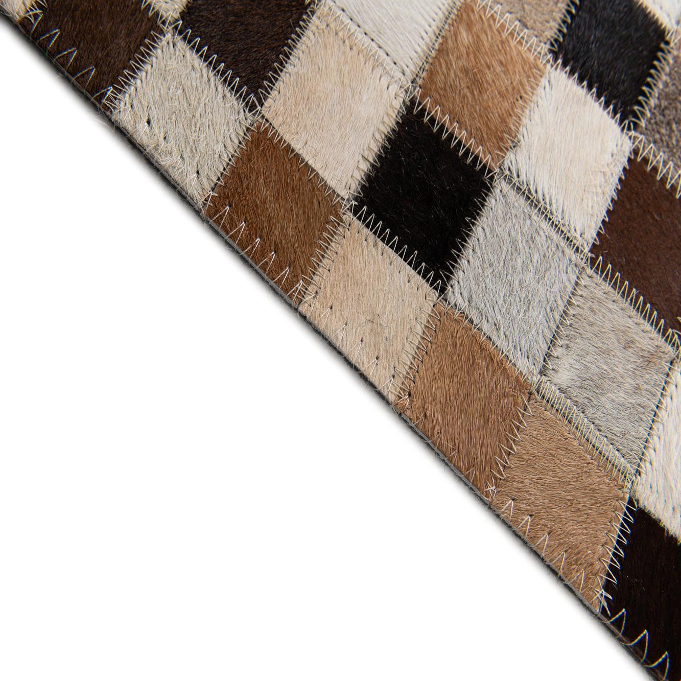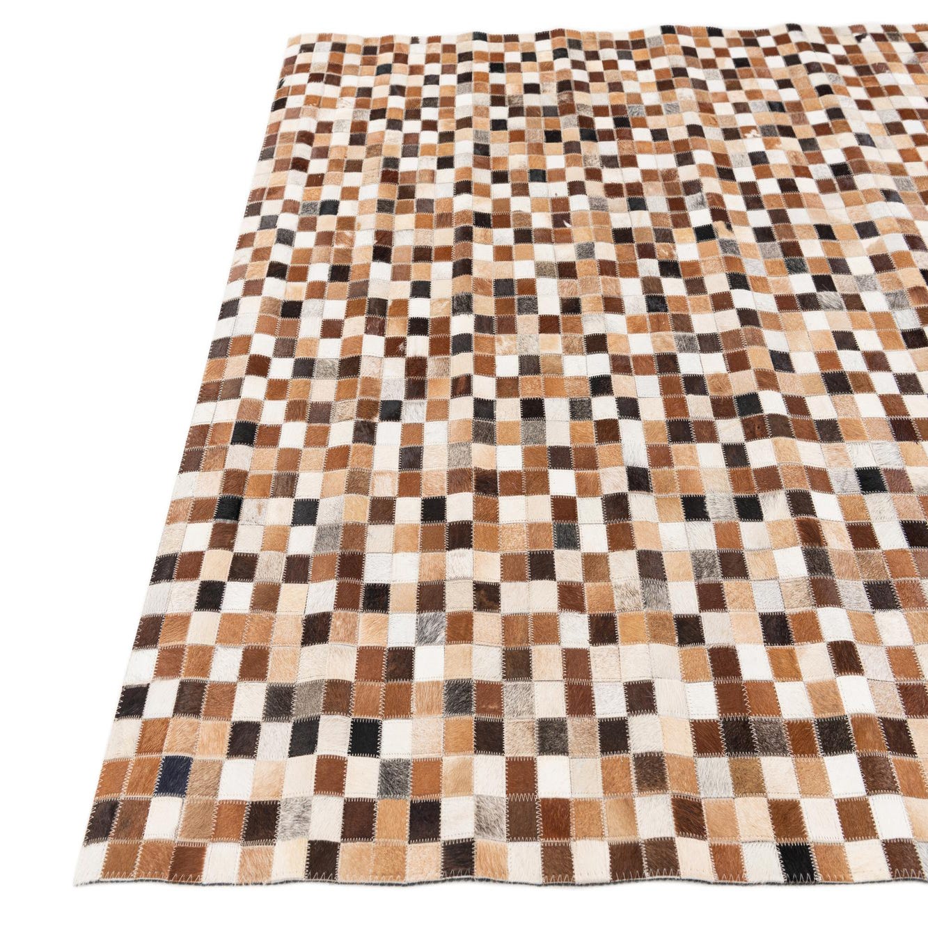 A 5x8 rectangular Cowhide Stocks rug featuring a modern patchwork of multi-colored cowhide squares in various shades of brown, white, and black.