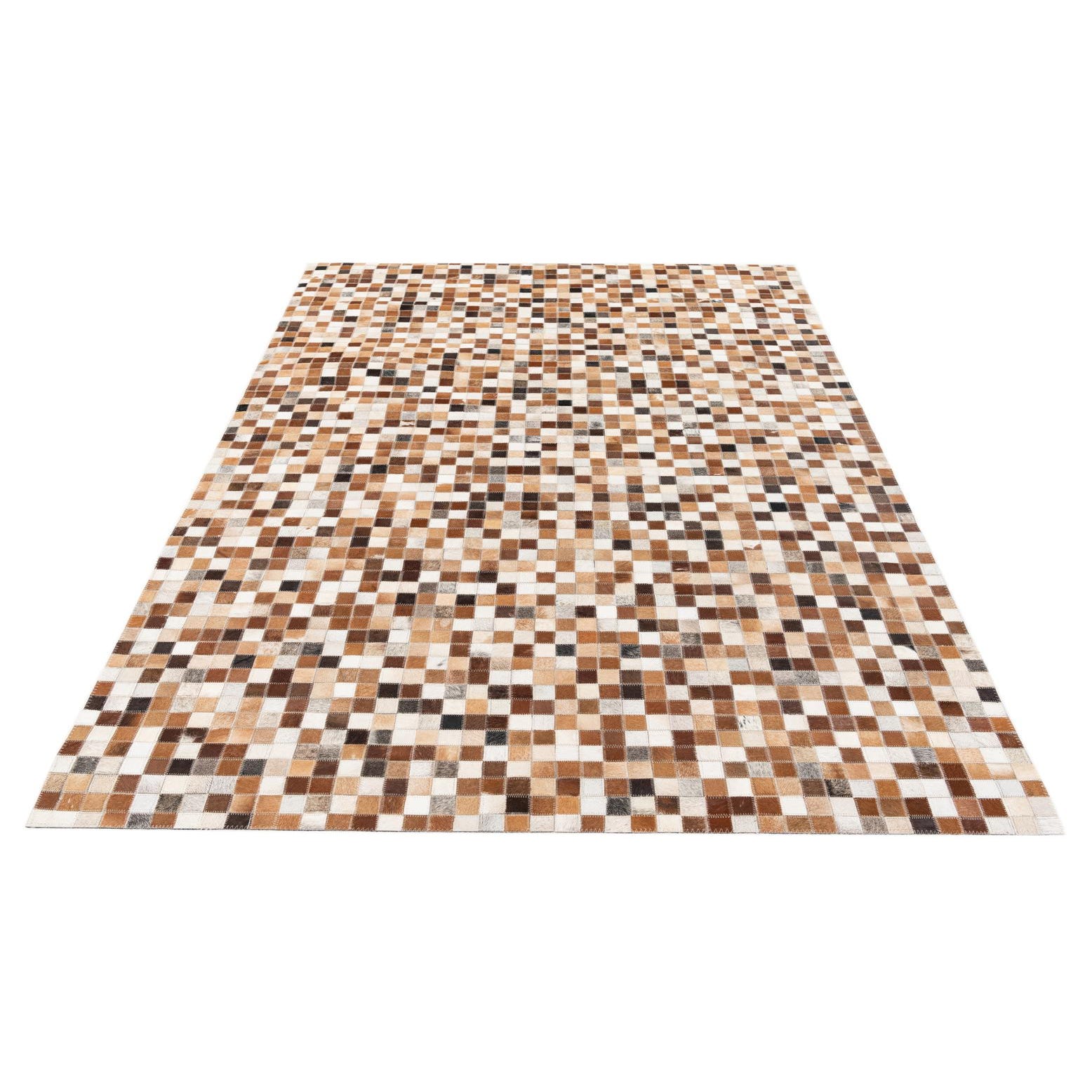 Small, stitched squares of hair-on-hide come together in a precise mosaic checkerboard that feels both organic and modern. Hand-made from cowhide and leather, the rug blends multi-tonal neutrals—beige, tan, light brown, brown, ivory and accents of black—so the surface has a warm, lived-in look without losing visual clarity. Running your hand across it reveals the soft nap and subtle sheen of the hides, while the close, even stitching creates a pleasantly tactile, low-profile texture underfoot.