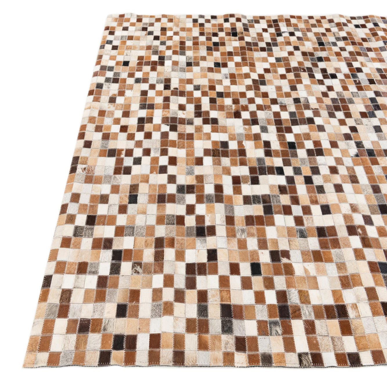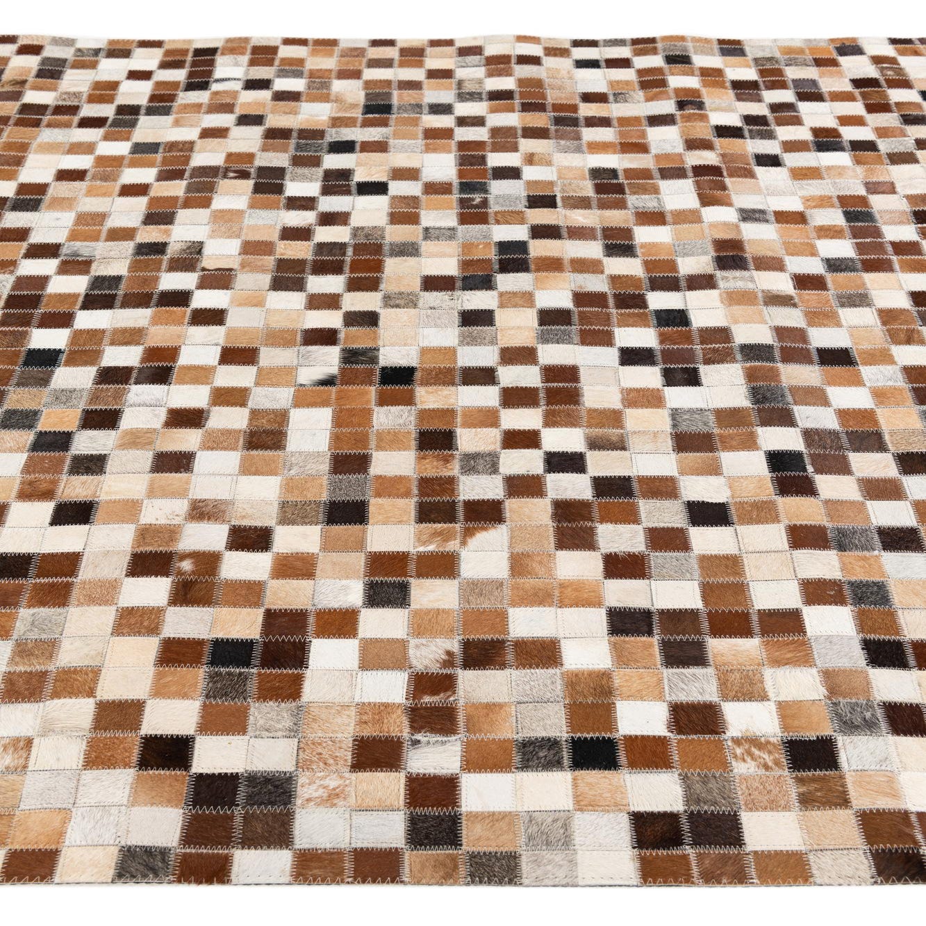 A 5x8 rectangular Cowhide Stocks rug featuring a modern patchwork of multi-colored cowhide squares in various shades of brown, black, and white.