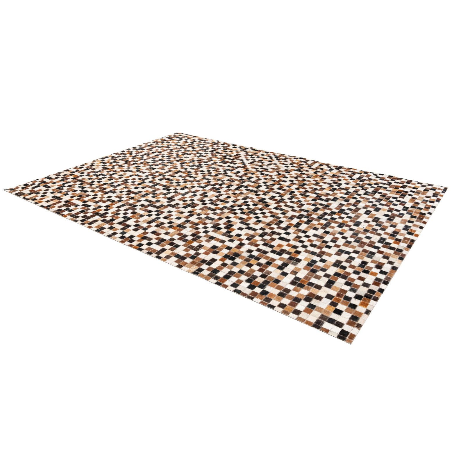 A 5x8 rectangular modern rug with a multi-colored patchwork pattern of brown, black, and white cowhide squares.