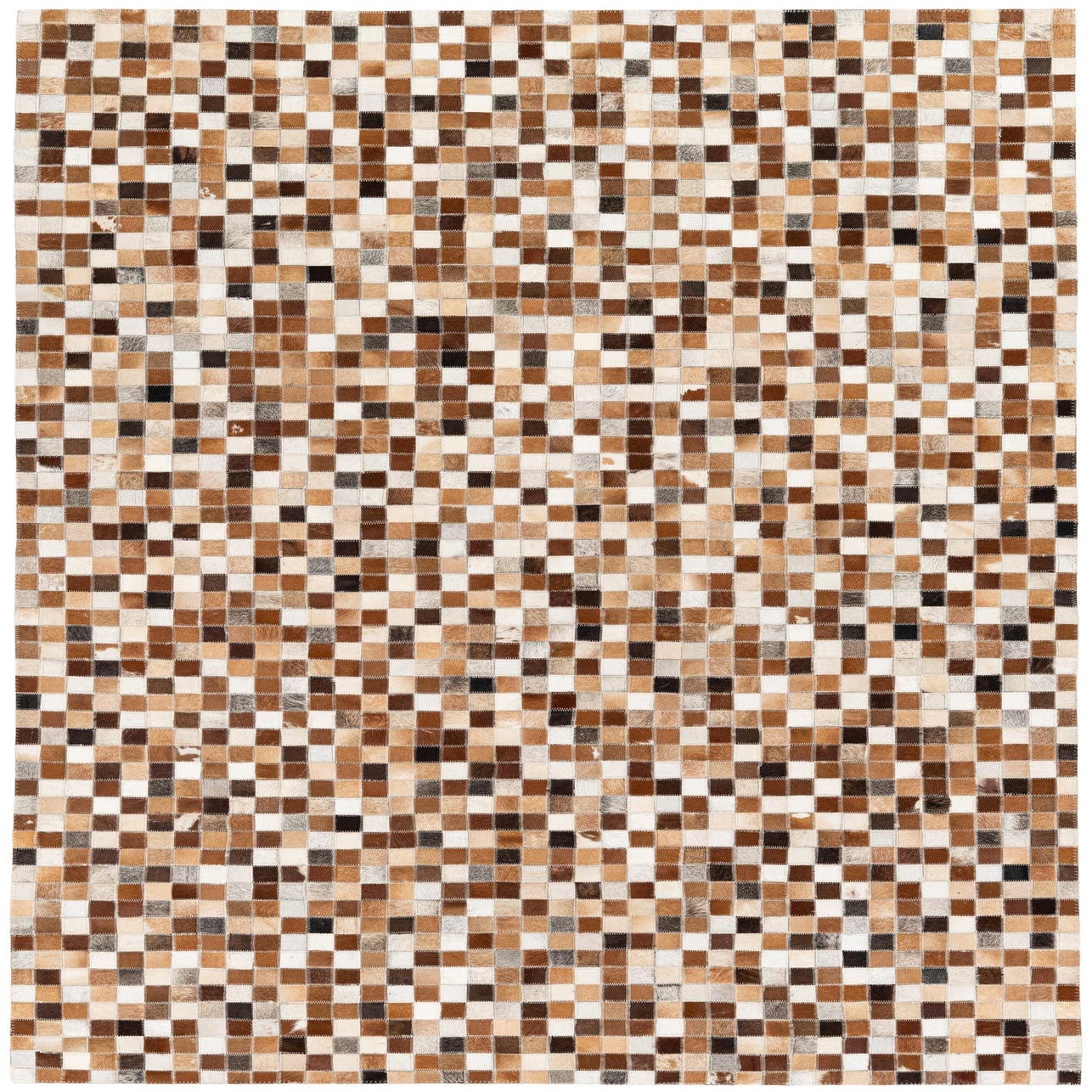 A 5x8 rectangular Cowhide Stocks rug featuring a modern patchwork of multi-colored cowhide and leather squares.