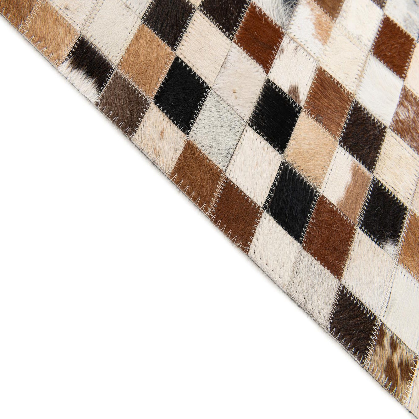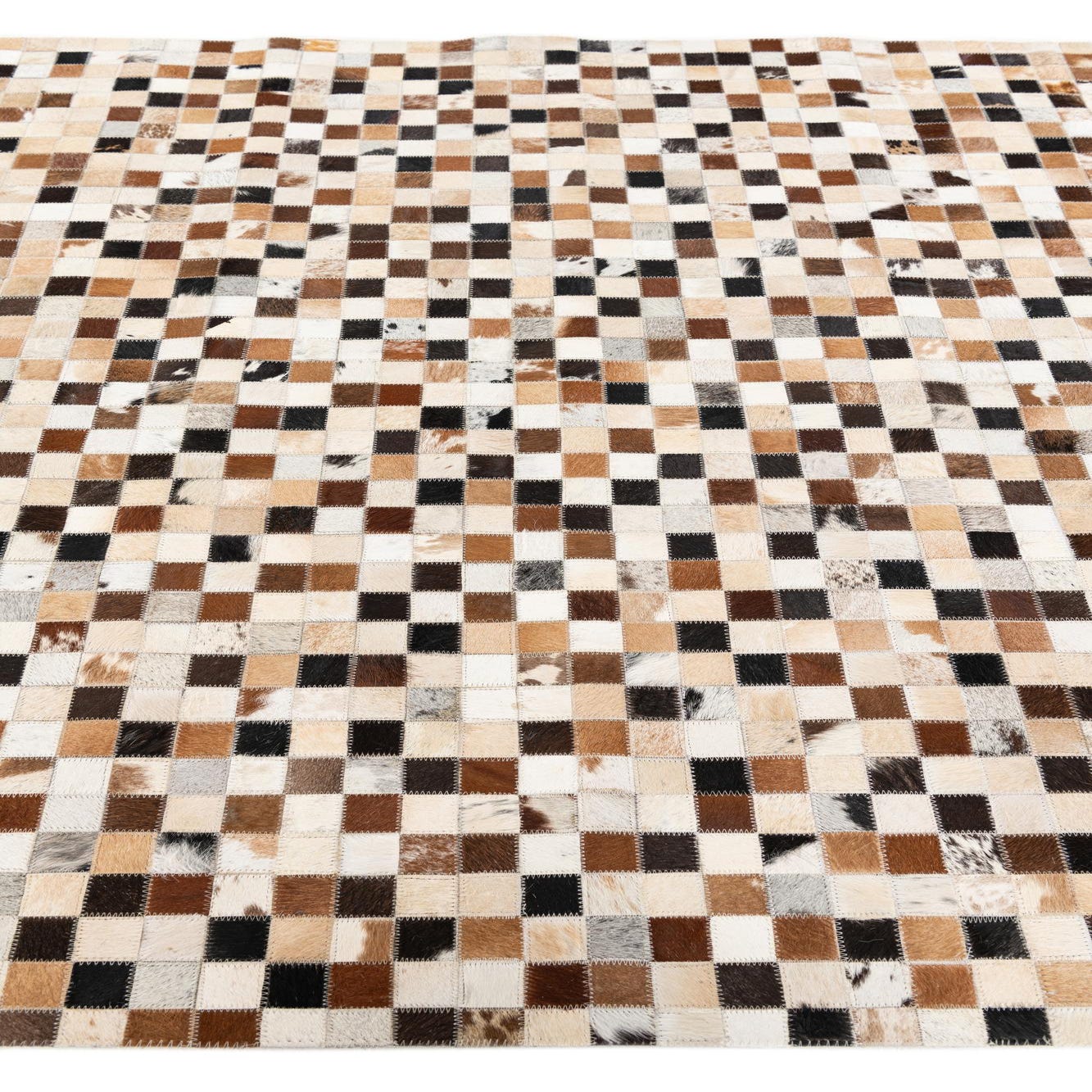 A 5x8 rectangular Cowhide Stocks rug by Rugs.com, featuring a modern patchwork of multi-colored cowhide squares in shades of brown, black, and white.