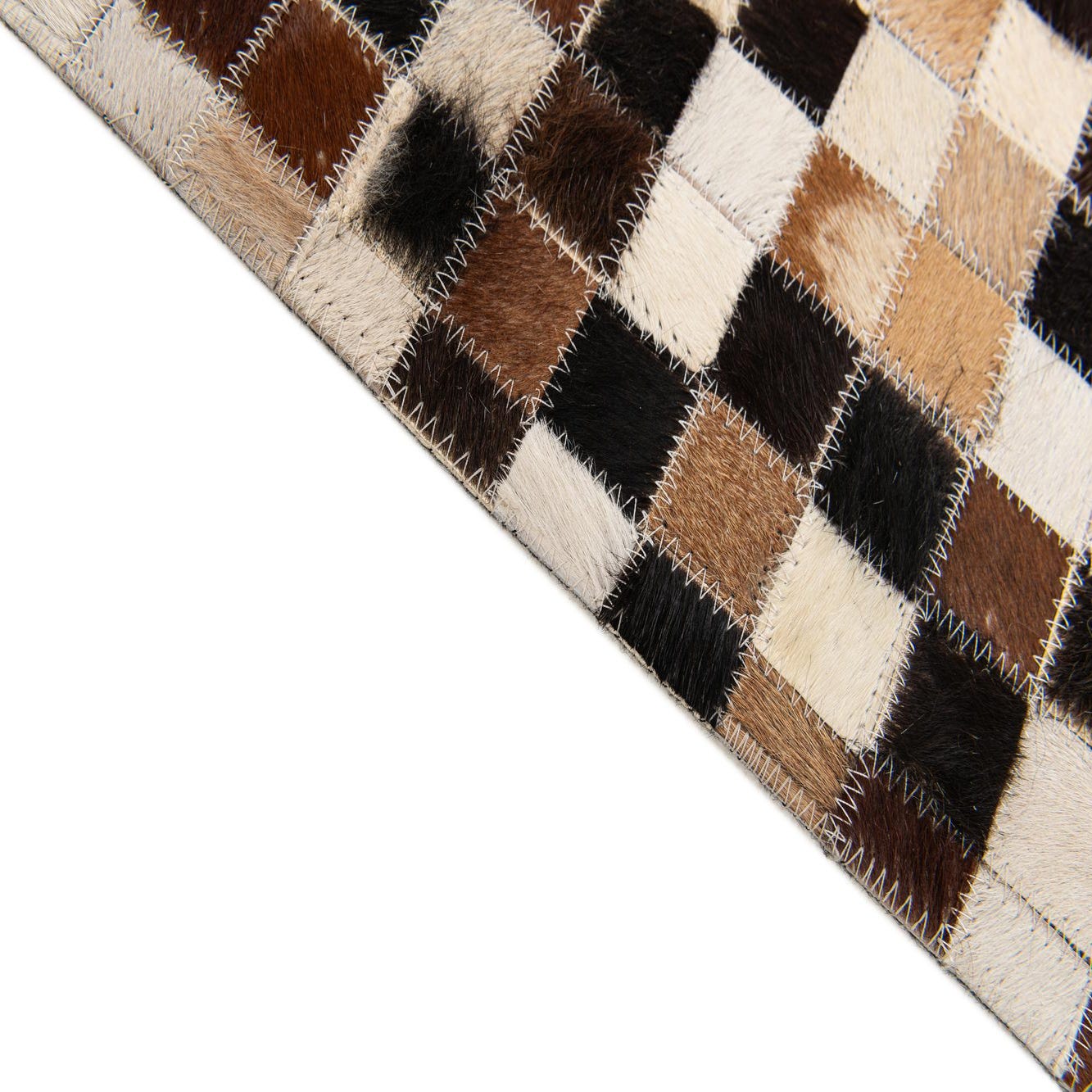 A 5x8 rectangular Cowhide Stocks rug from Rugs.com, featuring a modern multi-colored checkerboard pattern in shades of brown, black, and white.