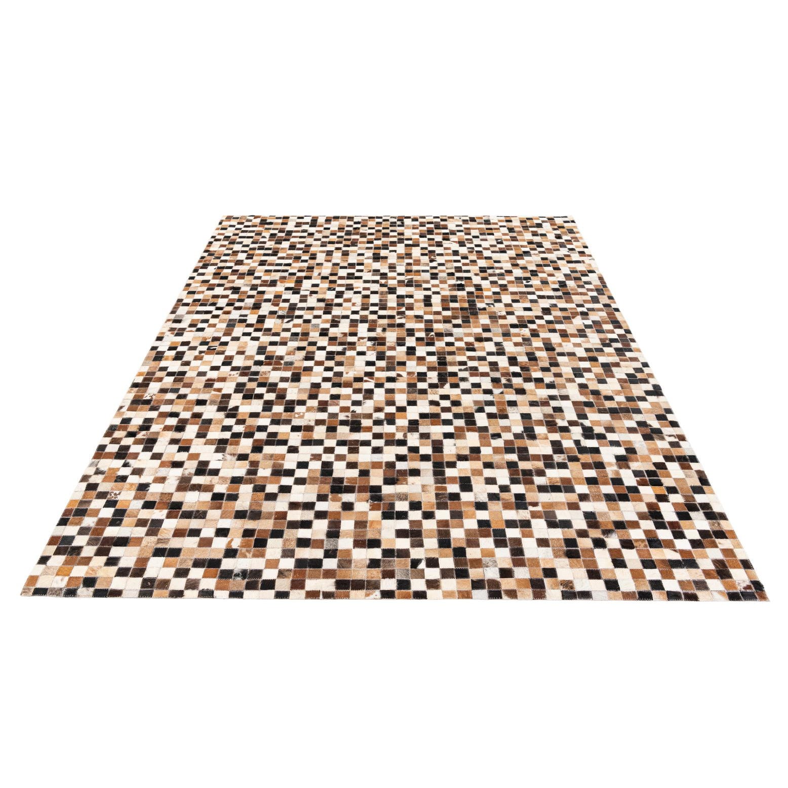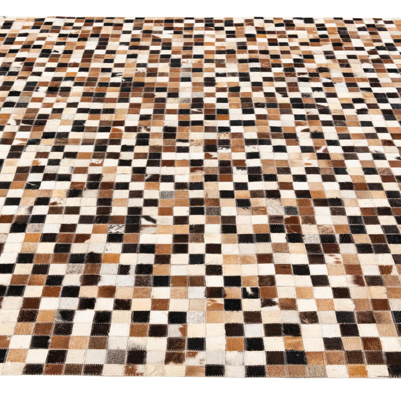 A 5x8 rectangular Cowhide Stocks rug featuring a modern patchwork of multi-colored cowhide squares in shades of brown, black, and white.