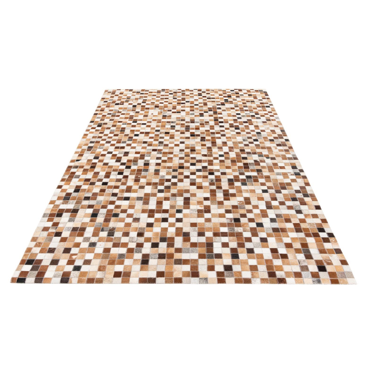 A rectangular 5x8 modern cowhide rug featuring a multi-colored patchwork of brown, white, and black squares.