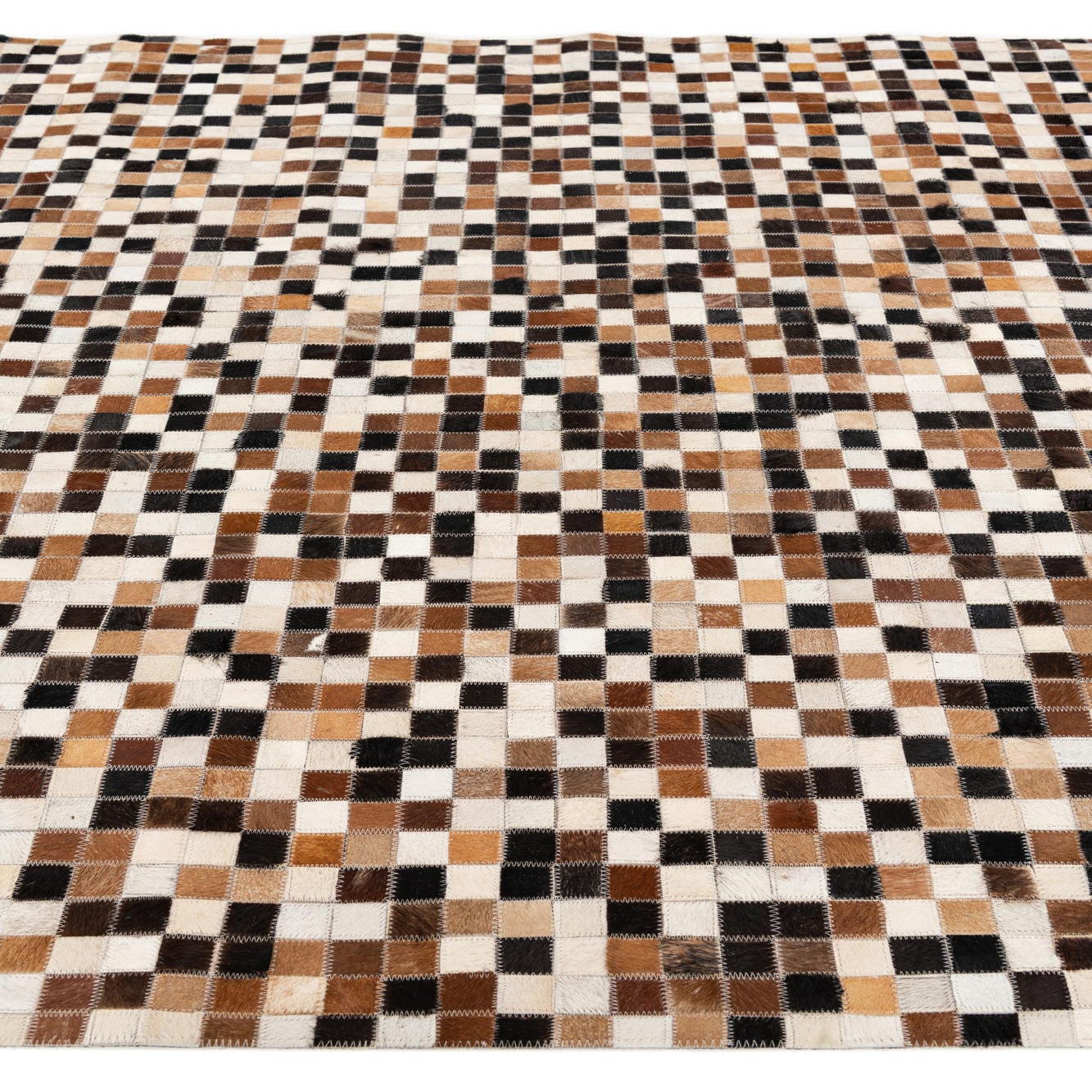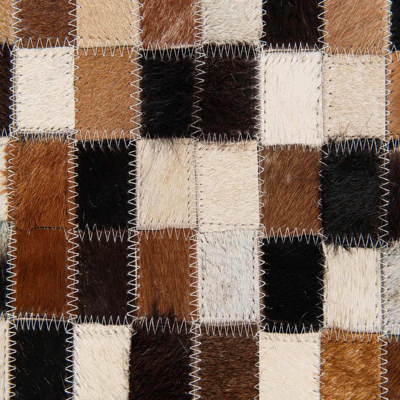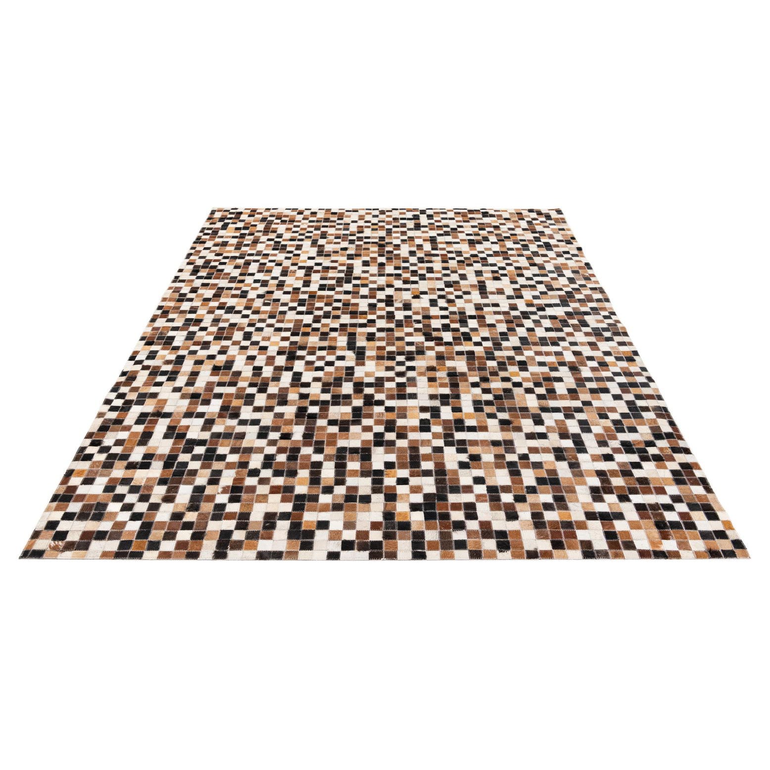 A rectangular 5x8 modern area rug with a mosaic pattern of multi-colored cowhide and leather squares.