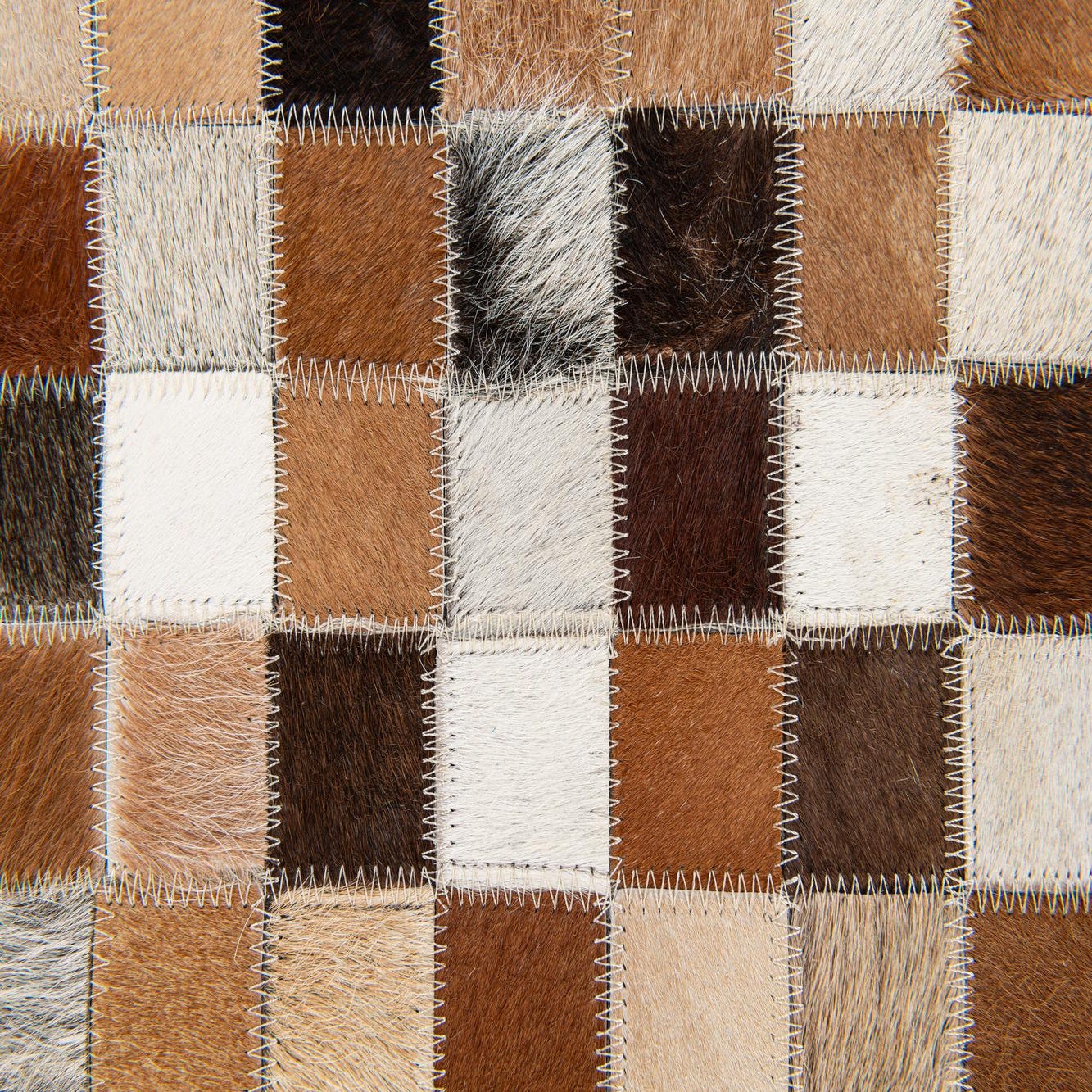 A 5x8 rectangular Cowhide Stocks rug featuring a modern patchwork of multi-colored squares in various shades of brown, black, and white.