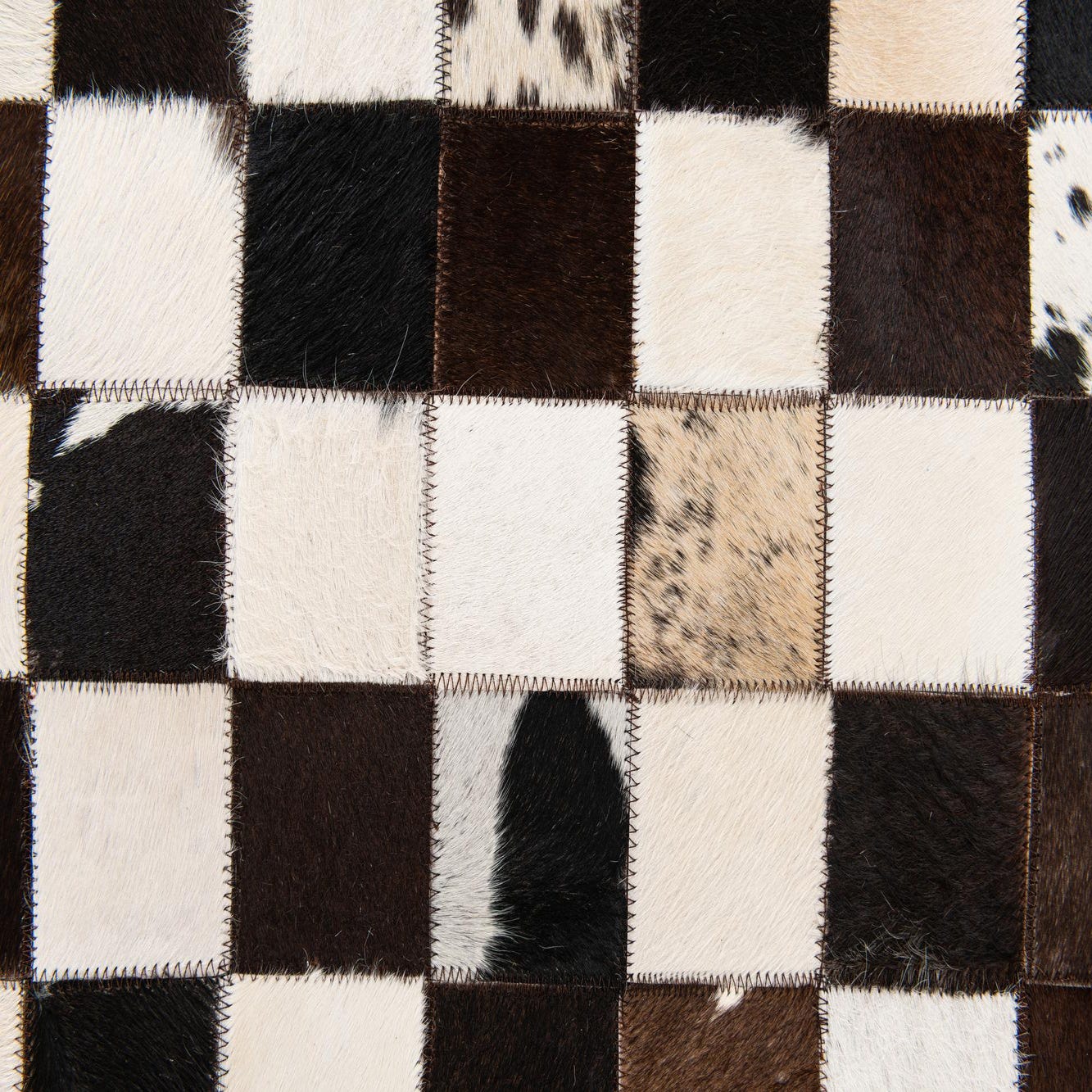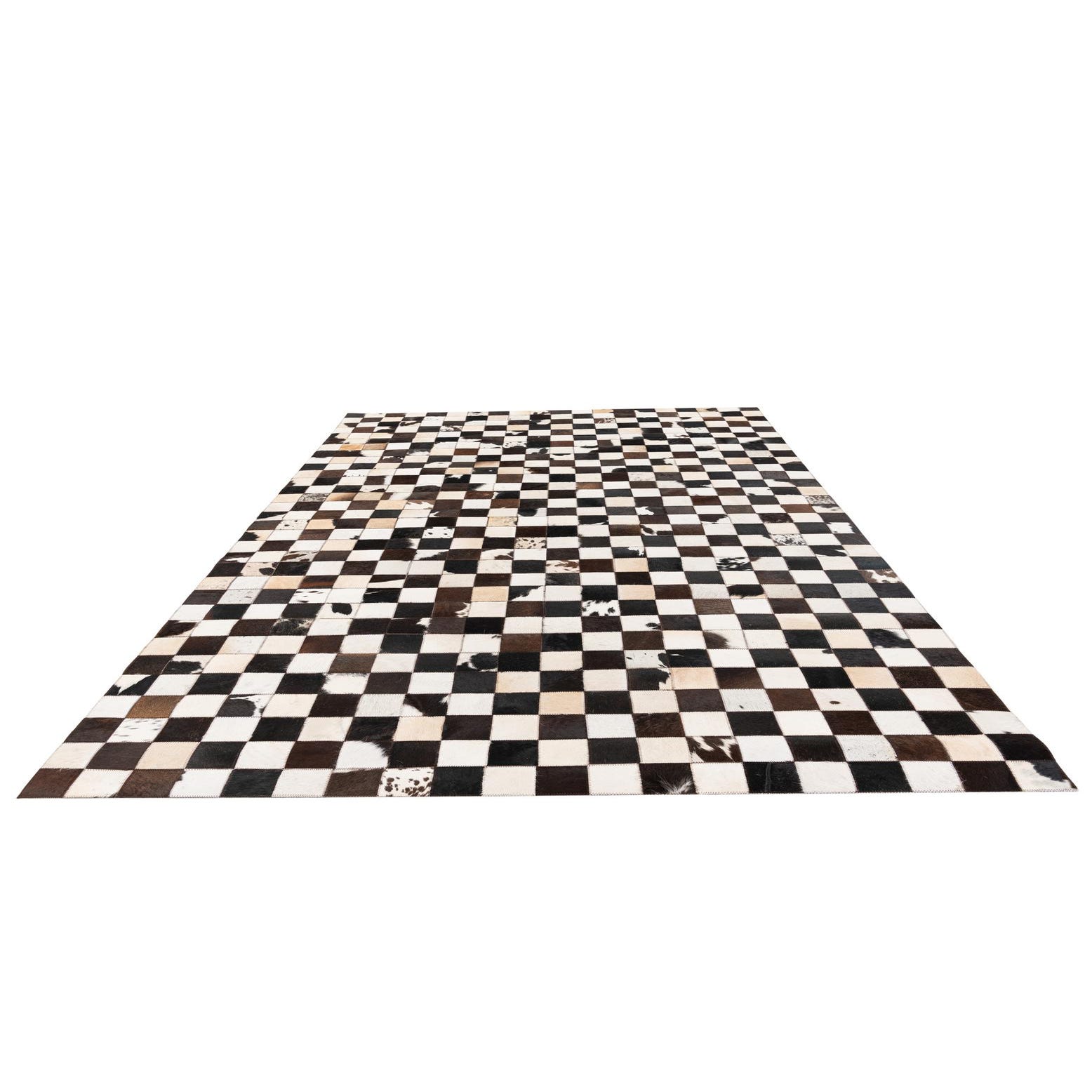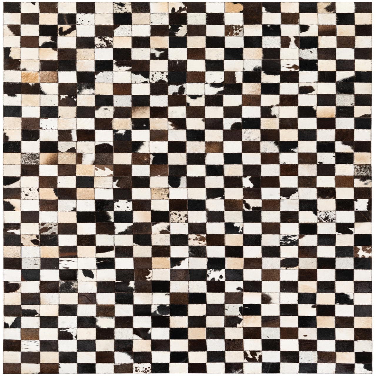 A 5x8 rectangular Cowhide Stocks rug from Rugs.com with a modern checkerboard pattern in multi-colored natural cowhide patches.