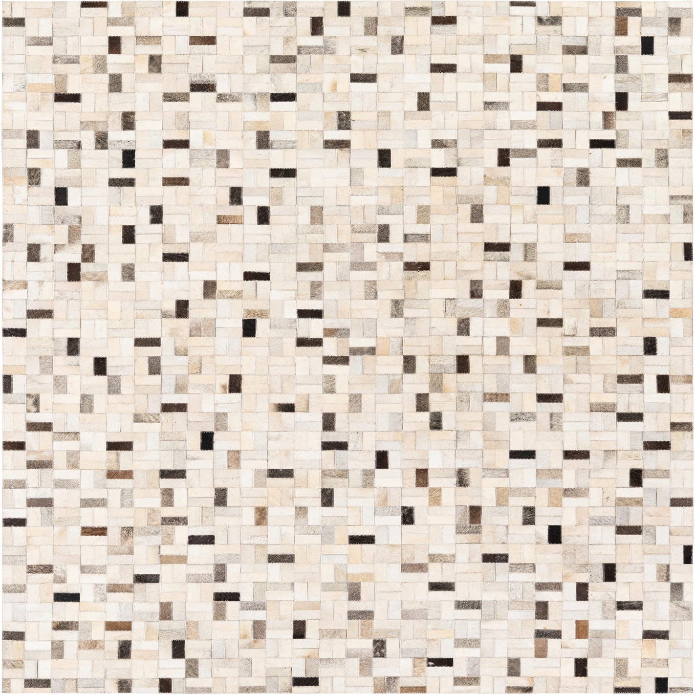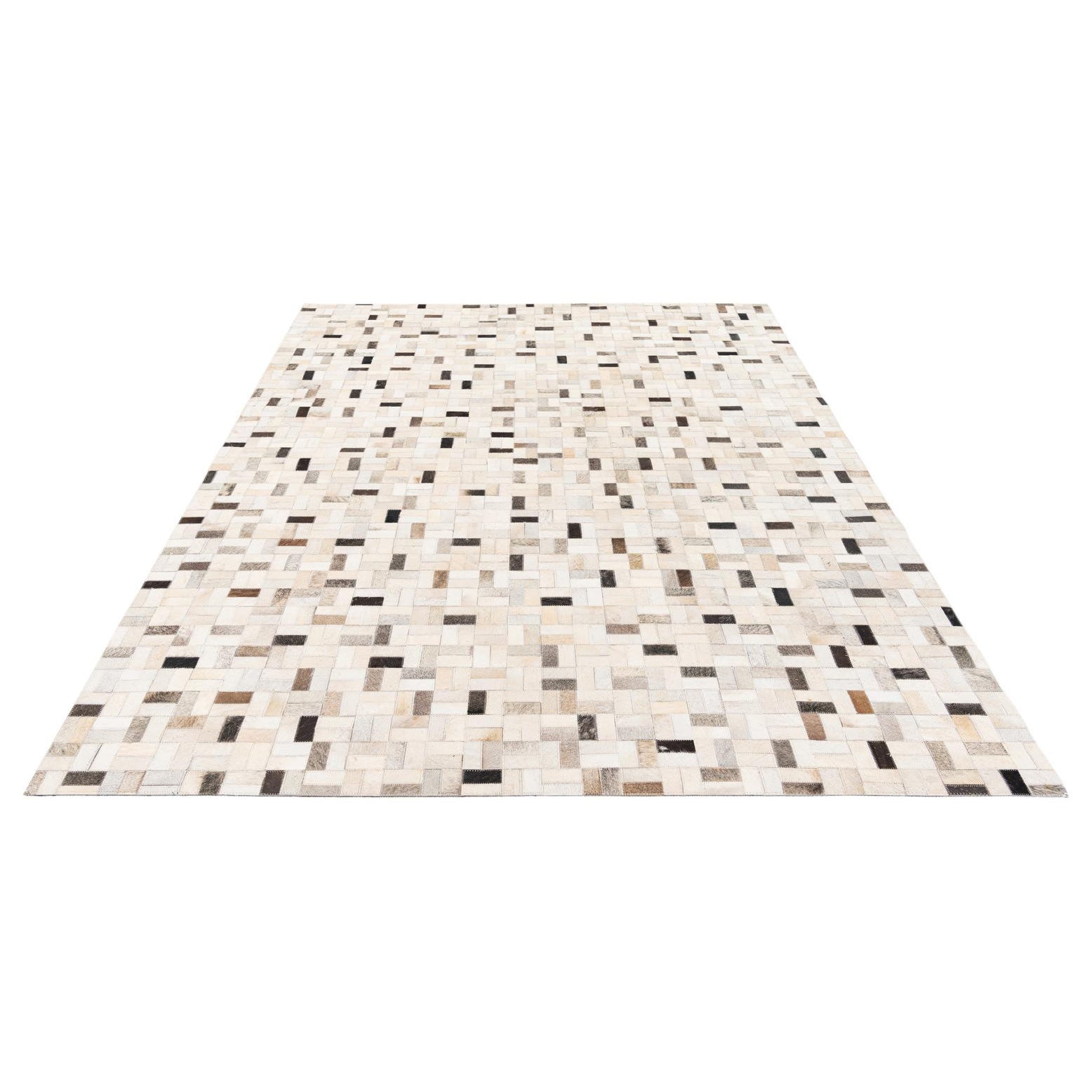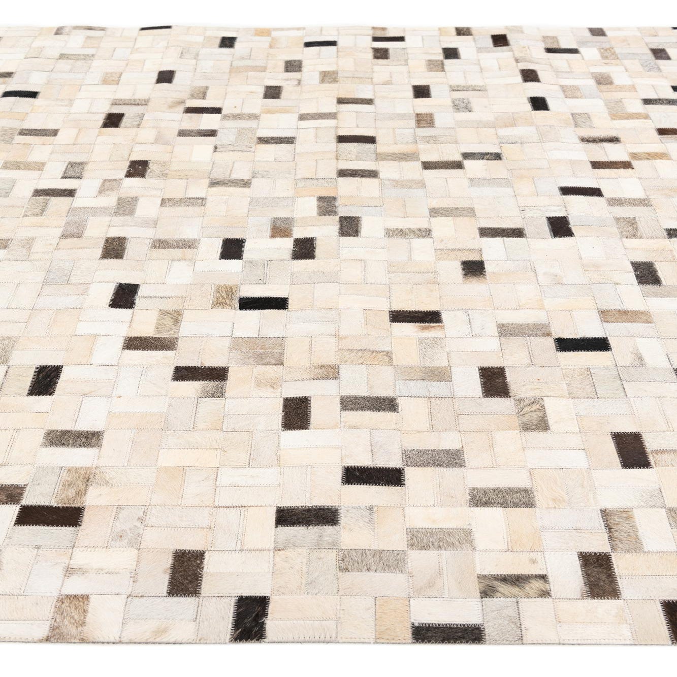 A 5x8 rectangular Cowhide Stocks rug featuring a modern patchwork of multi-colored cowhide and leather squares.