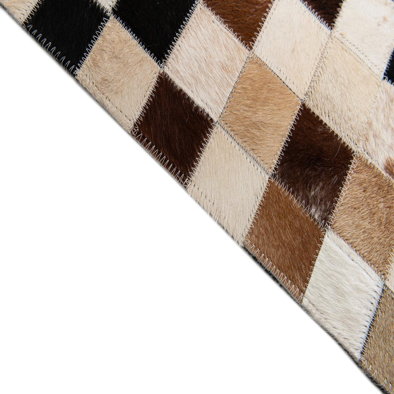 A 5x8 rectangular Cowhide Stocks rug featuring a modern checkerboard pattern in multi-colored natural cowhide patches.
