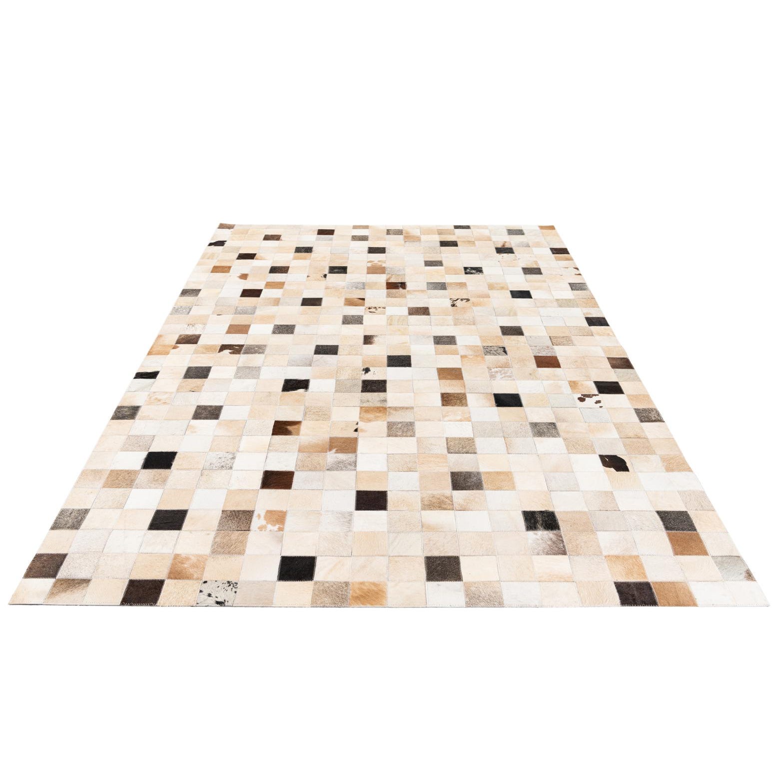 A rectangular 5x8 modern cowhide rug with a patchwork design in various shades of brown, beige, cream, and black.