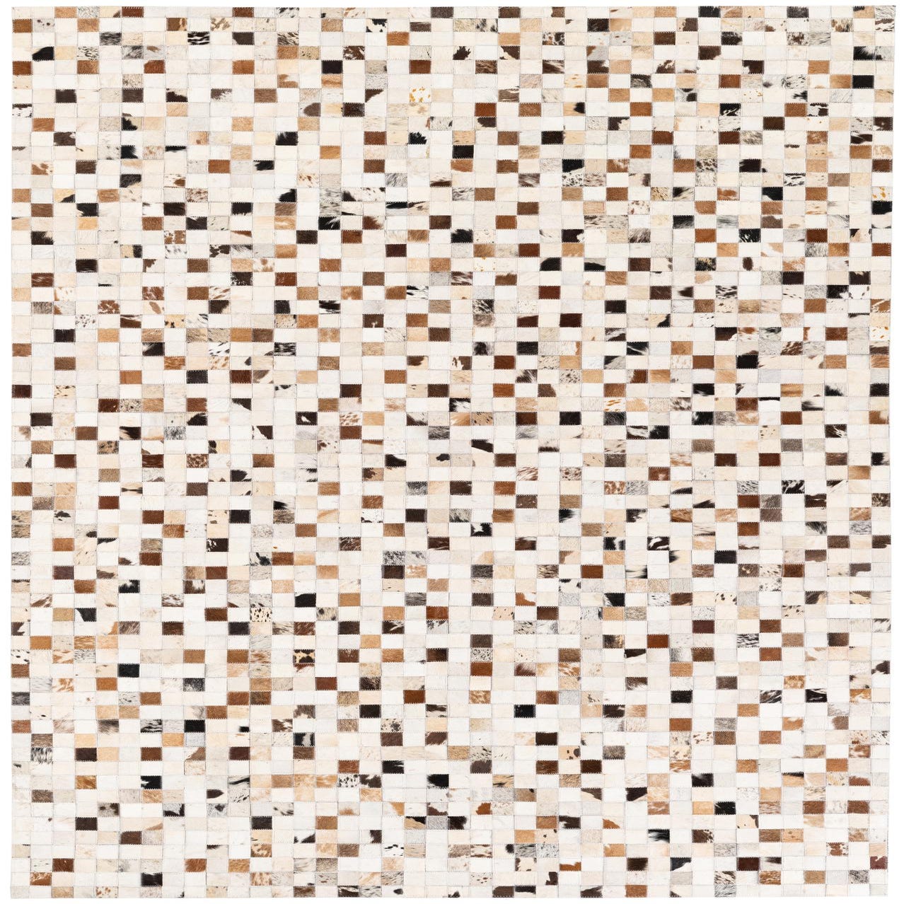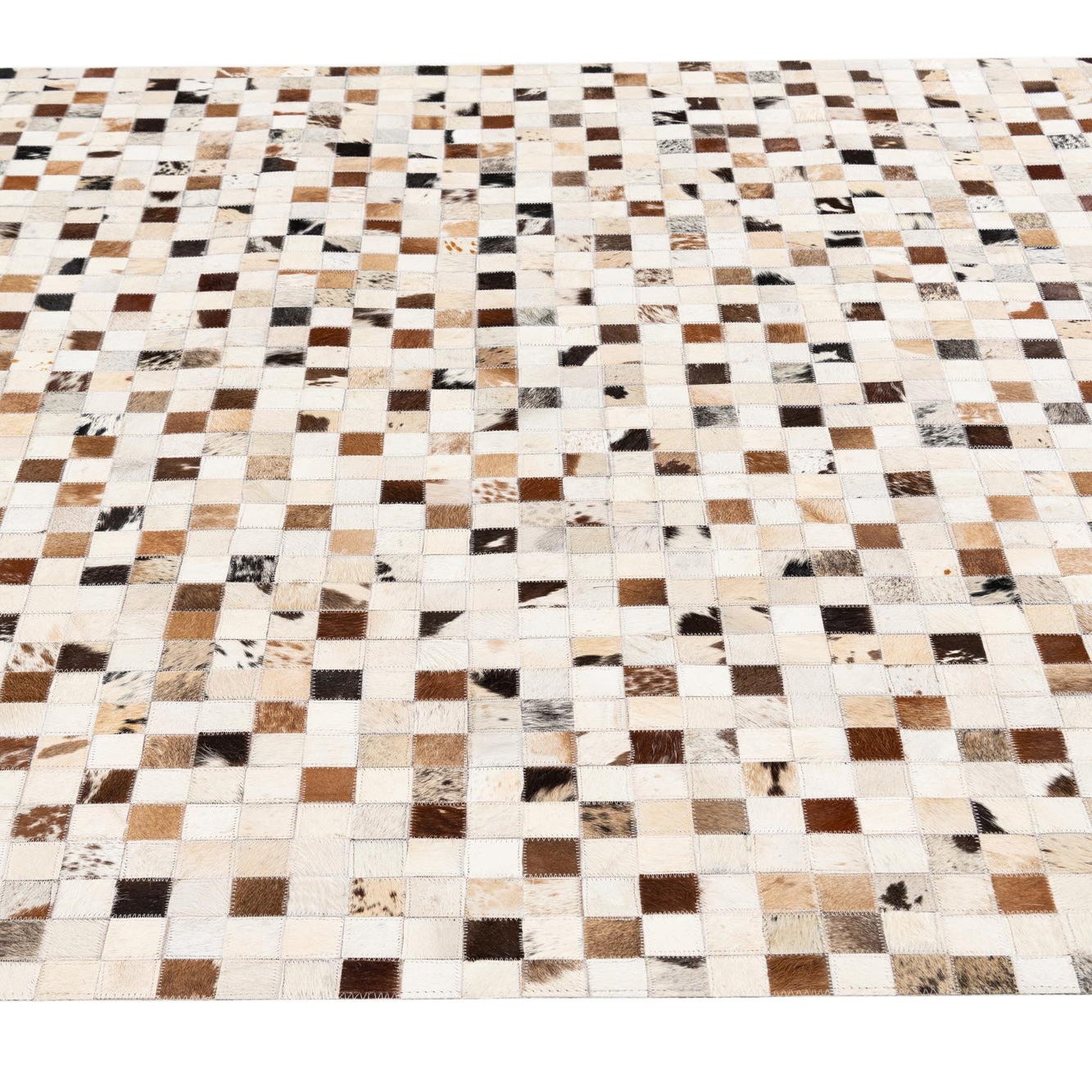 A 5x8 rectangular Cowhide Stocks rug by Rugs.com, featuring a modern patchwork of multi-colored cowhide squares in various natural brown, black, and white tones.