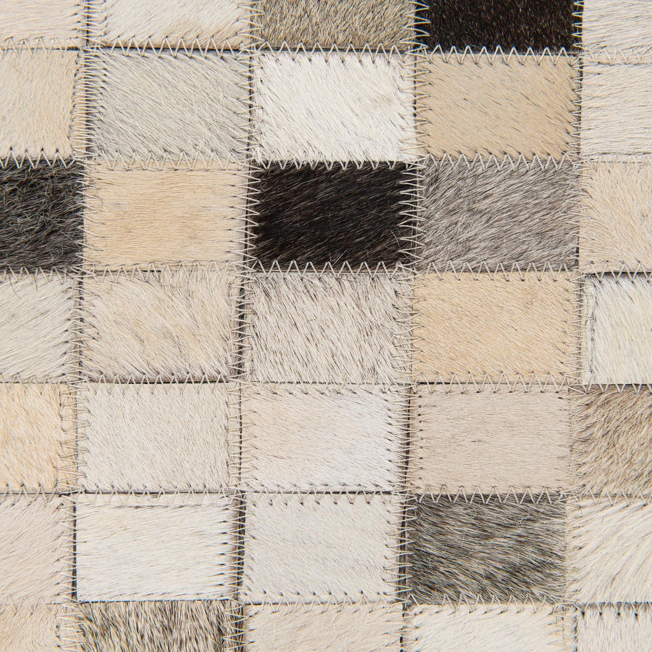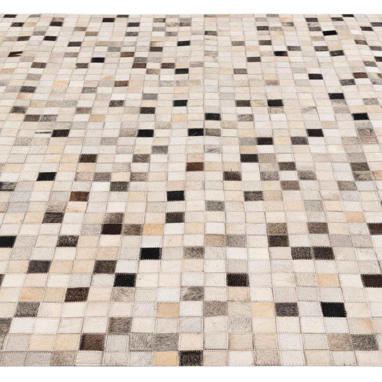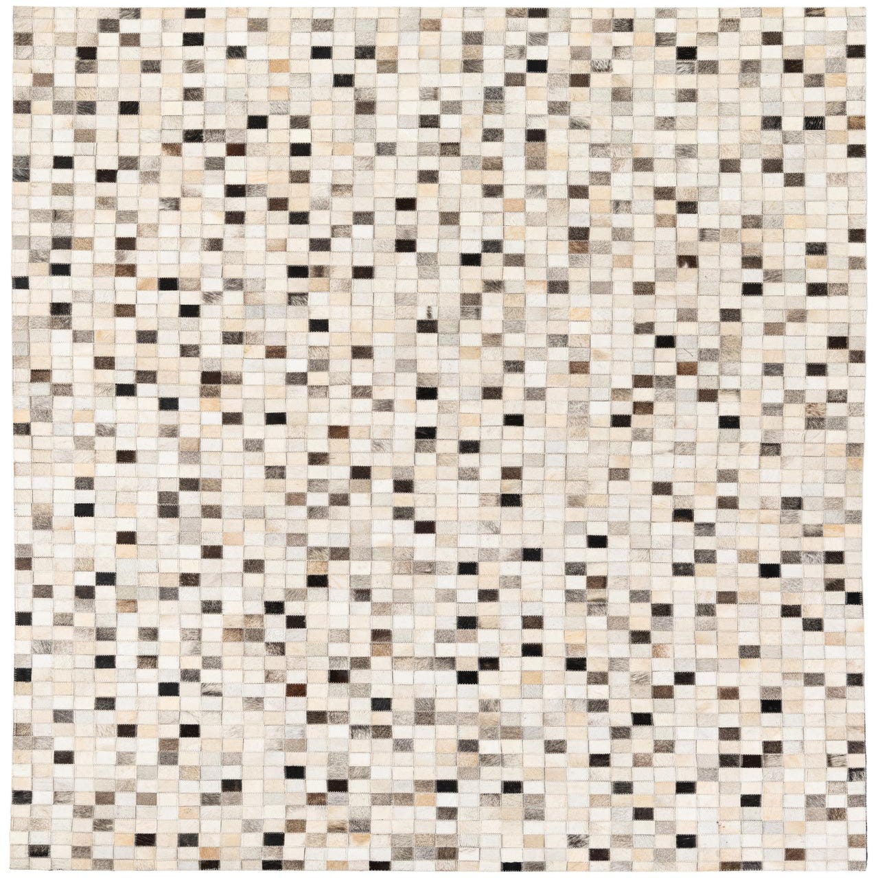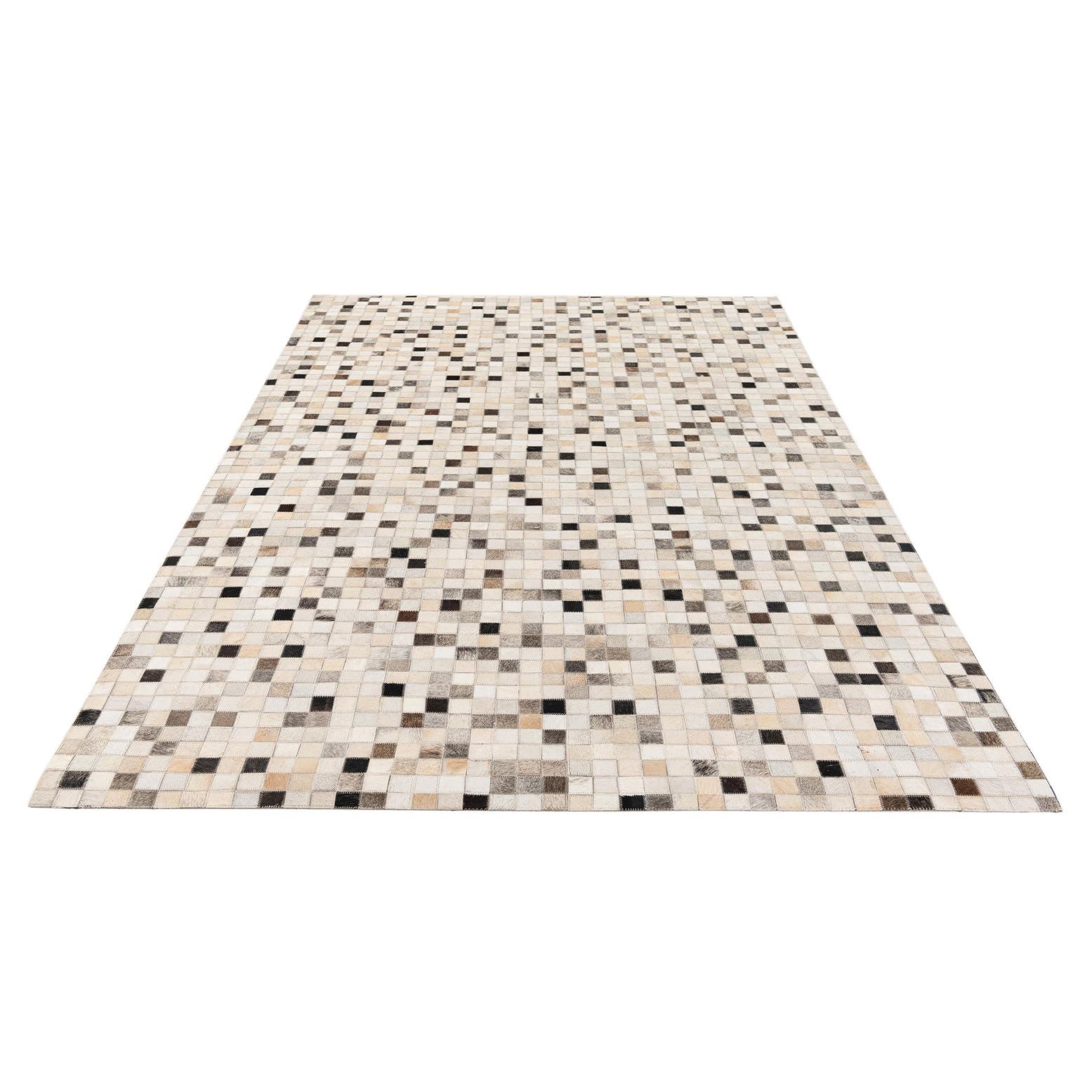 Hand-made from cowhide and leather, this rug presents a tightly stitched patchwork of small square tiles that form a refined, pixel-like pattern. The multi background is built from a palette of ivory, beige, tan, brown and black patches that create a balanced, tonal surface with just enough contrast to read as both calm and lively. The hand-stitched seams give the design a subtle grid and the hair-on-hide finish offers a slight nap and natural texture you can feel underfoot.