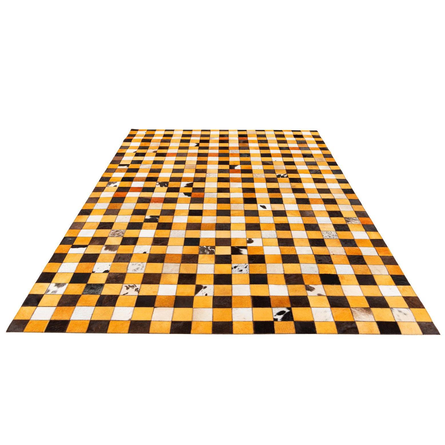 This handmade cowhide and leather rug is suited to a range of interiors: place it beneath a coffee table in a contemporary living room to anchor the seating area, layer it over hardwood in a home office for visual warmth, or set it in an entry or dining space to introduce texture and pattern. Pair with warm wood furniture, black metal details, or simple mid-century pieces to let the checkerboard pattern and natural hide variations take center stage.
