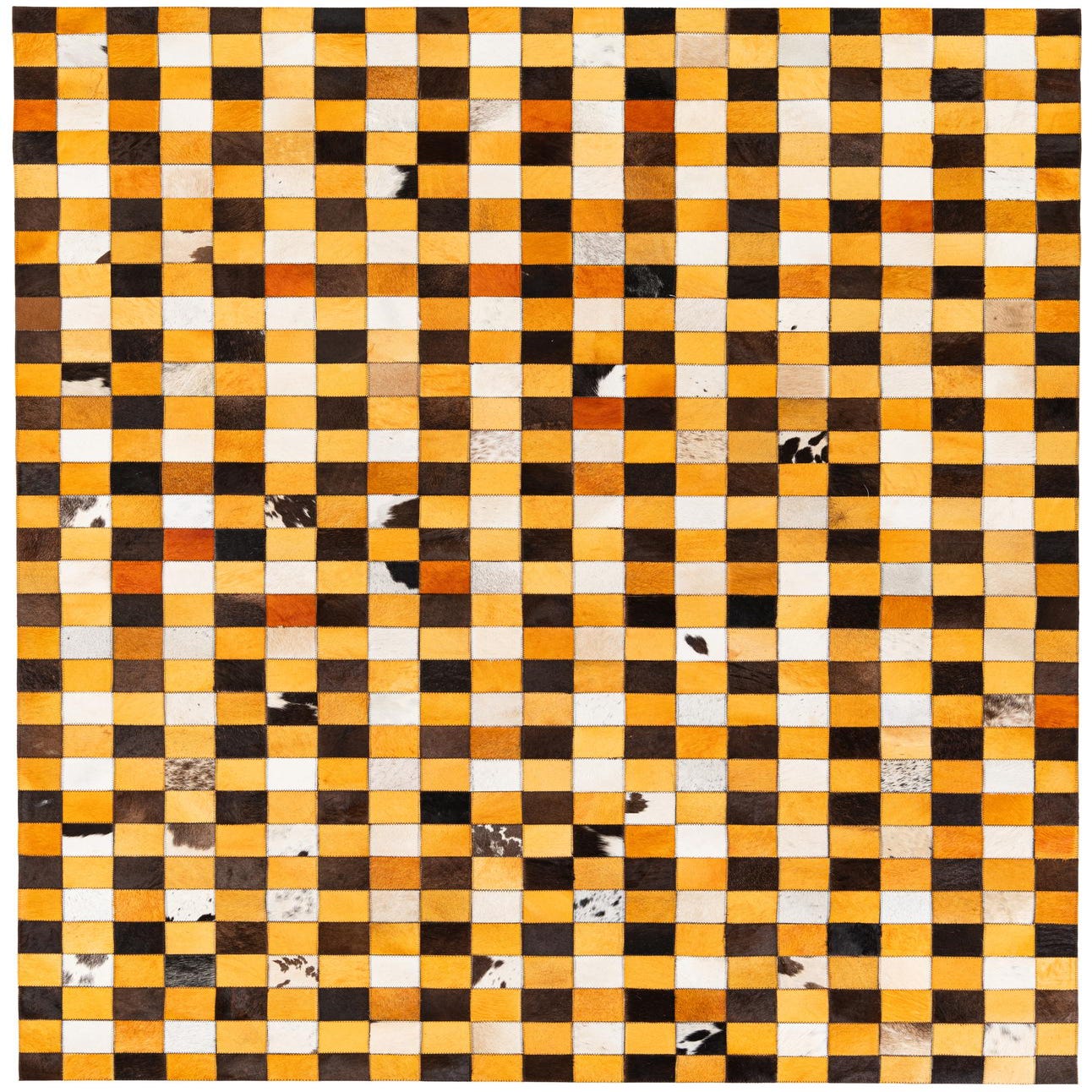 A 5x8 rectangular, multi-colored modern cowhide rug with a checkerboard pattern of brown, orange, white, and black squares.