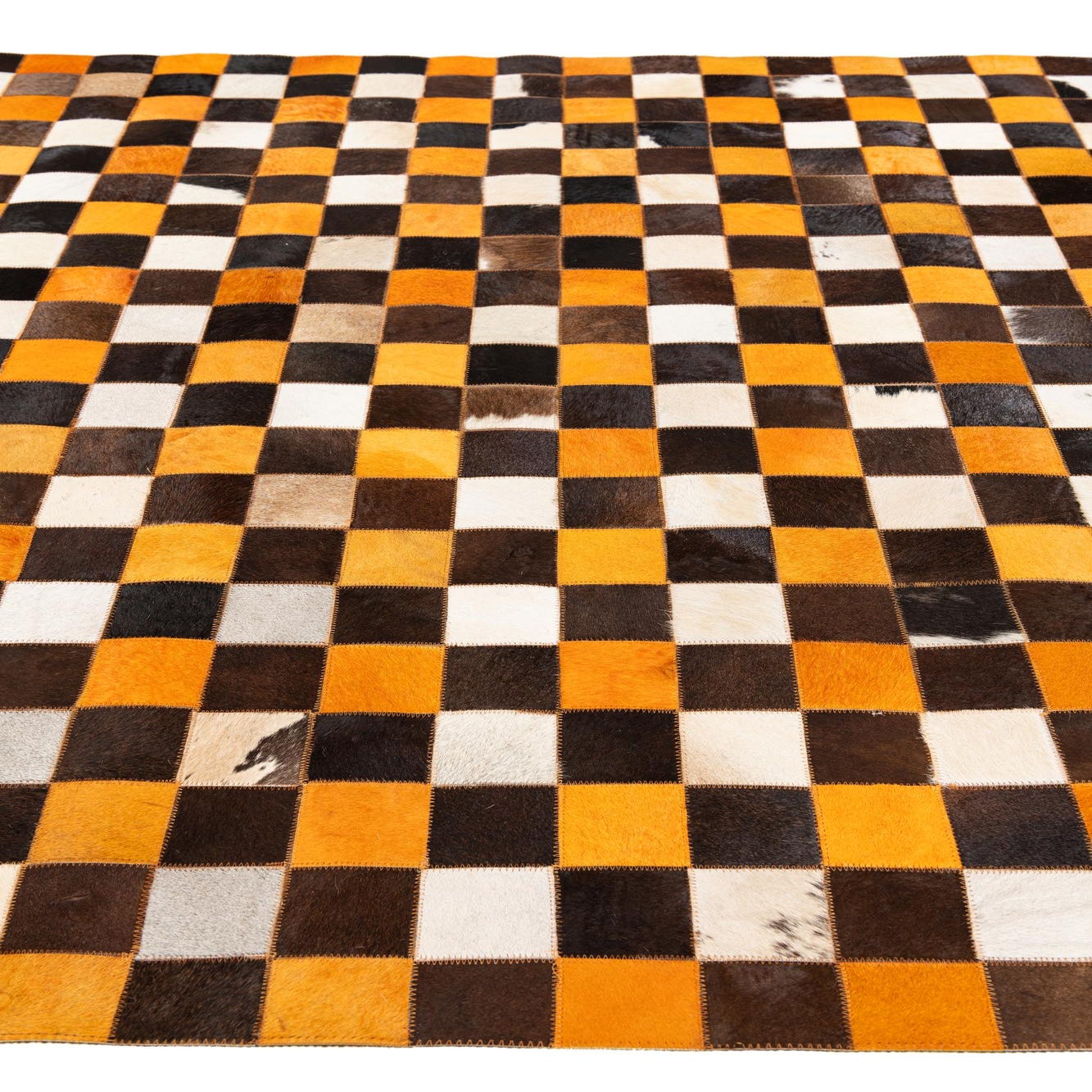 A 5x8 rectangular Cowhide Stocks rug featuring a modern checkerboard pattern in multi-colored patches of cowhide and leather.