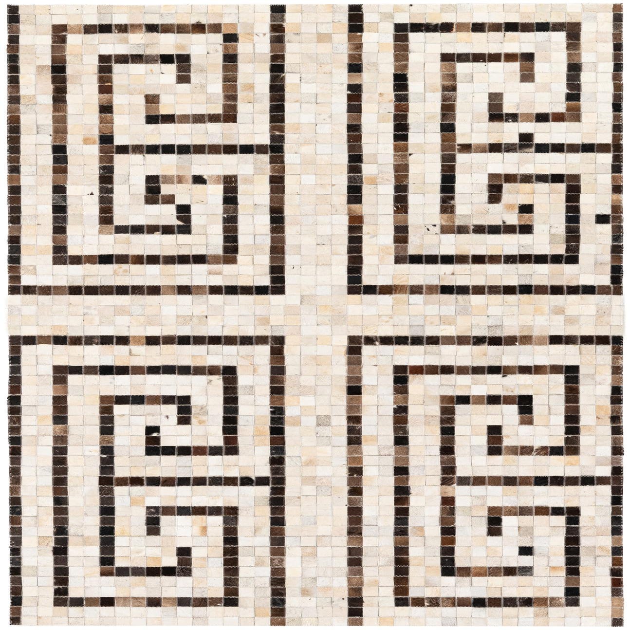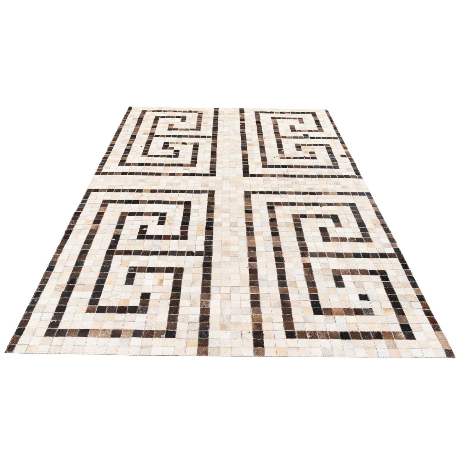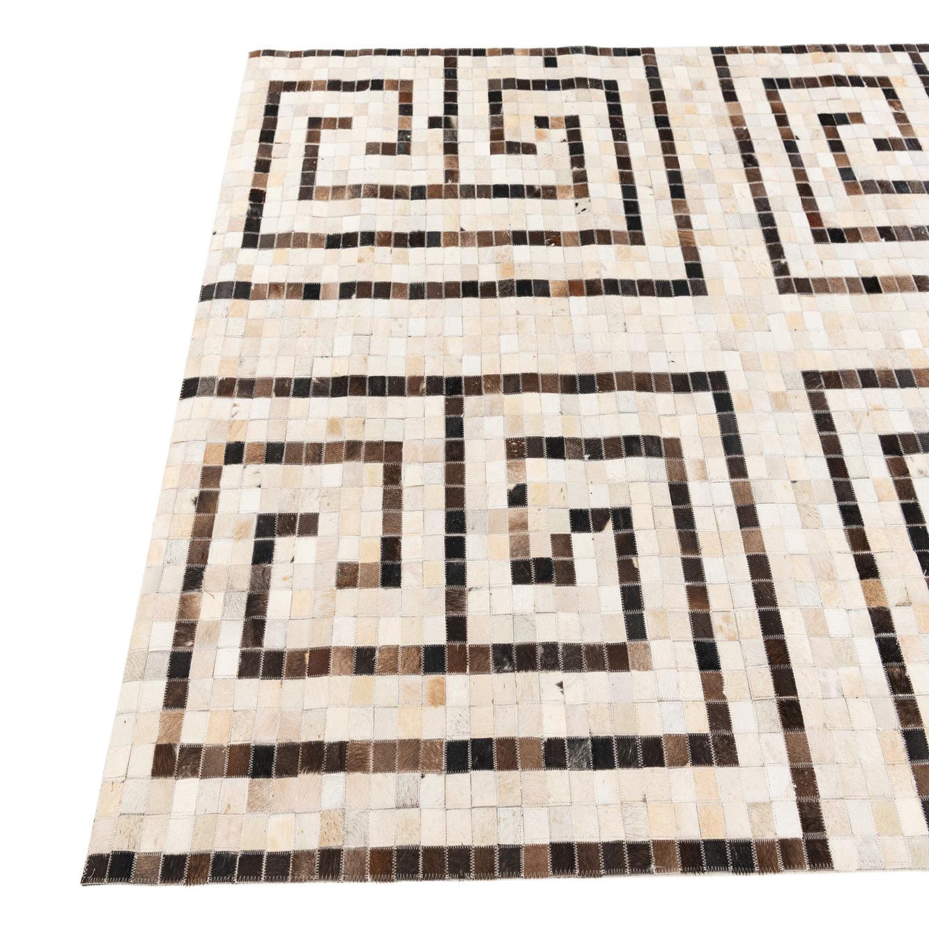 A 5x8 rectangular Cowhide Stocks rug by Rugs.com, featuring a modern geometric maze pattern in multi-colored cowhide squares, ideal for a living room.