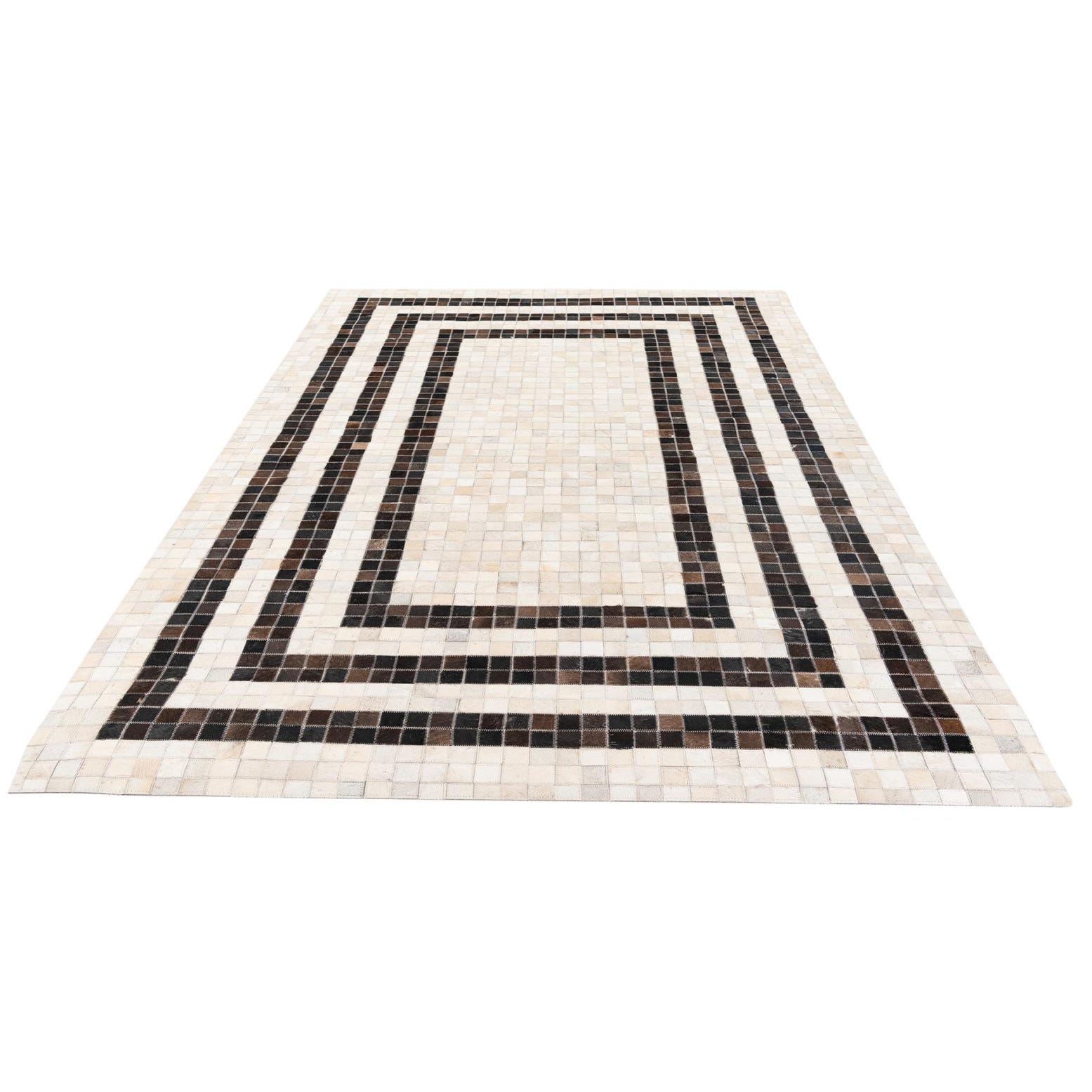 A 5x8 rectangular Cowhide Stocks rug featuring a multi-colored patchwork design with a geometric border, ideal for a living room.