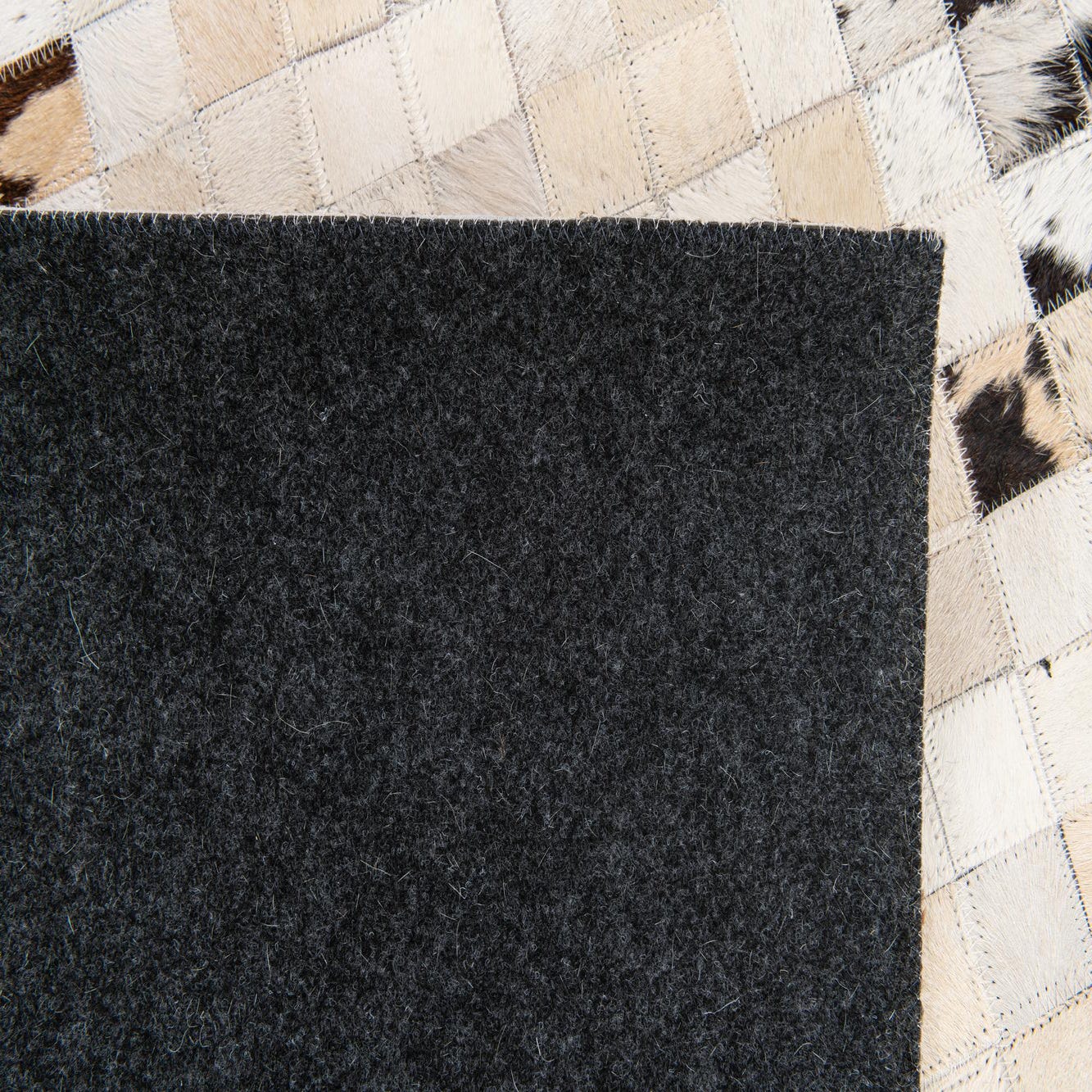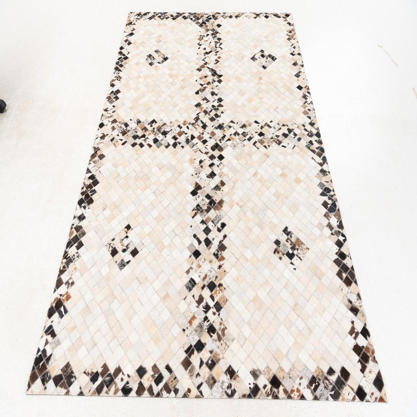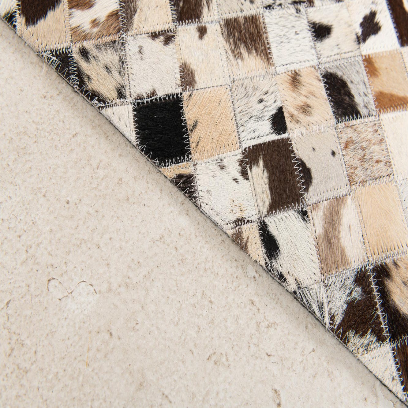 Hand-stitched panels of cowhide form a subtle geometric mosaic: small square patches create a faint cross and quadrant motif with tiny diamond accents that break up the field. The background is multi-tonal, anchored by ivory and beige patches, while black, brown and gray hairs add contrast and visual depth. The artisanal patchwork reads as a contemporary, organic pattern that pairs neutral calm with lively, natural markings.