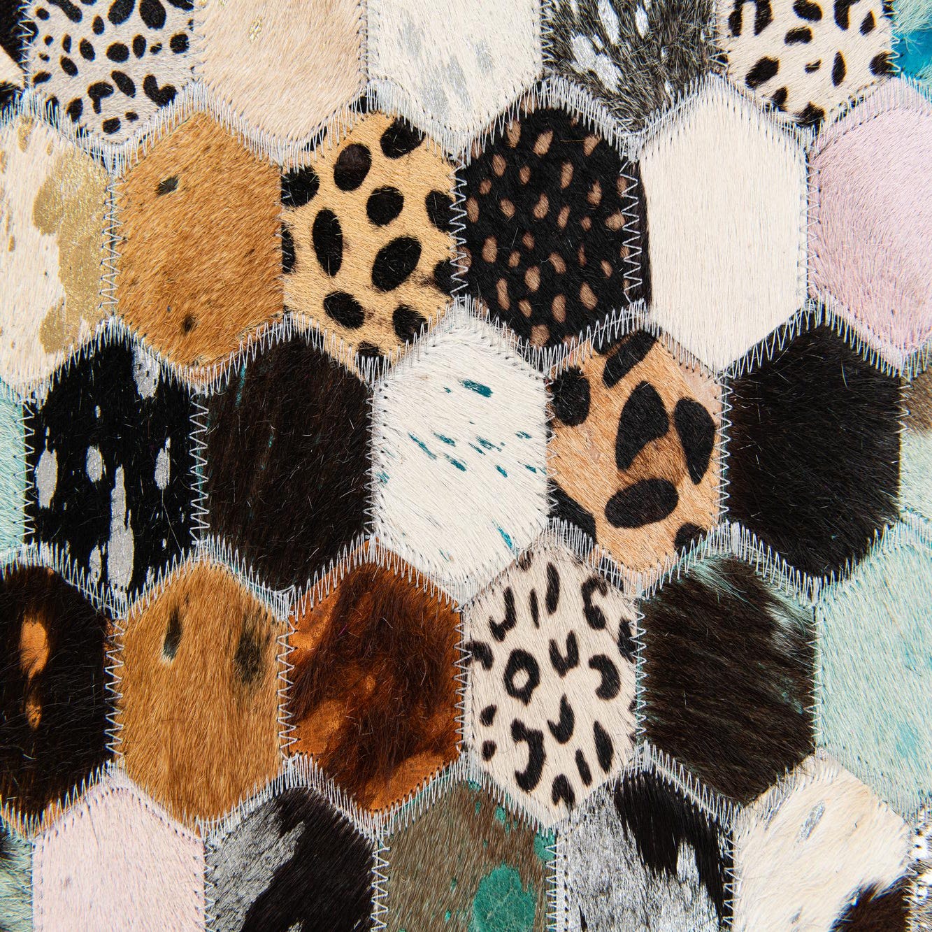 A vibrant 5x8 rectangular rug featuring a modern honeycomb pattern made from multi-colored cowhide and leather patches.