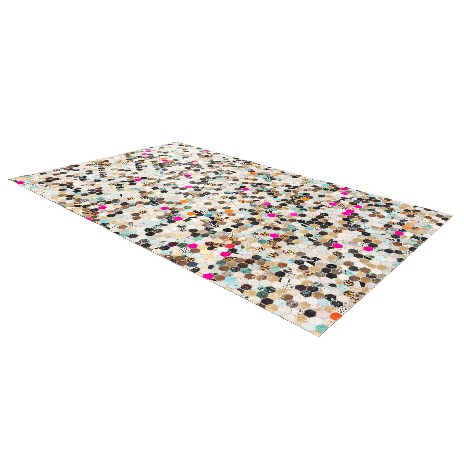 A rectangular 5x8 modern multi-colored cowhide rug with a mosaic of hexagonal patches in various animal prints and solid bright colors.