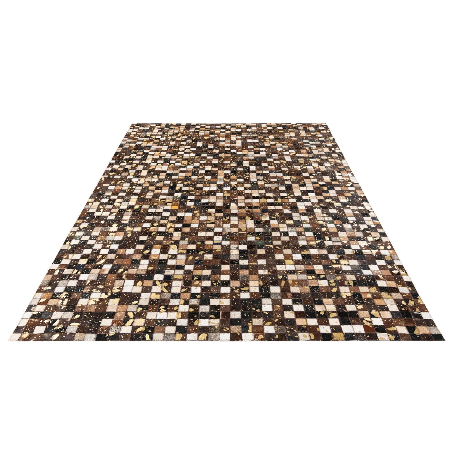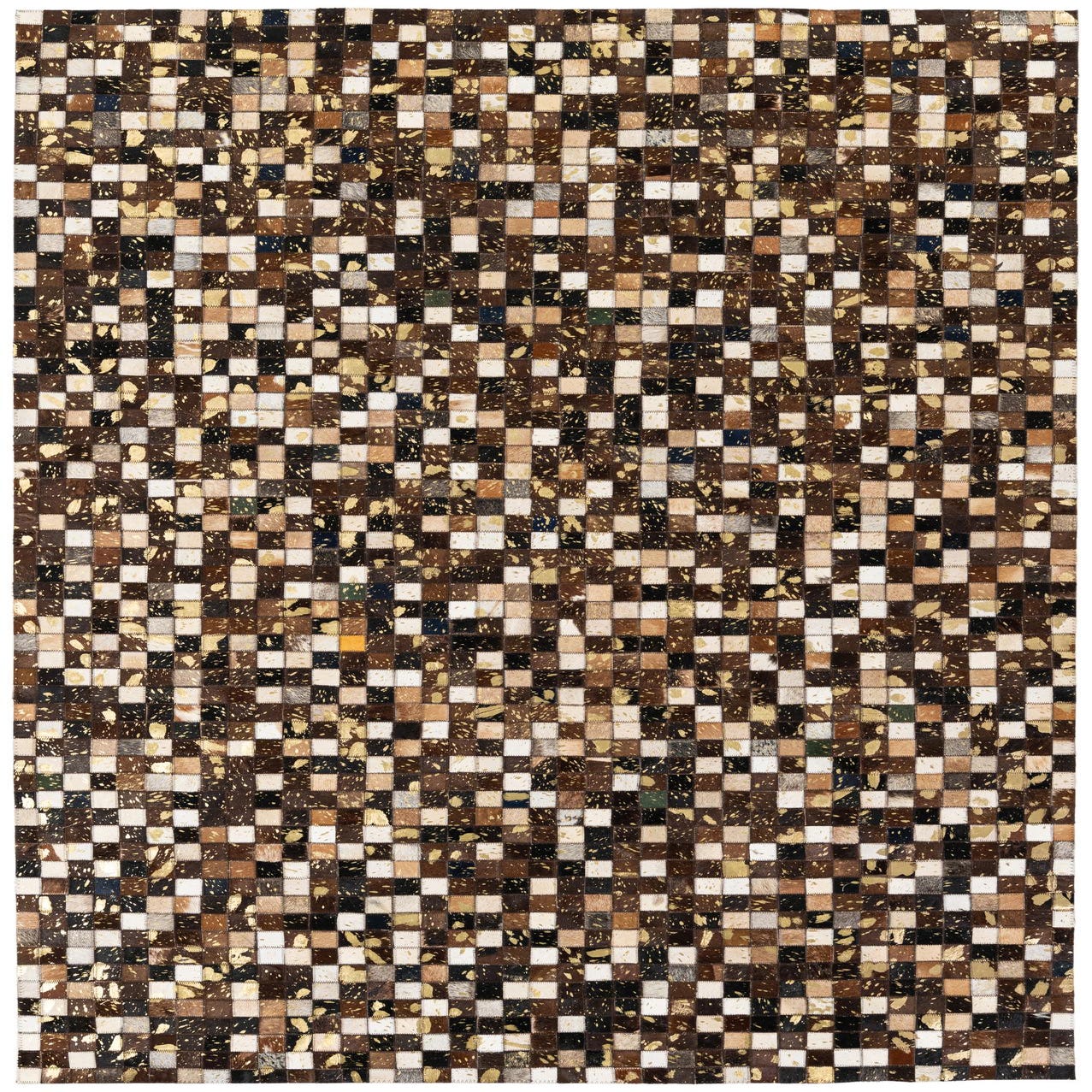 A rectangular 5x8 modern multi-colored cowhide and leather rug with a checkered pattern, featuring shades of brown, black, white, and gold.