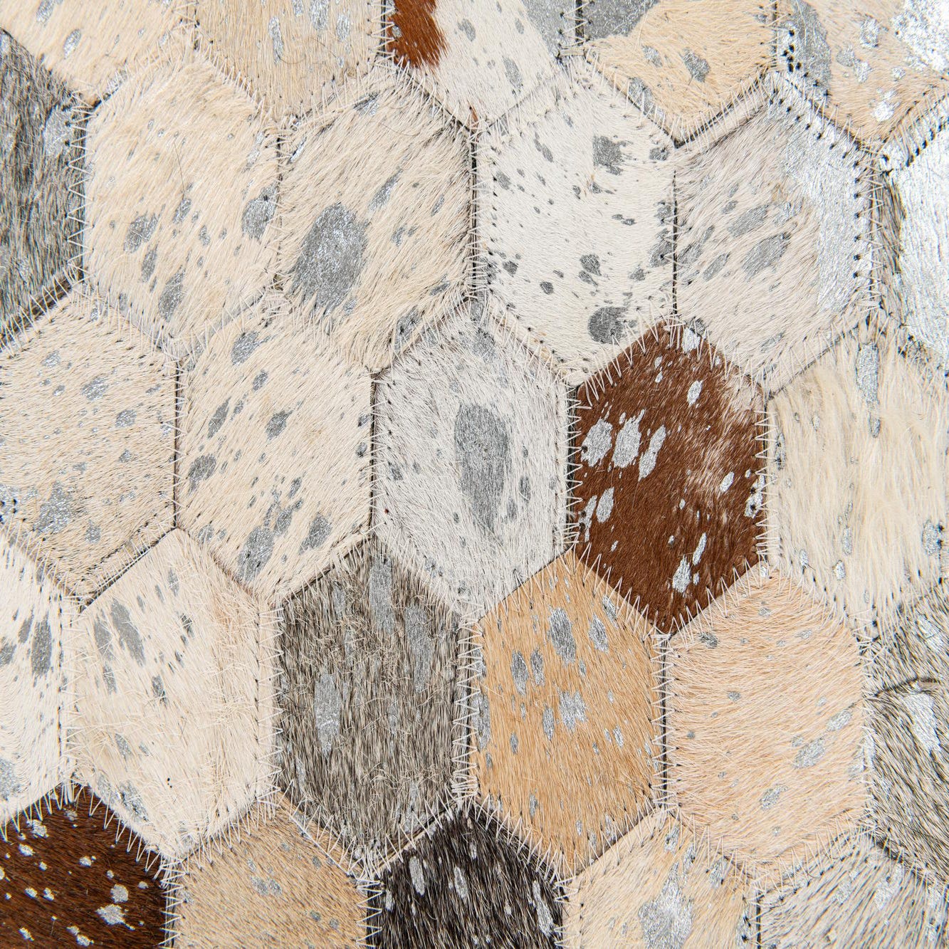 A 5x8 rectangular Cowhide Stocks rug featuring a modern honeycomb pattern in multi-colored natural cowhide and leather.