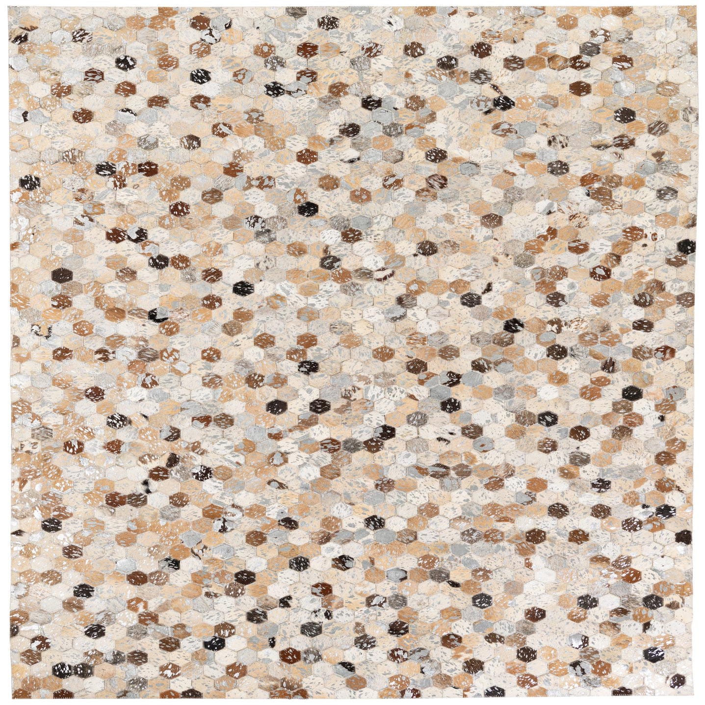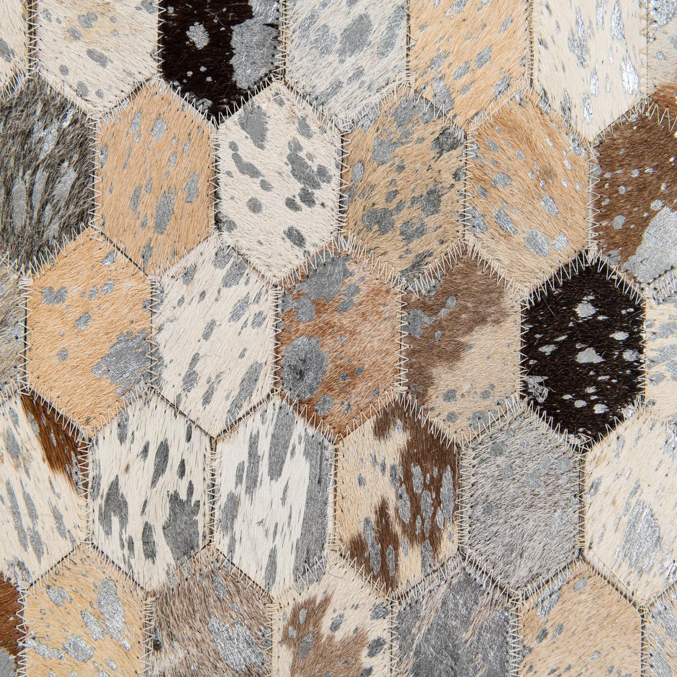 A rectangular 5x8 modern multi-colored cowhide rug with a mosaic of hexagonal patches in varying natural tones.