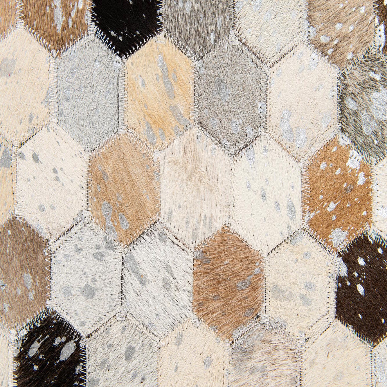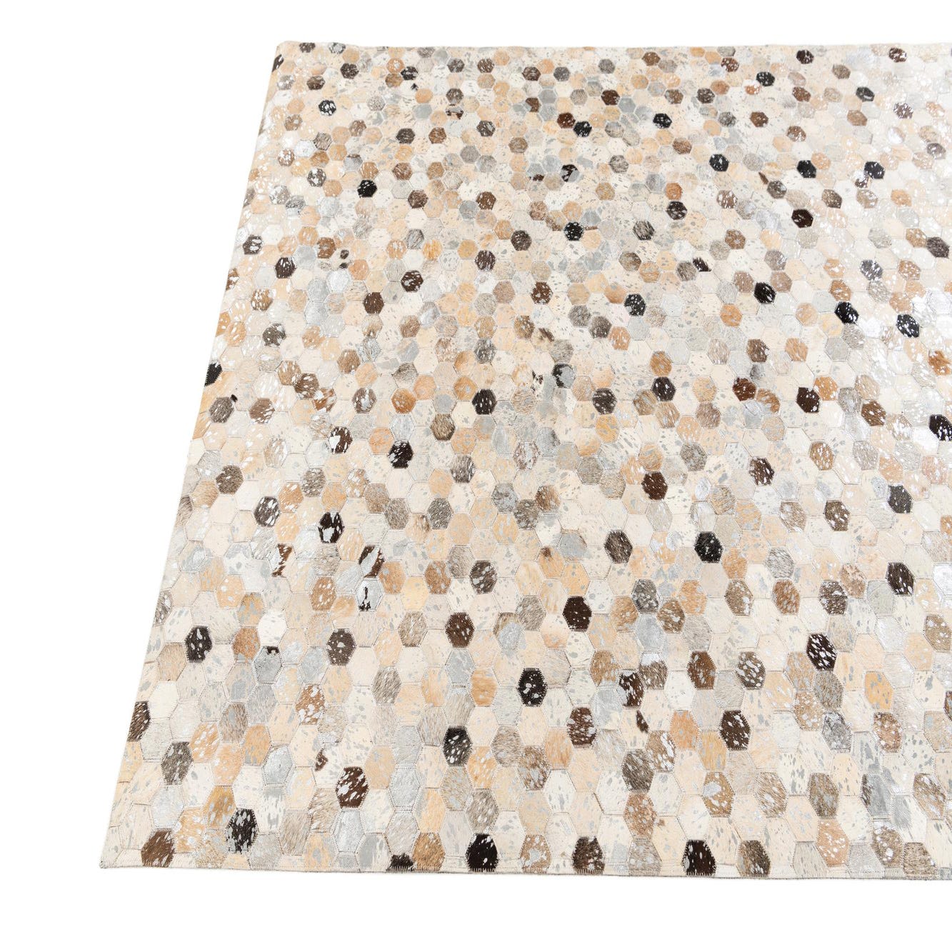 A 5x8 rectangular Cowhide Stocks rug from Rugs.com, featuring a modern multi-colored hexagonal pattern in natural browns, creams, and grays.