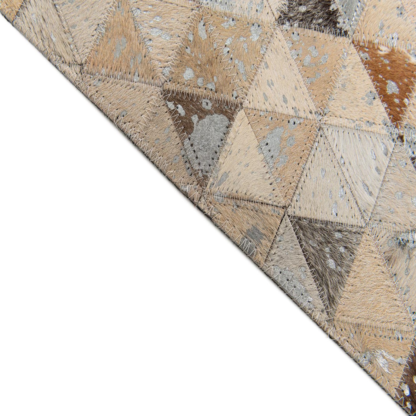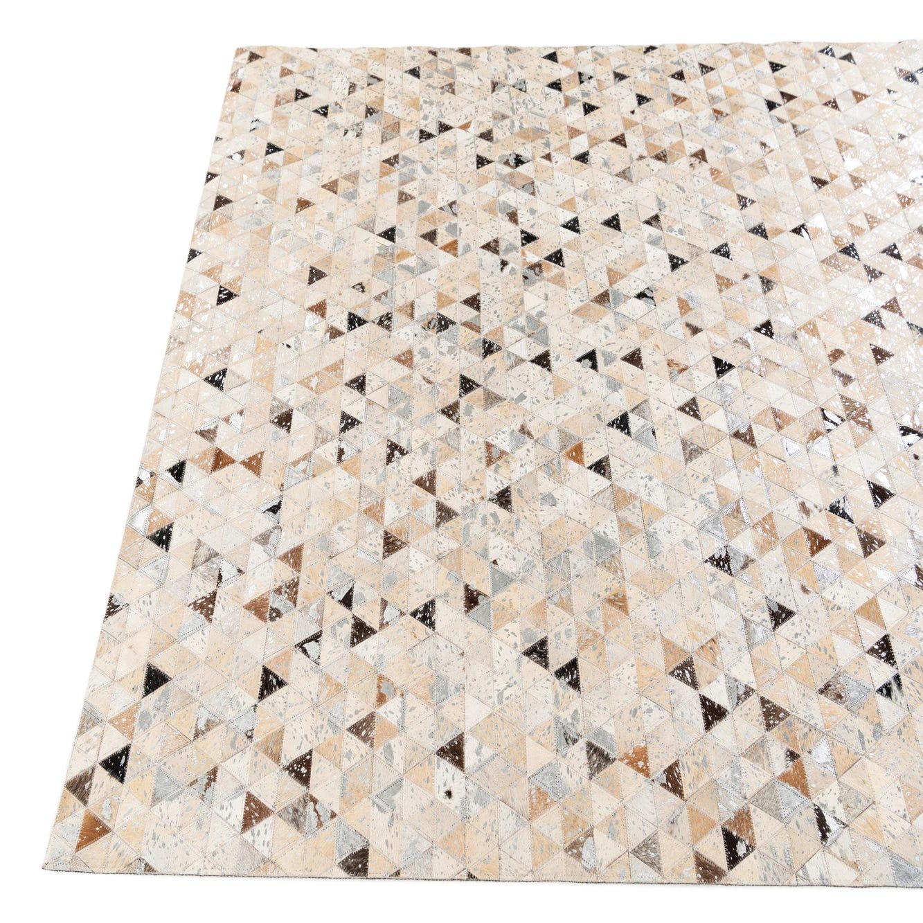 A 5x8 rectangular Cowhide Stocks rug featuring a modern geometric pattern of multi-colored cowhide and leather triangles.